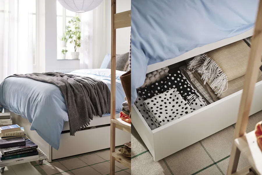 空間再小,都不能犧牲房間的舒適度。這張床看似搶佔整個臥室的主視覺,但線條俐落,美型無死角,一點都不強勢。 VIHALS床框附2件收納盒 ,正職促進好眠,兼差收納管理,備用的枕頭、床單以及「我以後會用到」的物件都能收得乾乾淨淨。再次證明了一張用心的床組可以發揮雙重功能,空出越多空間,就越讓人感到舒適。