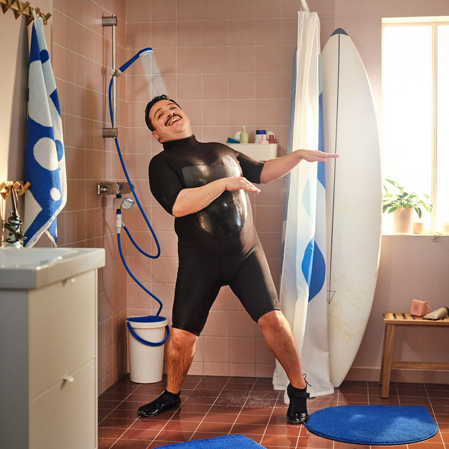 使用 BERGVATTNET 分流器,在淋浴時先把冷水導入水桶,等到水變熱後,分流器會自動切換成蓮蓬頭出水;不影響淋浴,同時還能輕鬆收集原本會直接流掉的冷水,可以用來沖馬桶、澆花或打掃,方便又環保。