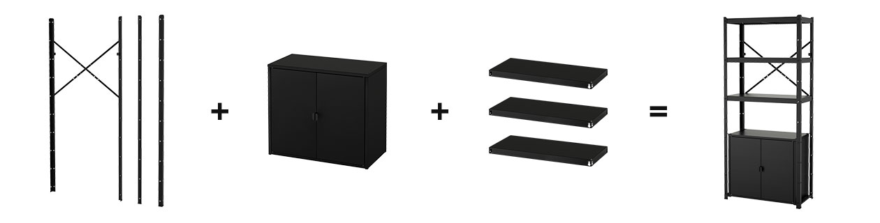 使用立柱,1組層板及雙層櫃,便可組出附櫃層架組。
