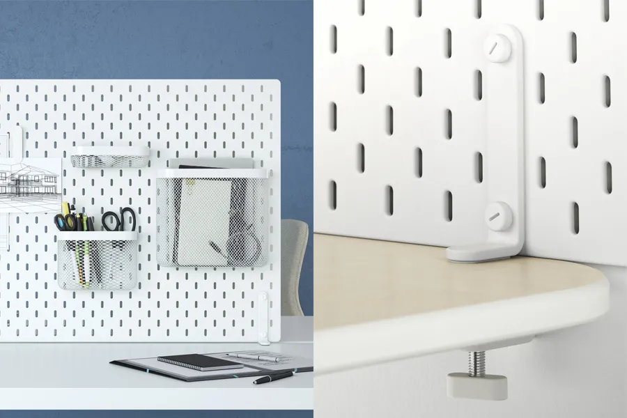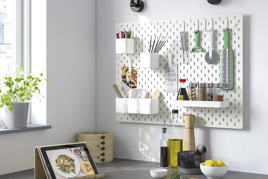 能靈活更動、排列的多功能 SKÅDIS 洞洞板,輕鬆符合每一次的不同需求。添加和組合收納盒、層架、信件匣或彈性掛帶,讓物品收得整齊清楚。適用各種空間,無論廚房、玄關、書房或浴室,都能讓小配件便利拿取使用。