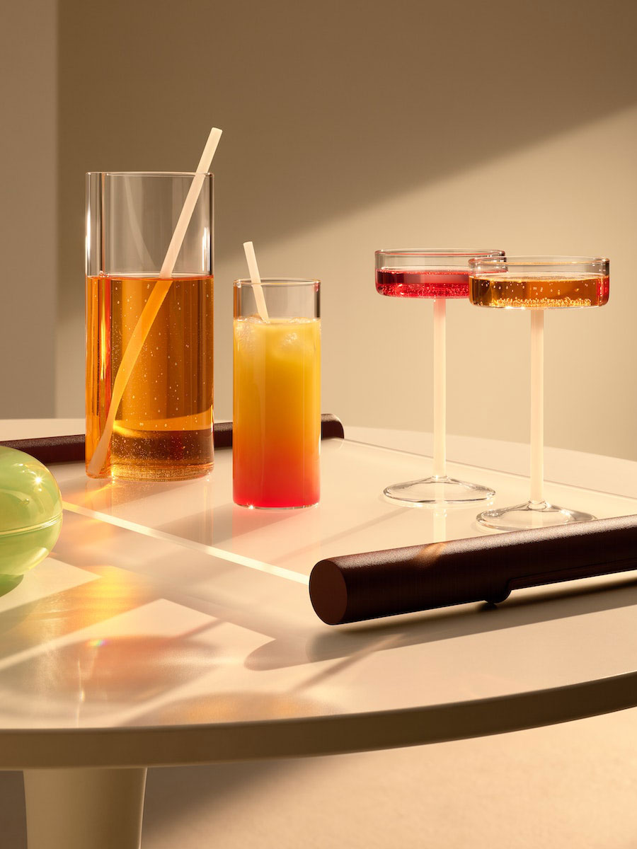 系列包含這套典雅的玻璃雞尾酒套裝,包括附金屬把手的托盤、玻璃水瓶、香檳杯、玻璃杯和攪拌棒。酒具在燈光下反射出夢幻的光芒。