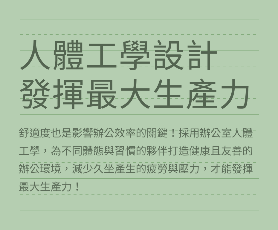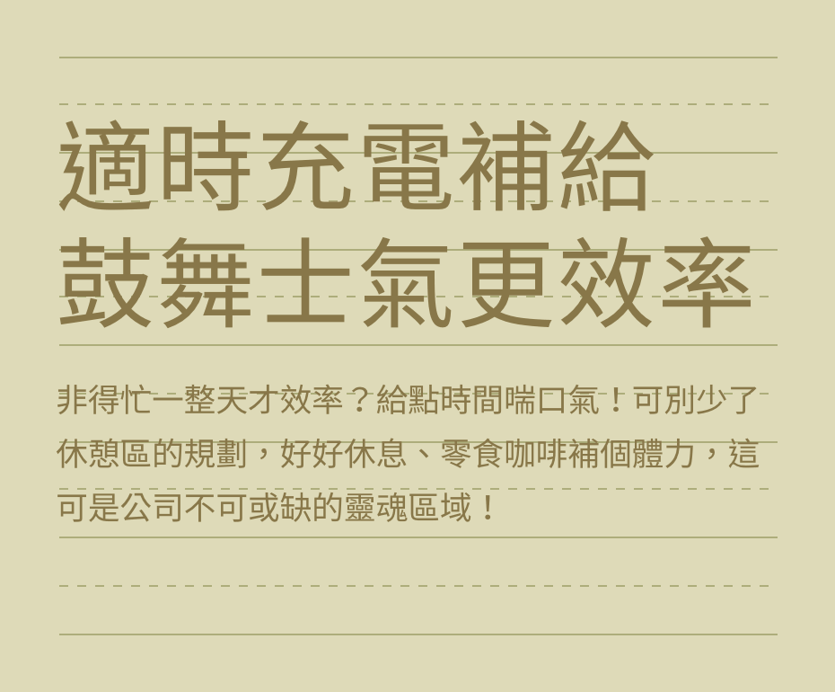 打造舒服健康的工作環境,再搭配貼心的休息區與補給,