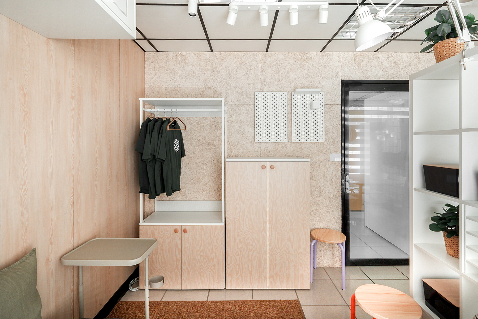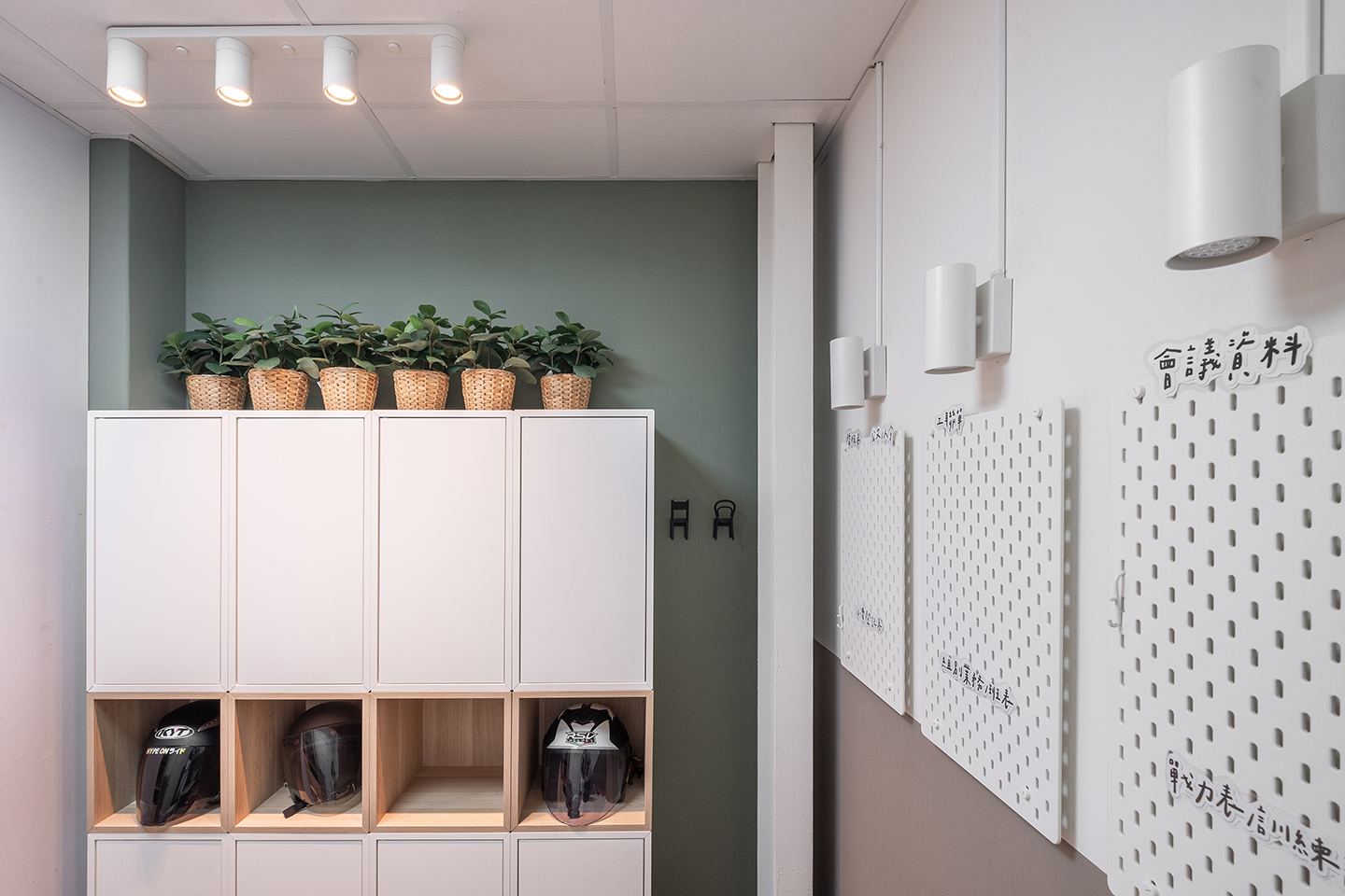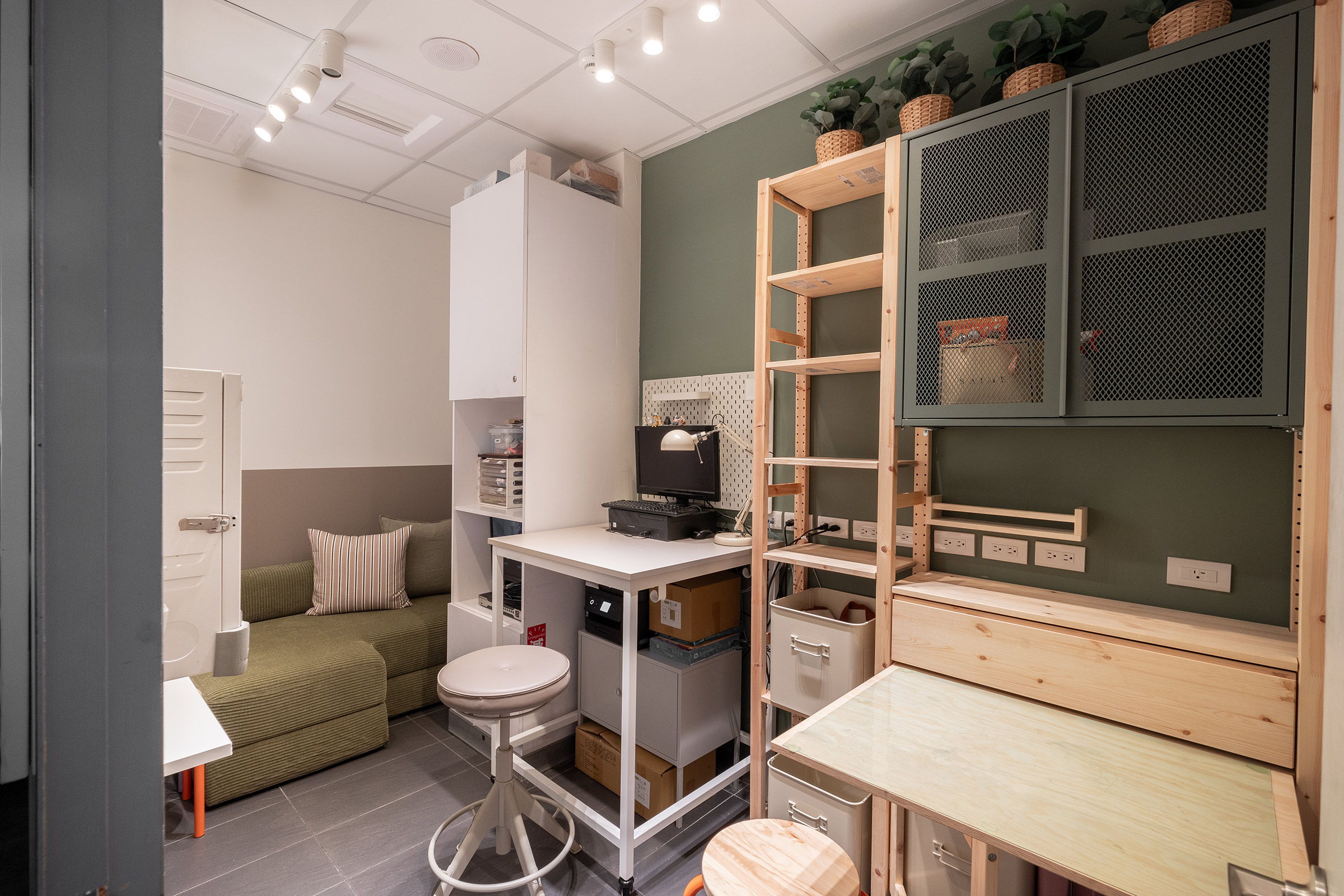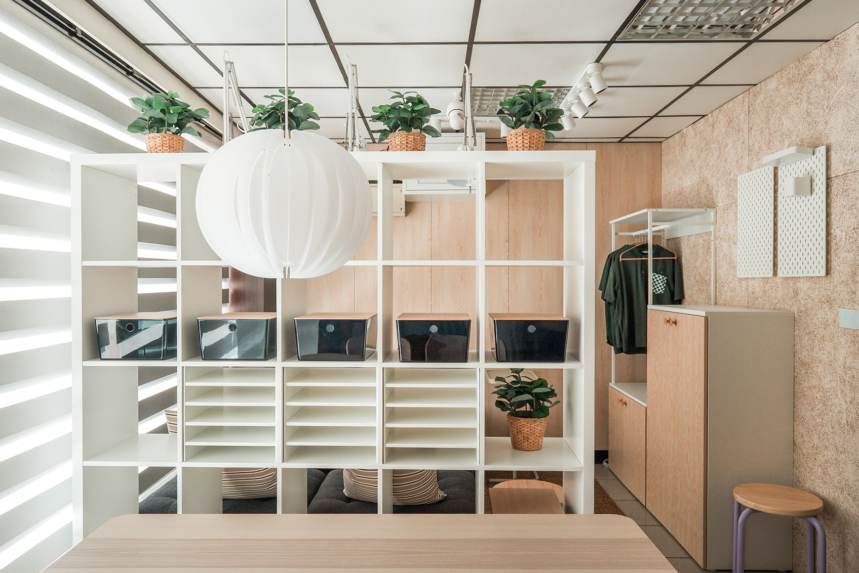 IKEA企業業務與石二鍋攜手合作,將三間員工休息室打造為兼具多功能與美感的舒適休憩區。由於空間有限,仍需要滿足休息、用餐、辦公和收納的需求,因此需充分利用空間並符合「舒心豐盈」理念。 「舒心」體現於低飽和度的色彩,搭配點綴式的撞色,營造出溫和且不失趣味的視覺效果。「豐盈」則表現在有限的空間內,規劃出兼顧辦公、休憩及收納的功能,包涵將收納空間垂直向上延伸,選擇具有高度彈性的家具,如附帶摺疊桌的收納櫃及牆面洞洞板,讓空間使用最大化。 這次改造在有限的空間內實現了多功能需求。期望石二鍋的員工可以在這個新的空間盡情放鬆。