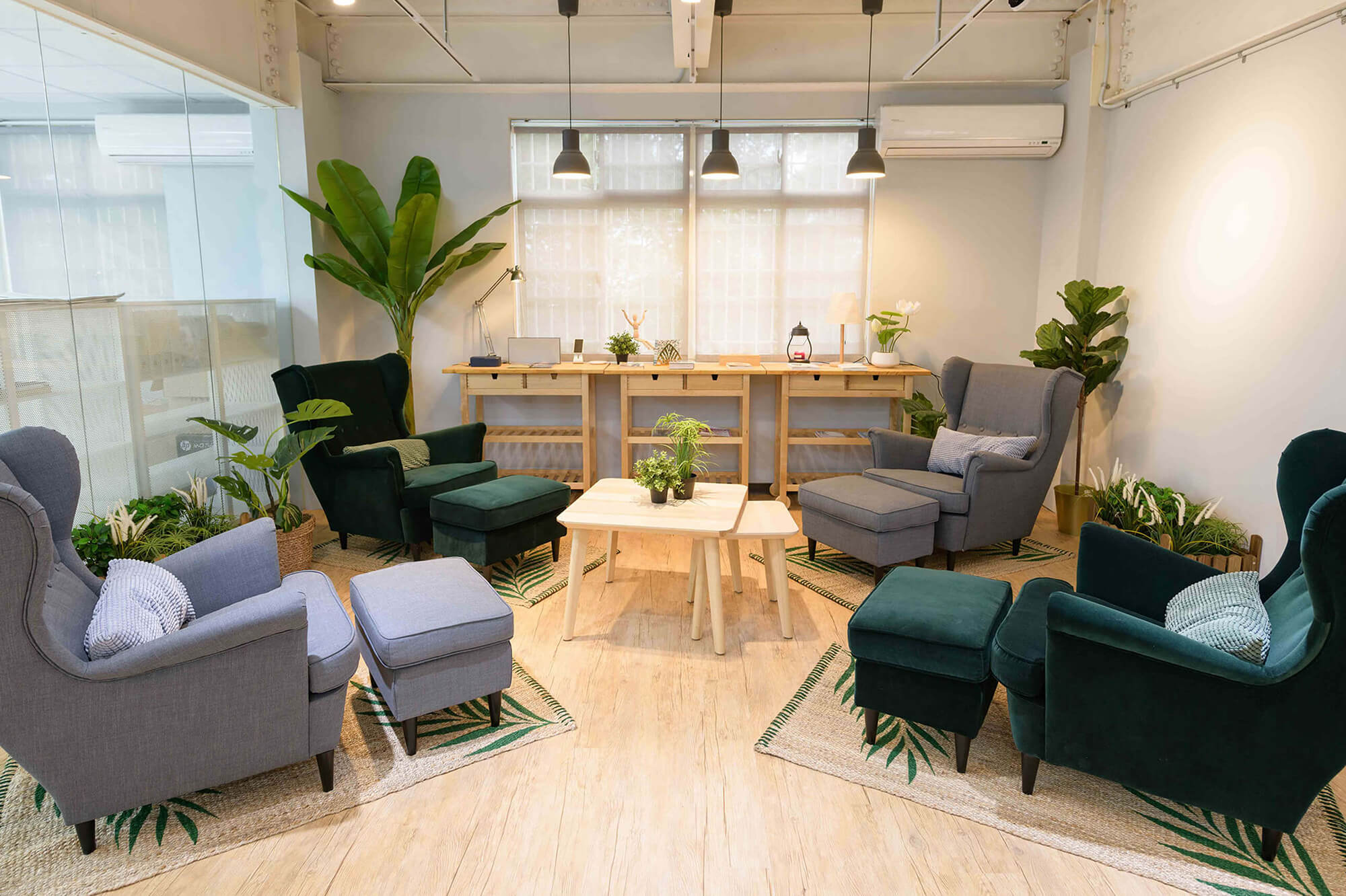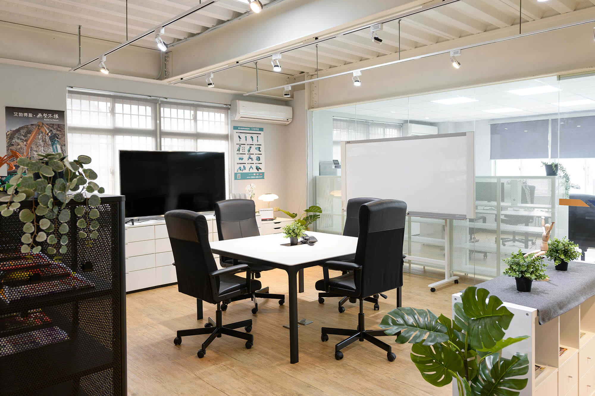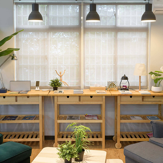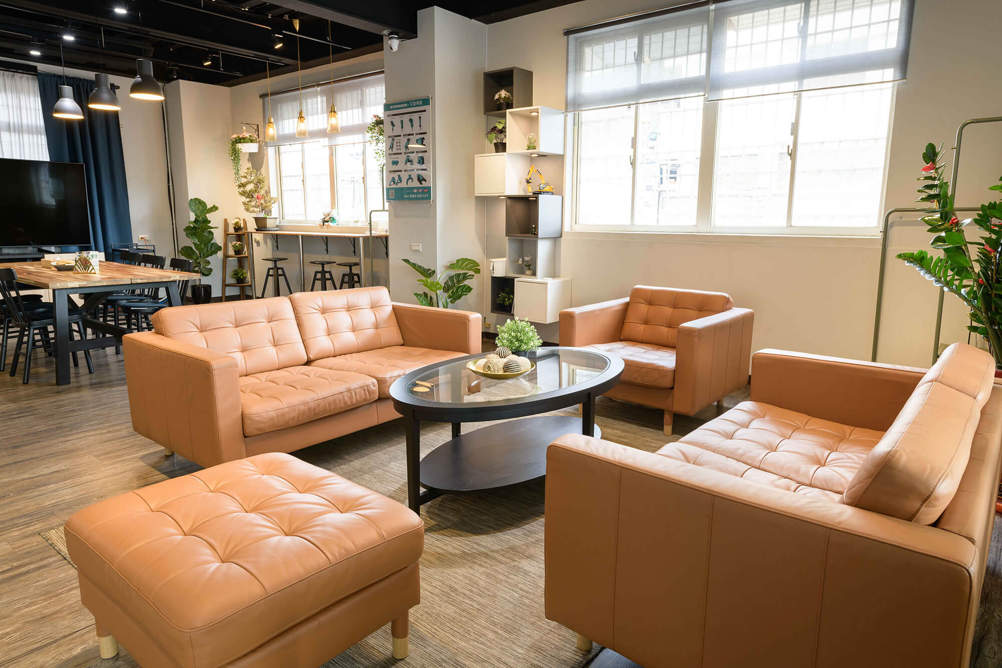 業主希望給每個來訪的客人營造一個輕鬆舒適的環境,更提供一個安靜不受打擾的會議室。業主也特別規劃開放式的用餐空間,甚至兼具工作及茶水間的功能,讓員工能在這開放的空間中得到更多情感上的交流及休息,這樣多功能的空間無論做何種的活動都會非常的有彈性及合適。