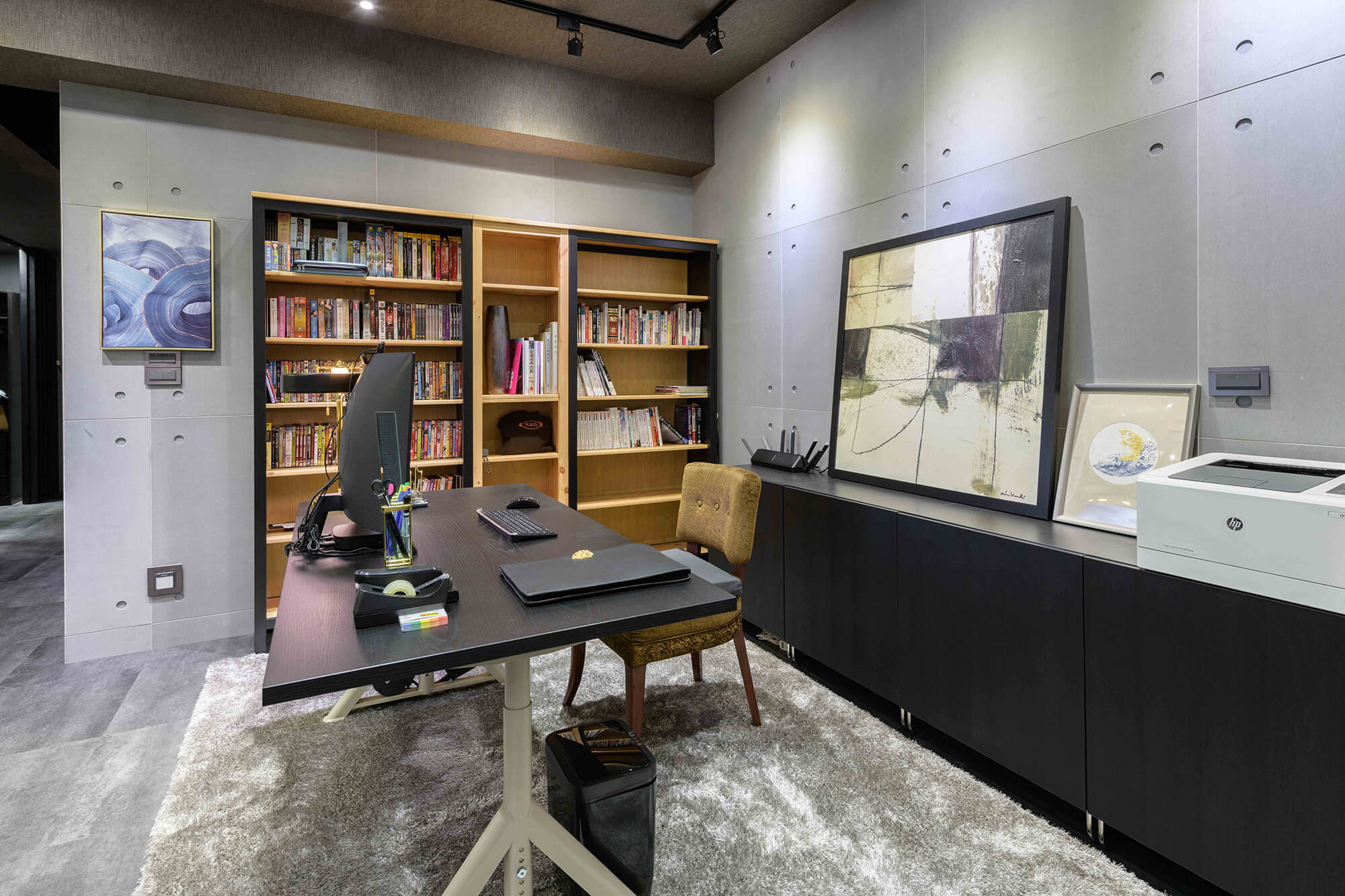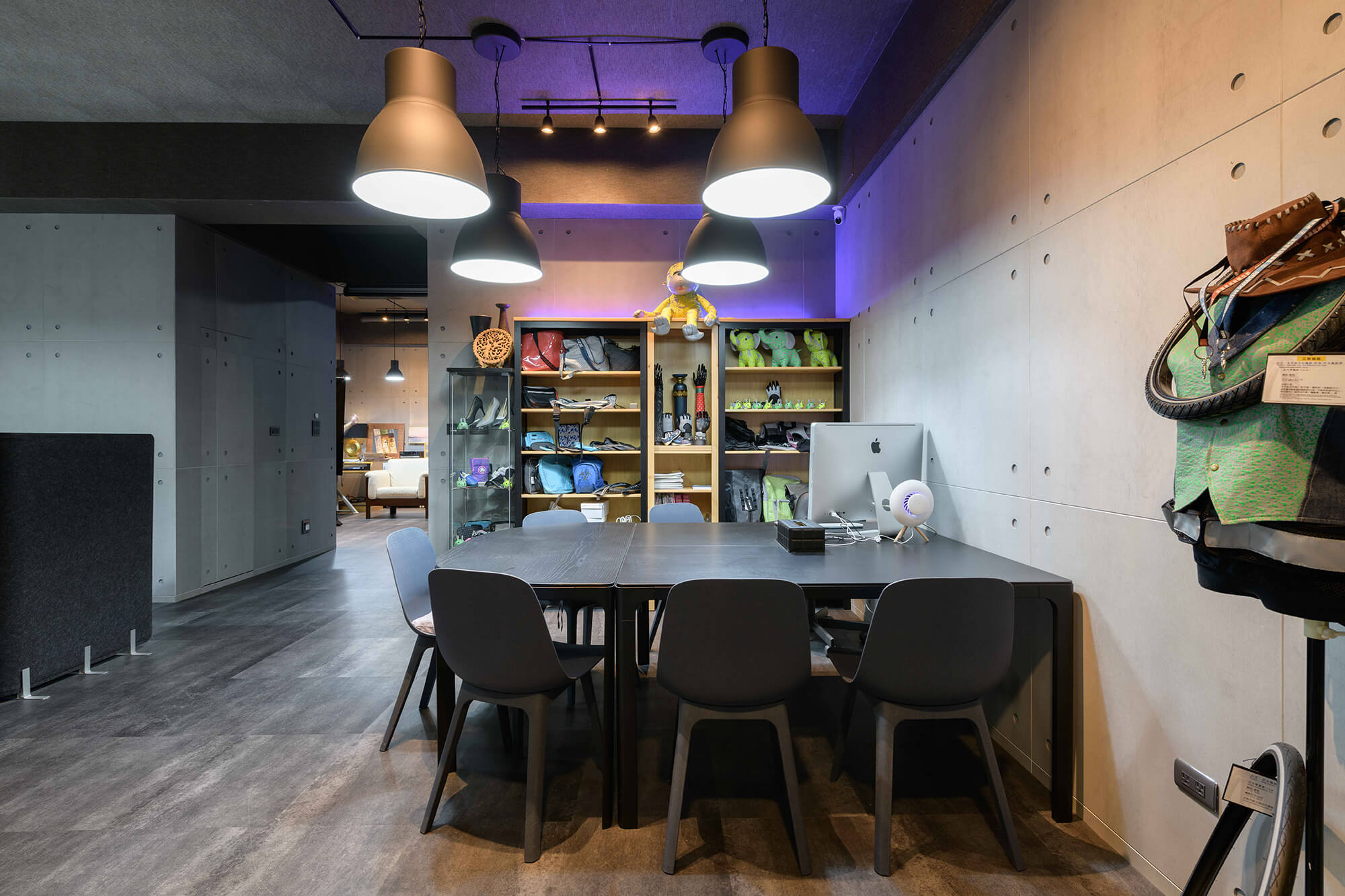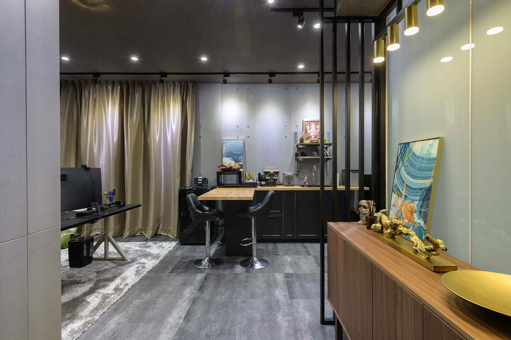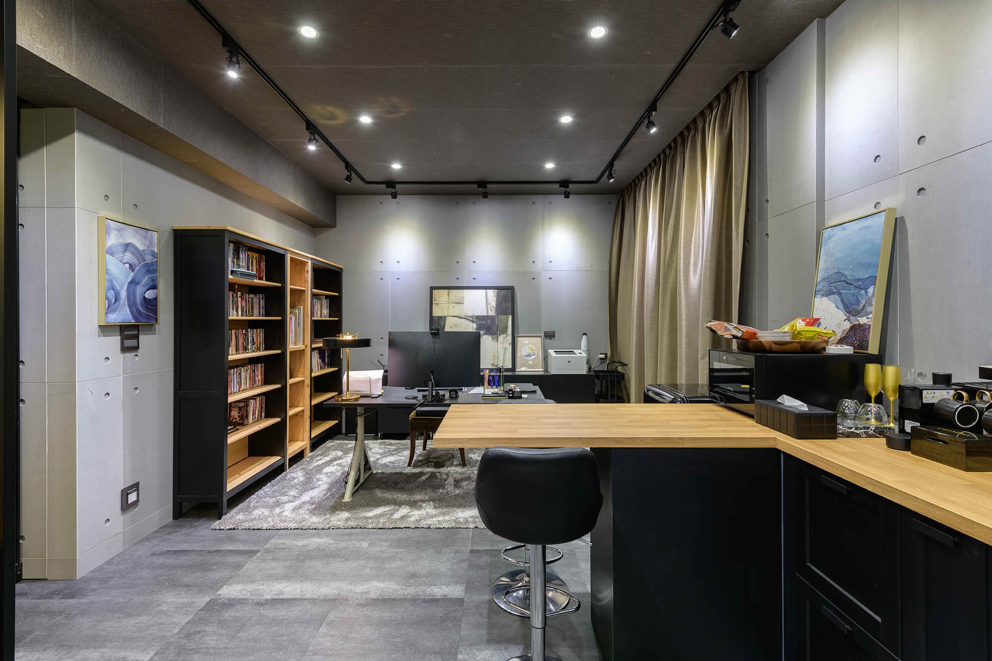 住辦合一 一樓為辦公室使用,二樓為私人房間(偏向招待所),以強烈工業風為主題,前面全採用清水模板,搭配我們大量黑,灰以及實木商品呈現工業現代的感覺。
