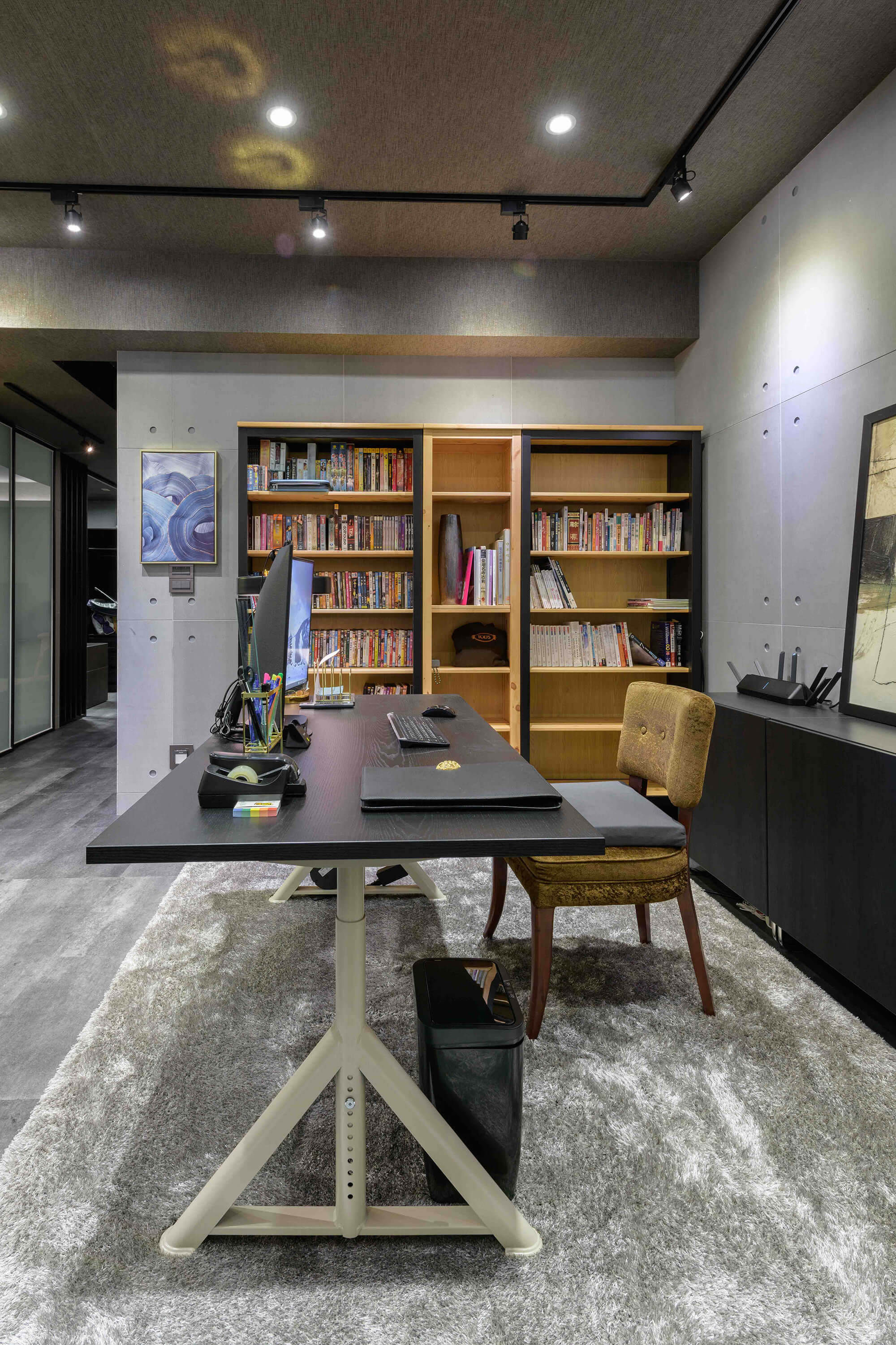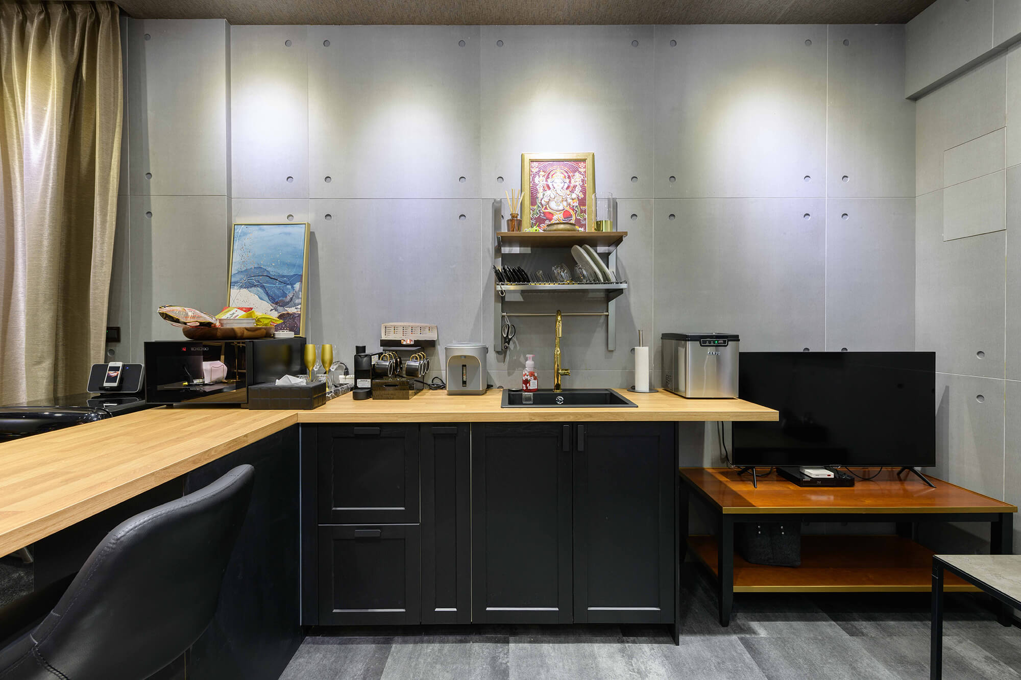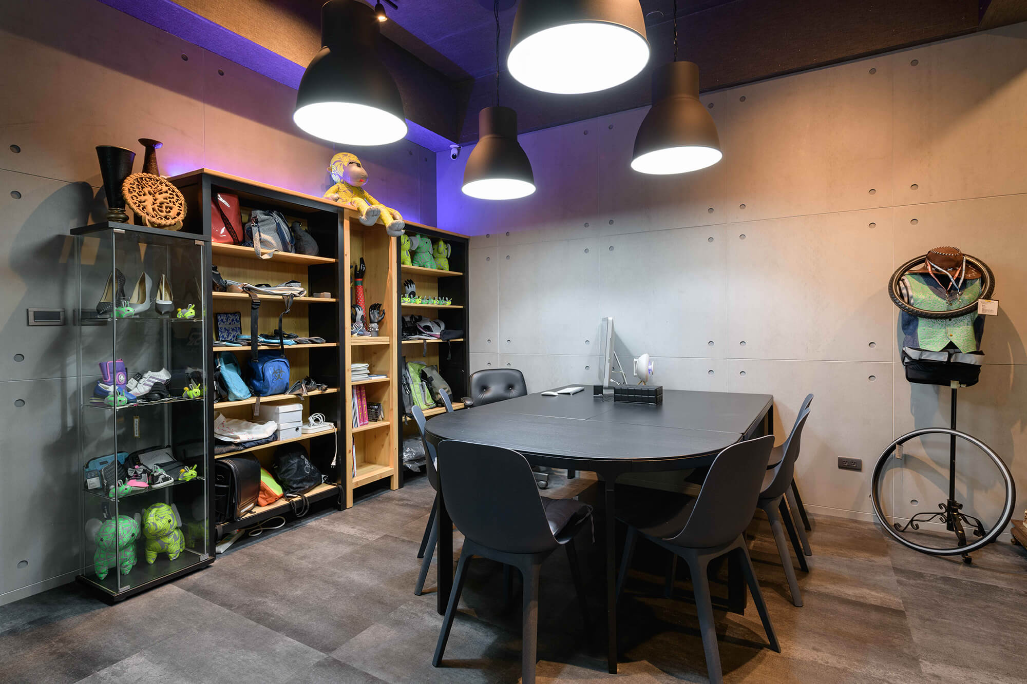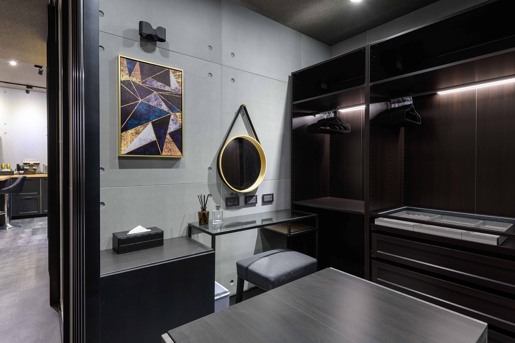 住辦合一 一樓為辦公室使用,二樓為私人房間(偏向招待所),以強烈工業風為主題,前面全採用清水模板,搭配我們大量黑,灰以及實木商品呈現工業現代的感覺。