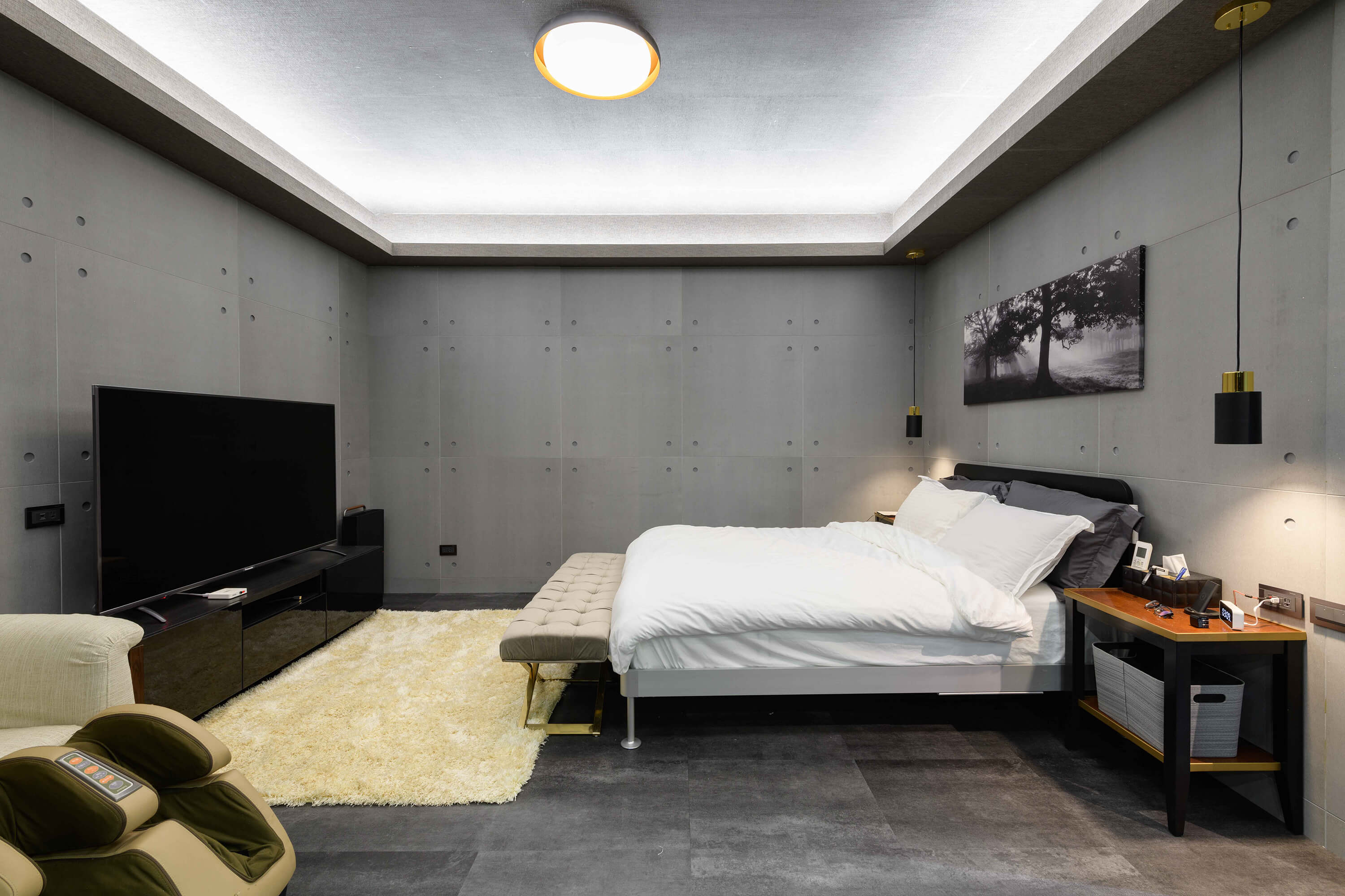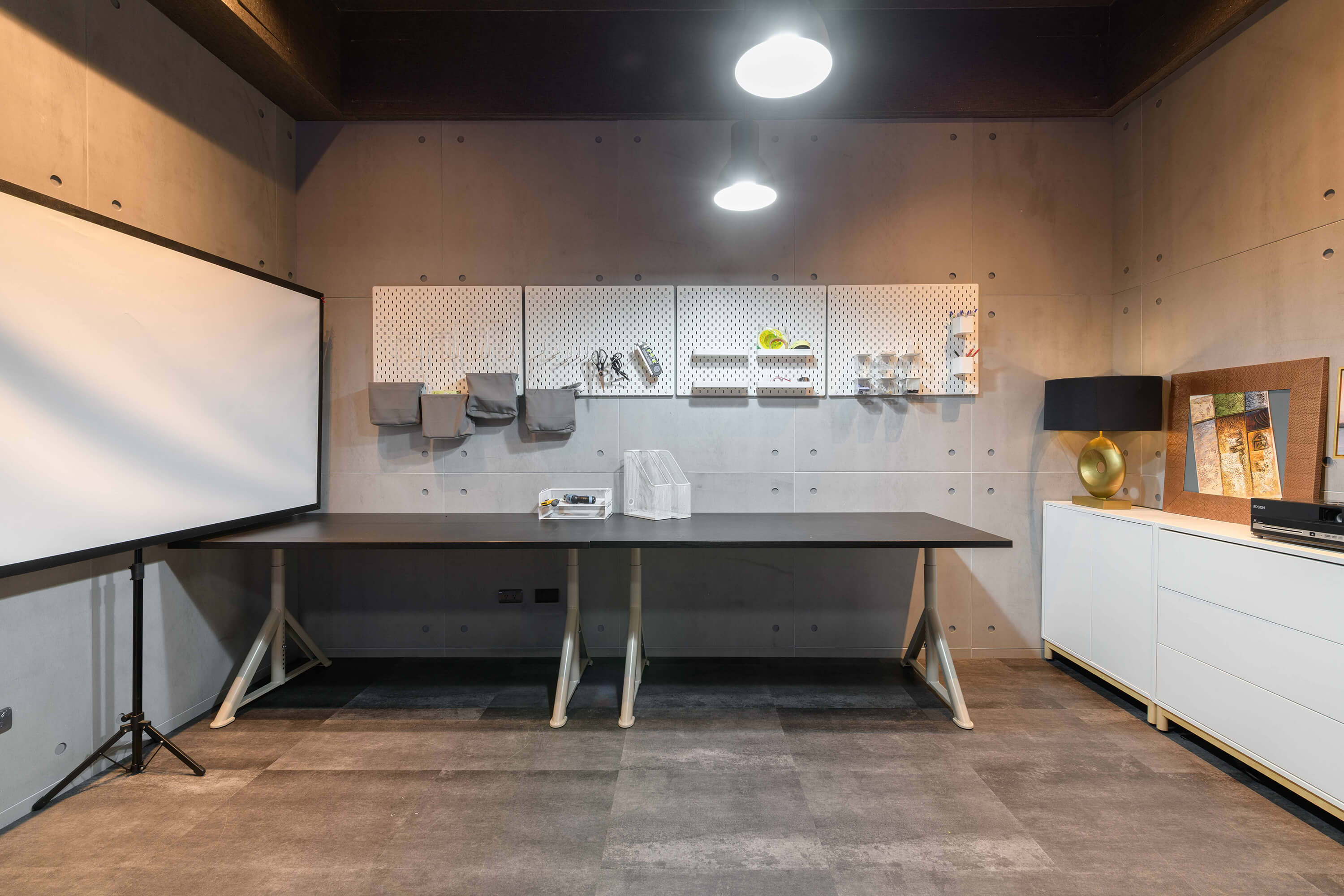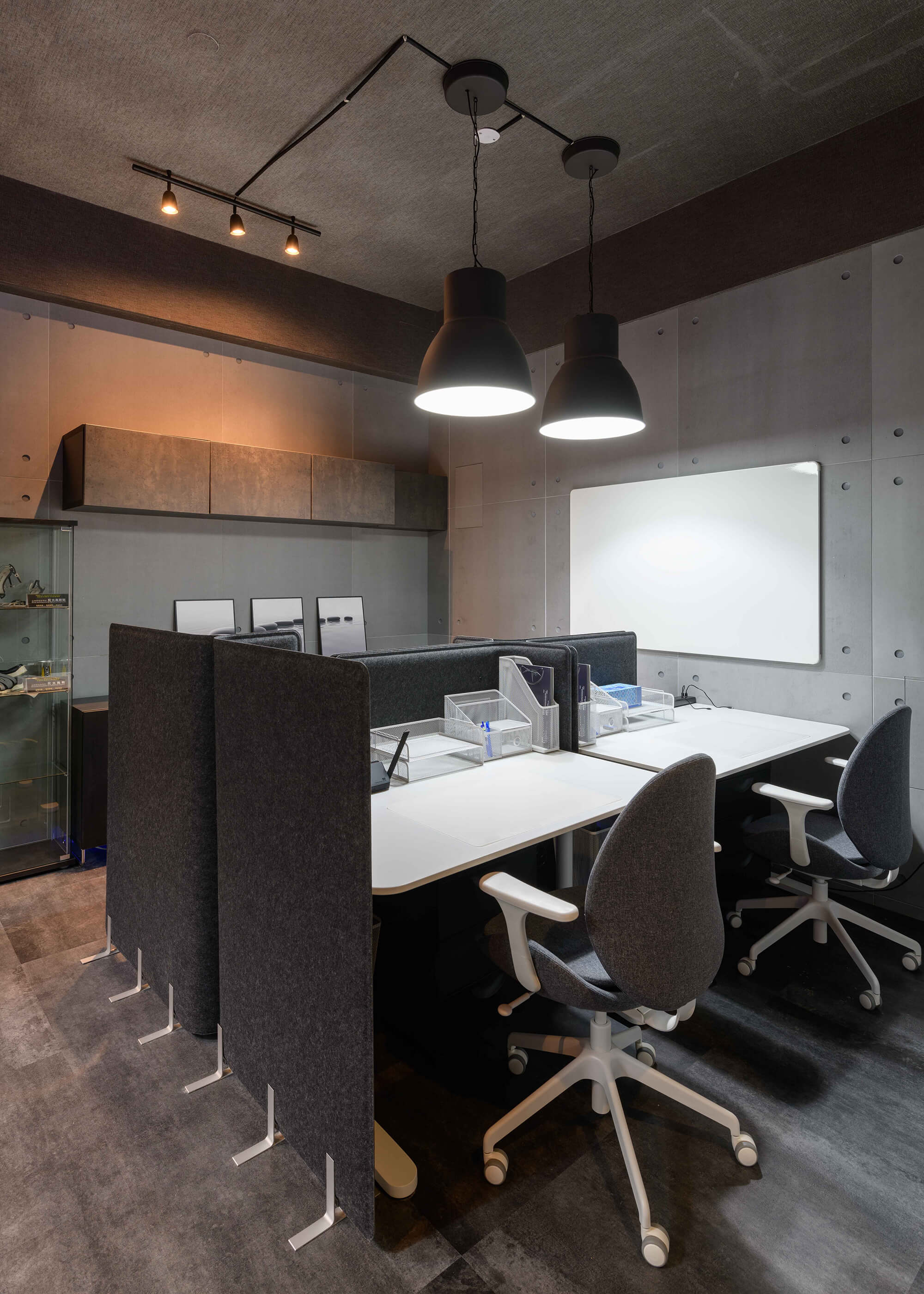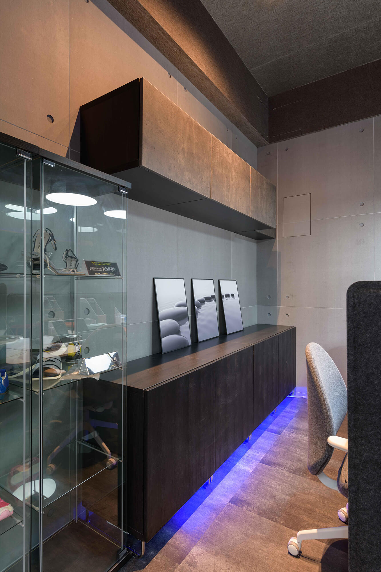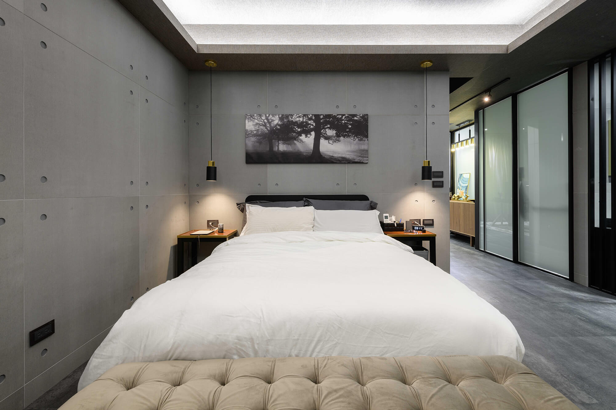 住辦合一 一樓為辦公室使用,二樓為私人房間(偏向招待所),以強烈工業風為主題,前面全採用清水模板,搭配我們大量黑,灰以及實木商品呈現工業現代的感覺。