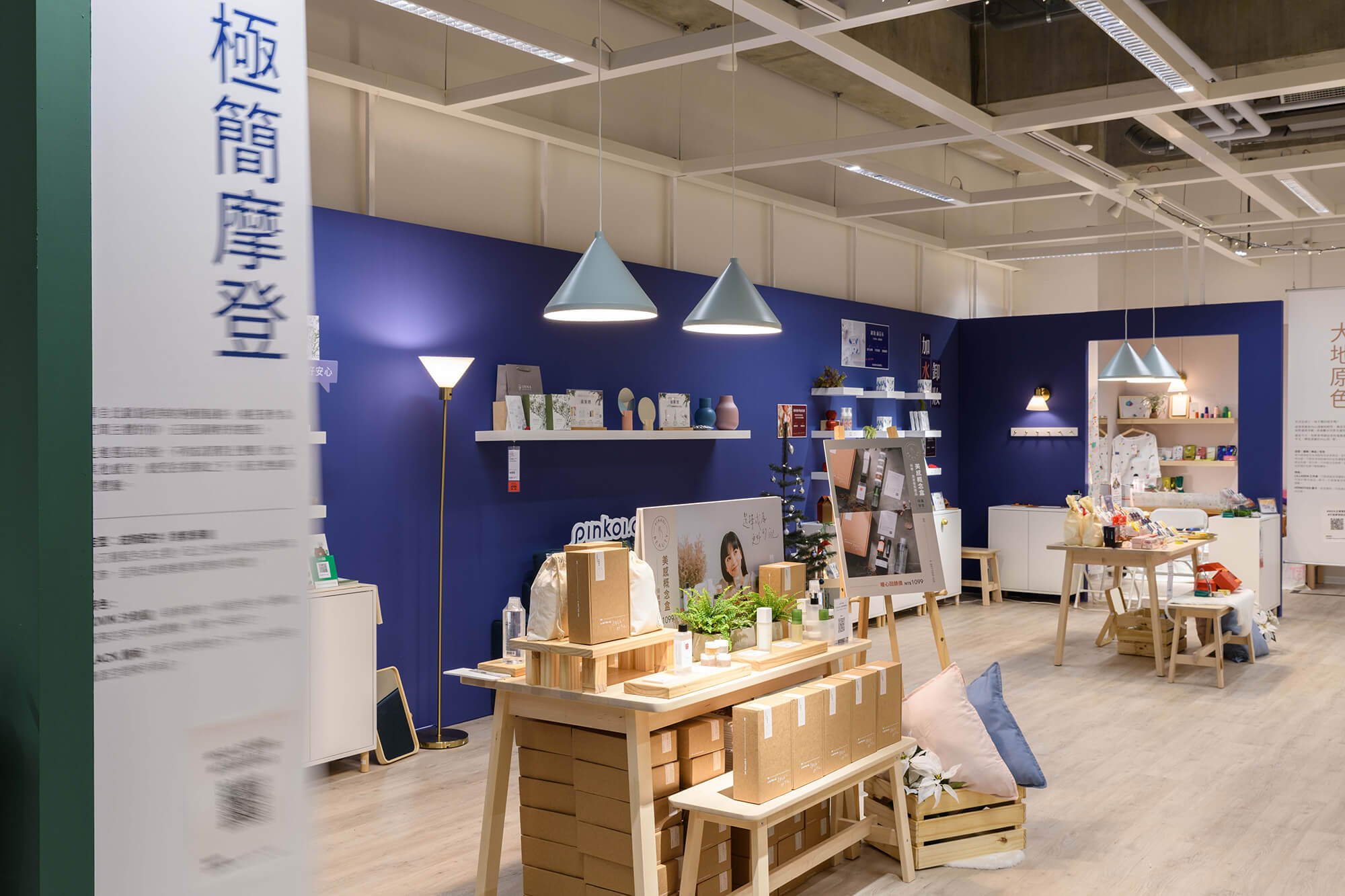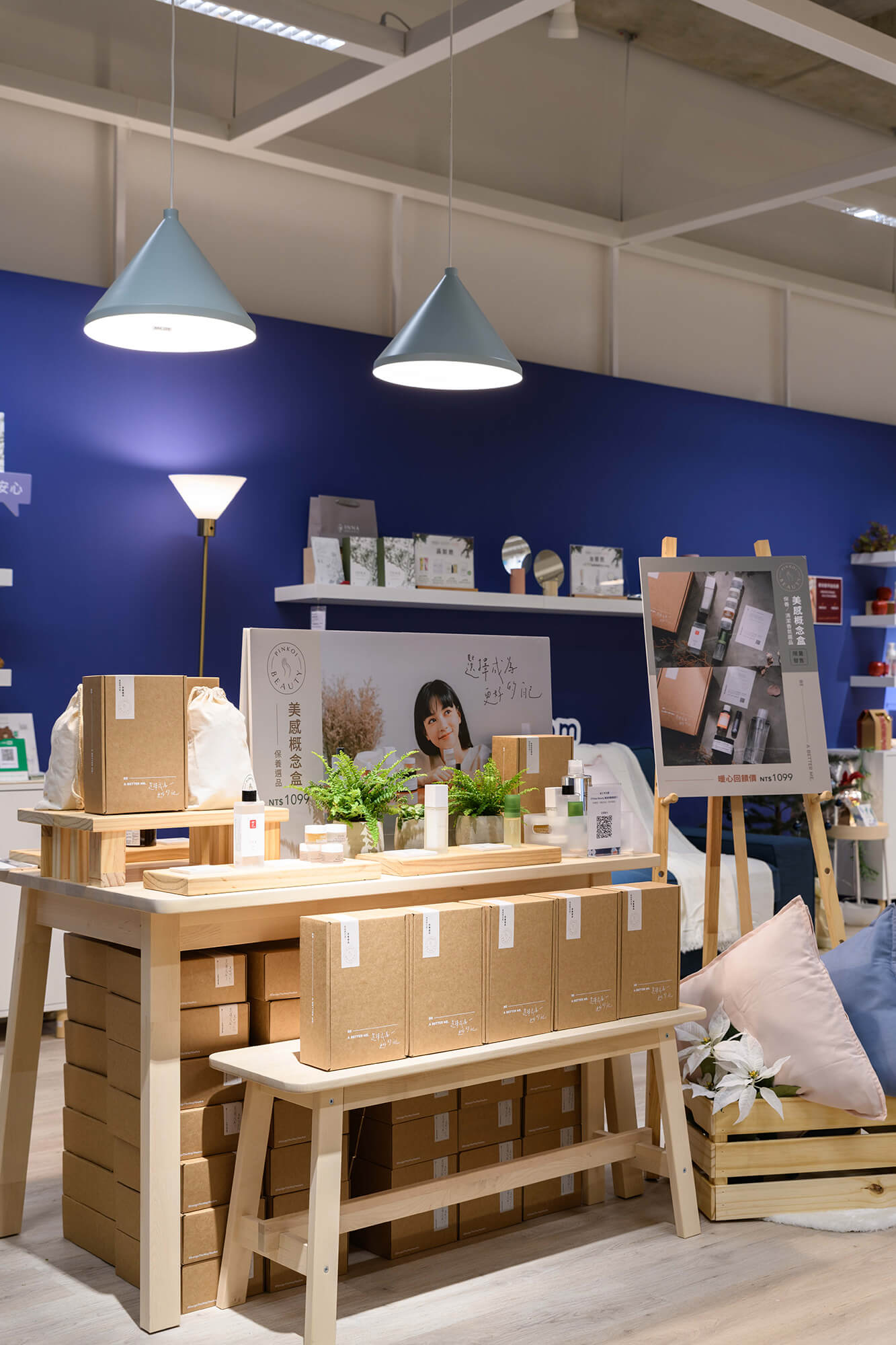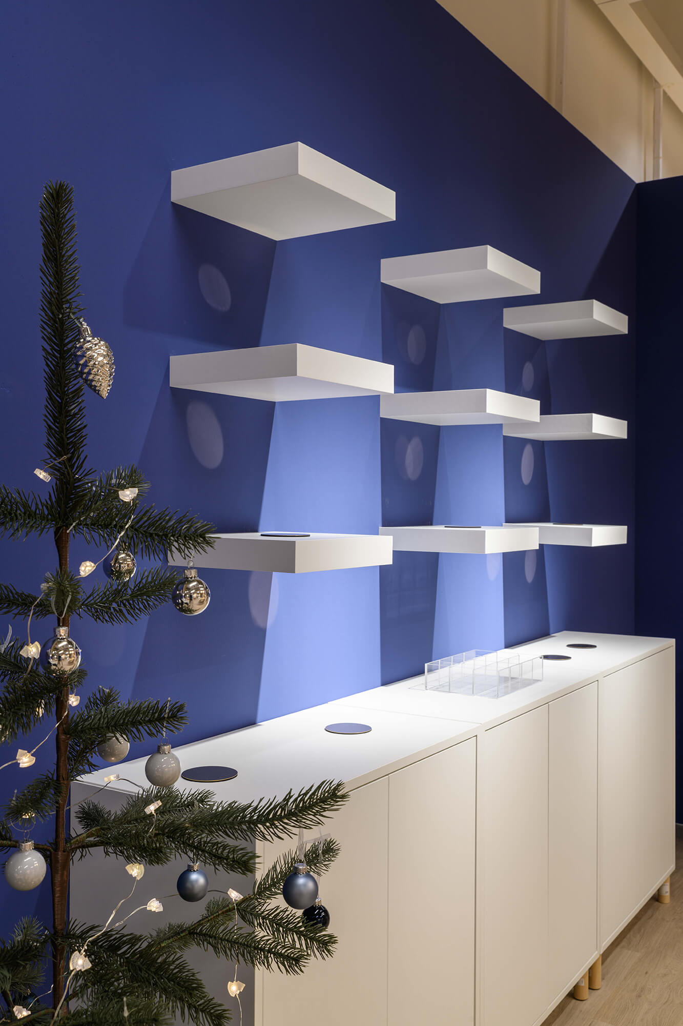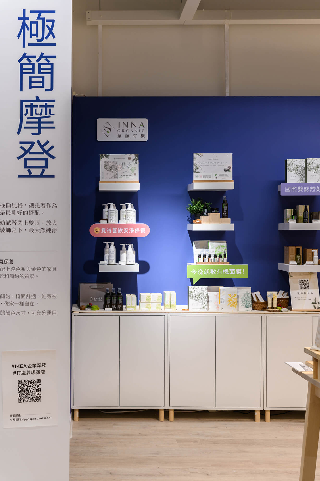強烈且飽和的深藍色調搭上點綴式銅金燈具提亮奢雅細節,從大膽的飽和色調轉換成舒適沉穩的購物環境,純白短層架將商品區隔出來,除了能強調商品特色也讓視覺更獨立,營造出現代摩登感的氛圍並襯托出香水和保養品的高雅品質。