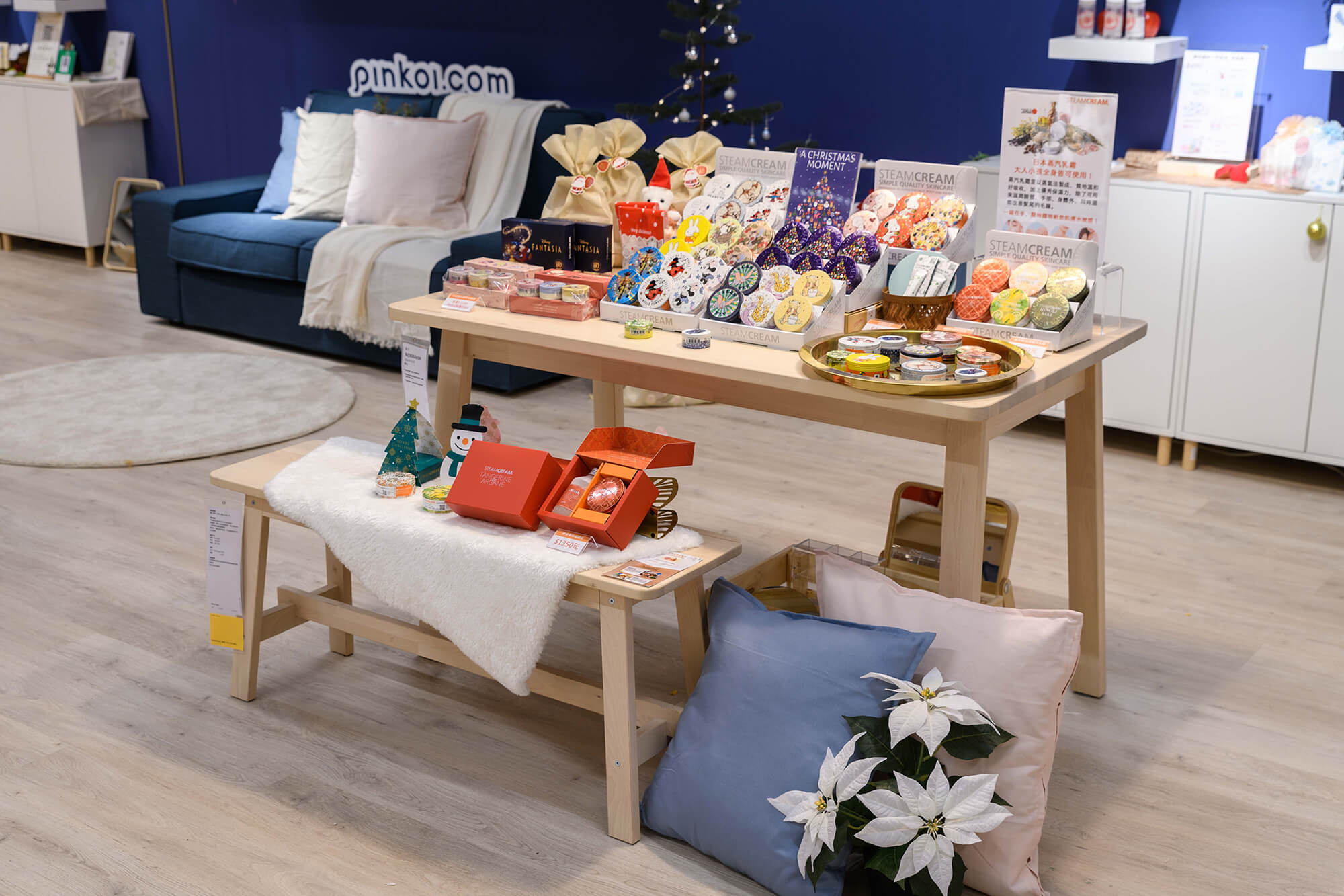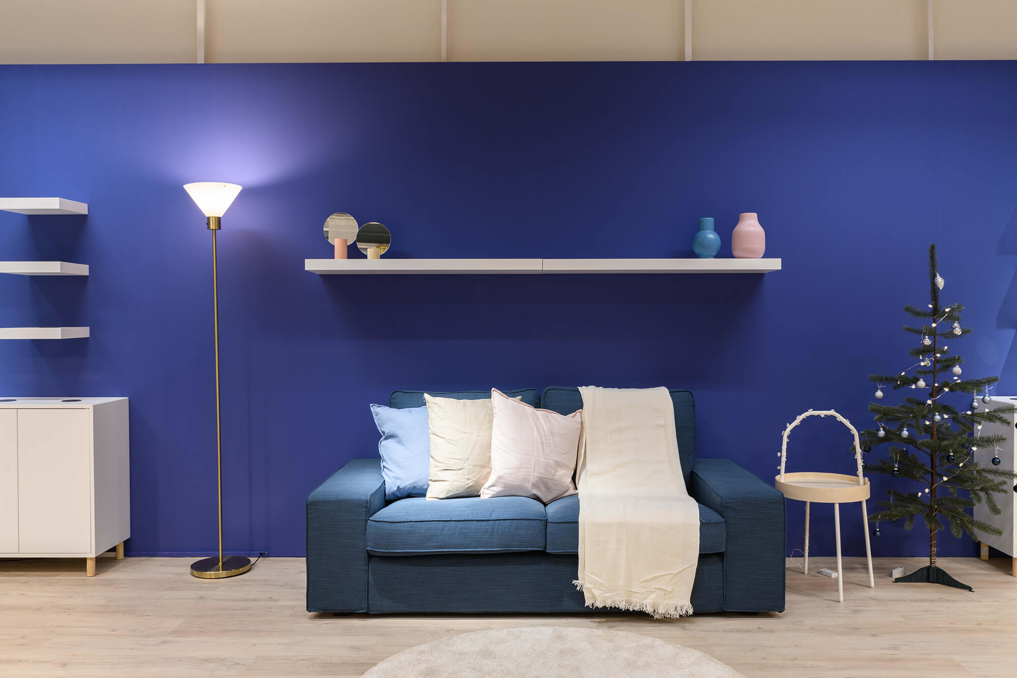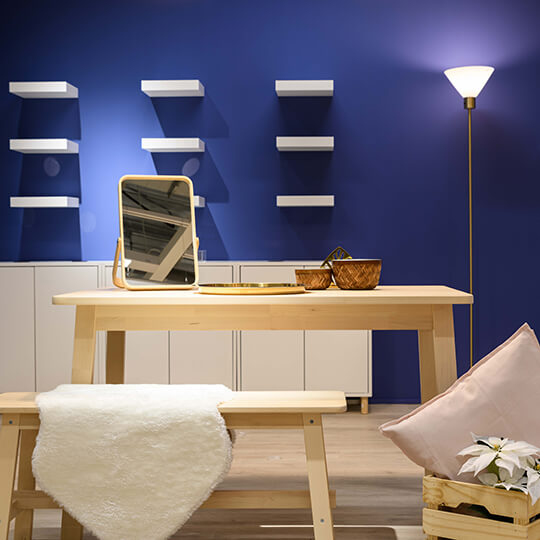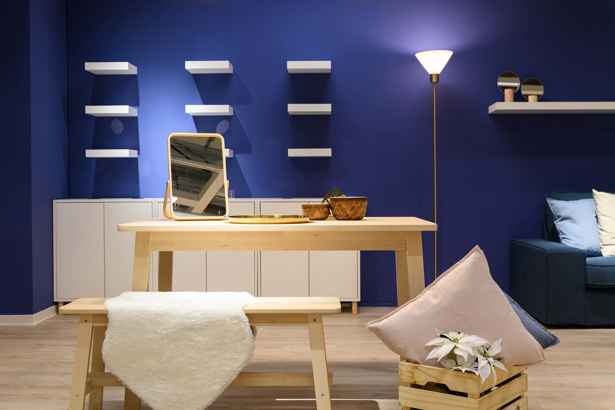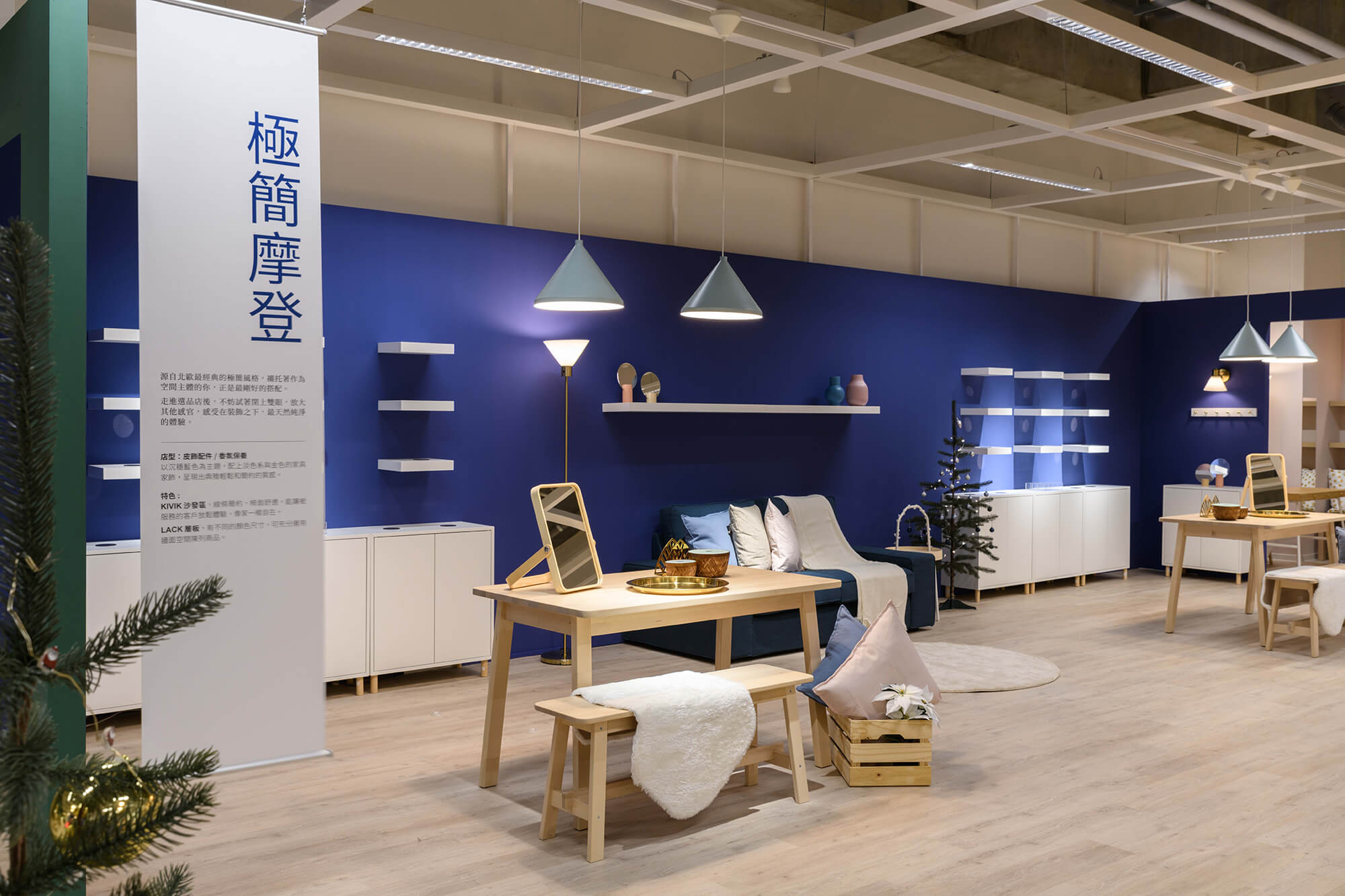 強烈且飽和的深藍色調搭上點綴式銅金燈具提亮奢雅細節,從大膽的飽和色調轉換成舒適沉穩的購物環境,純白短層架將商品區隔出來,除了能強調商品特色也讓視覺更獨立,營造出現代摩登感的氛圍並襯托出香水和保養品的高雅品質。