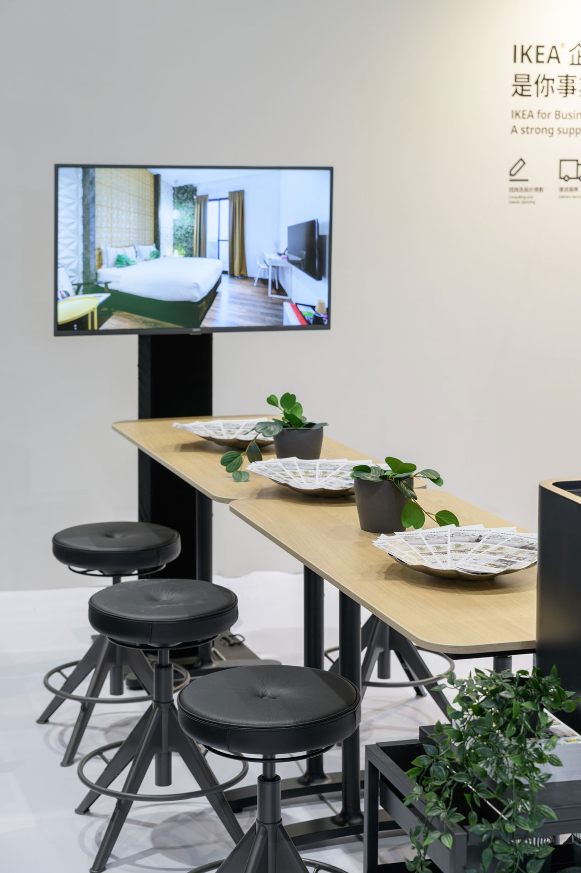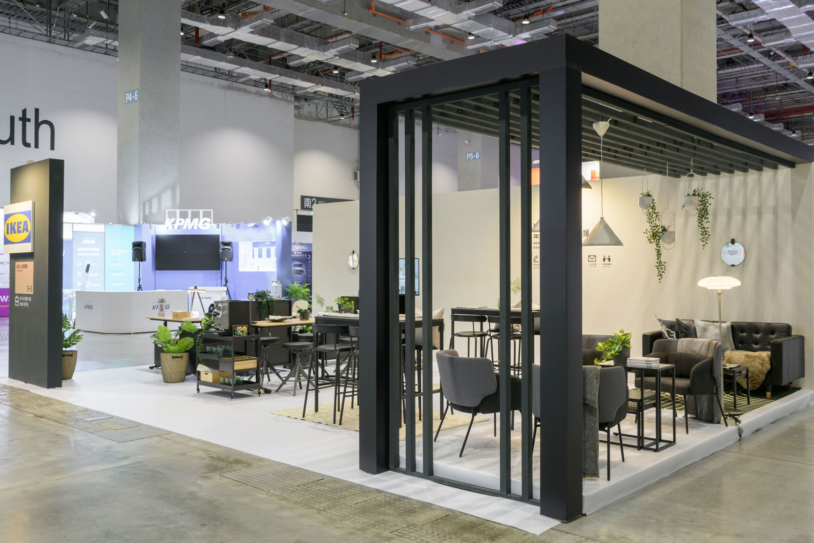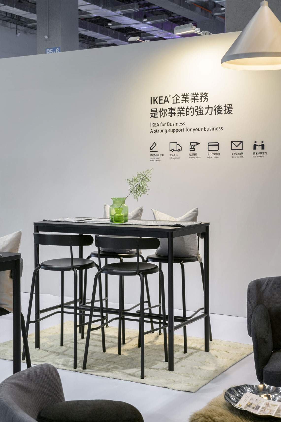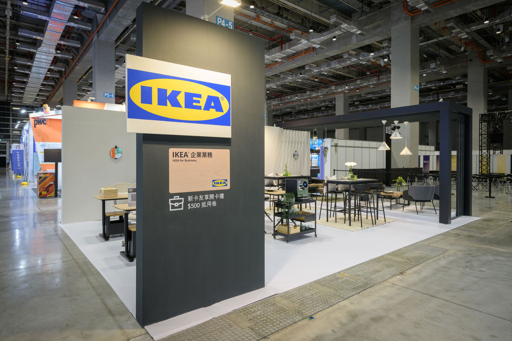 以IKEA for Business 品牌精神發想,以簡單俐落的黑、白色當作基底,襯托出IKEA 高單價商用產品的質地。整體空間區域分為辦公區、會議討論區以及VIP休憩區,與現場其他單位的高彩度佈置形成反差,選擇極簡的呈現手法,讓整體展區更加突出吸睛。
