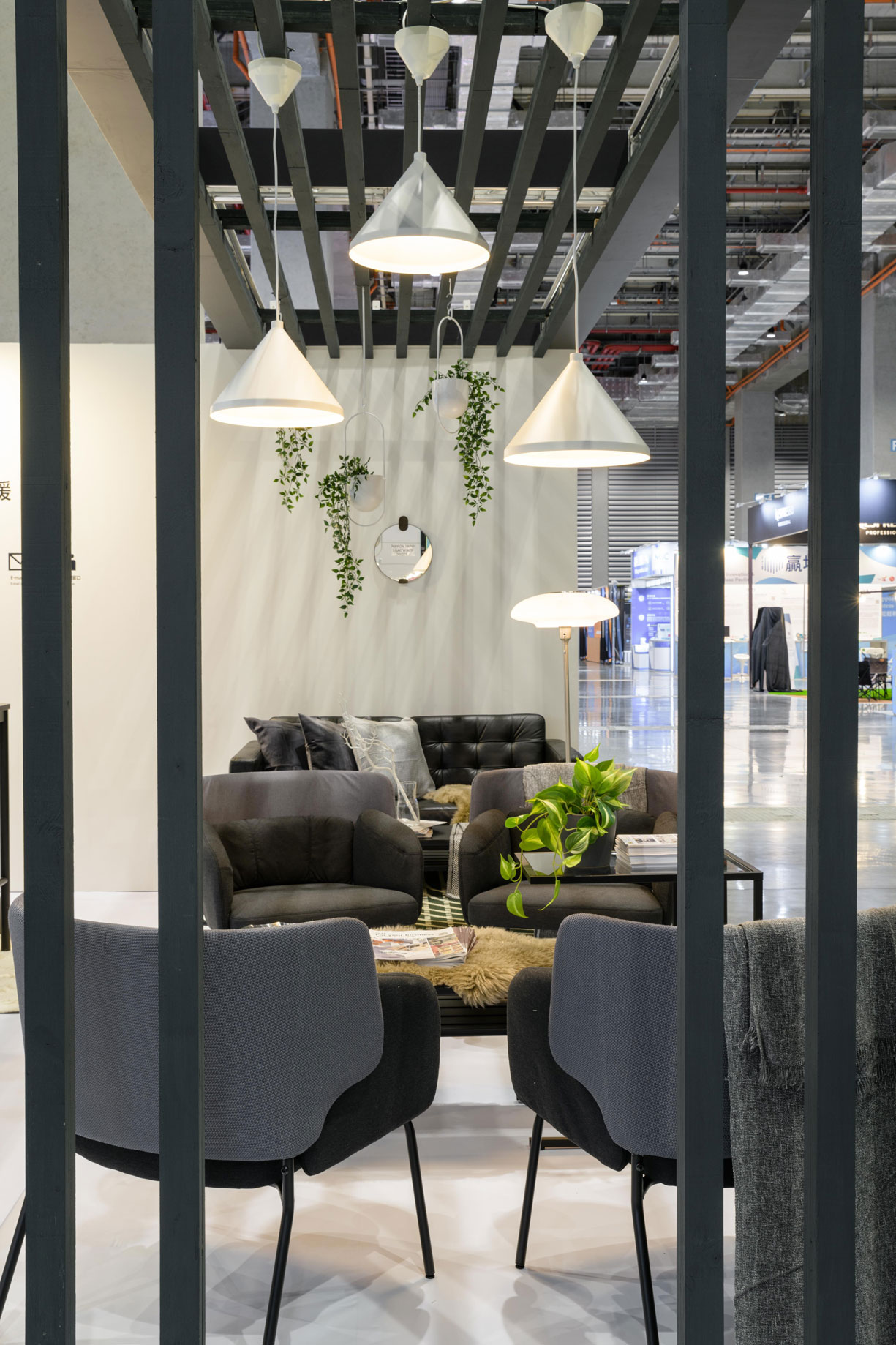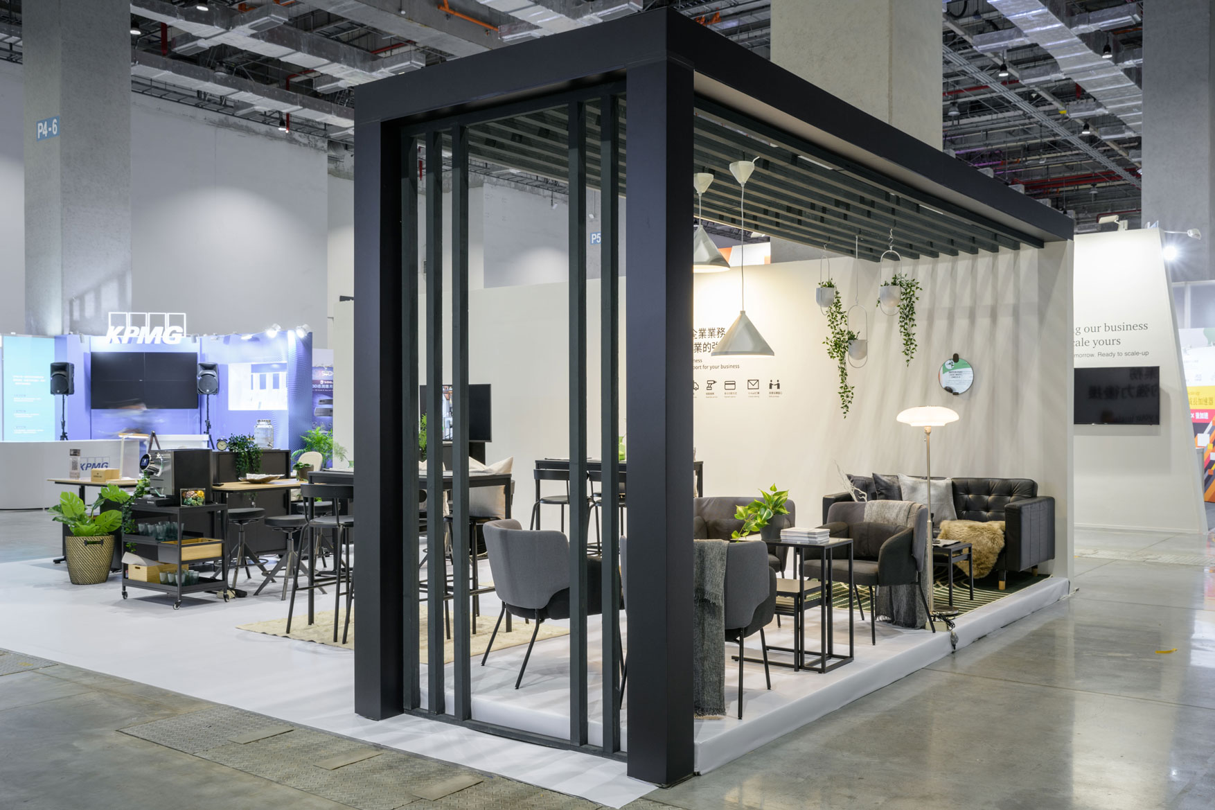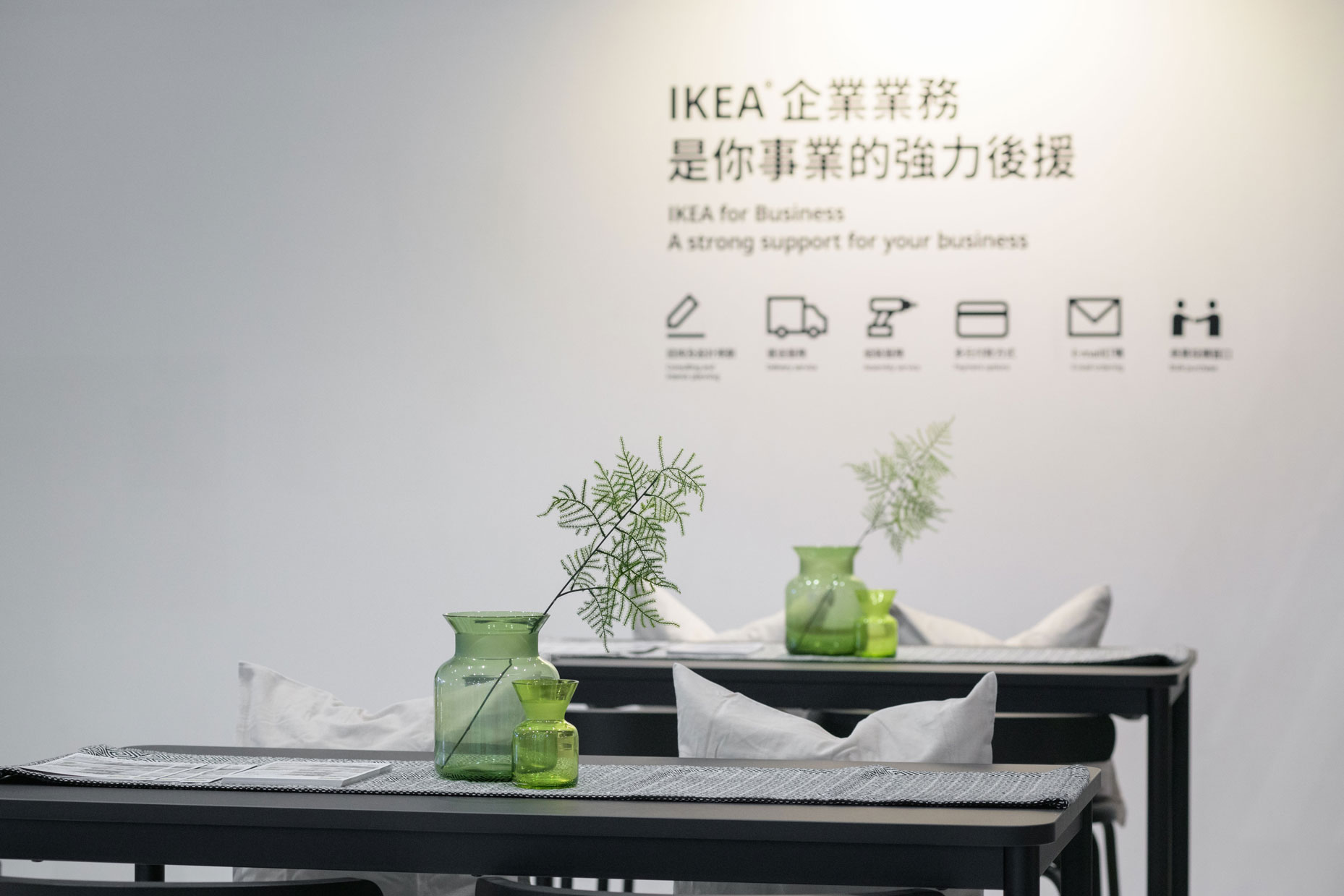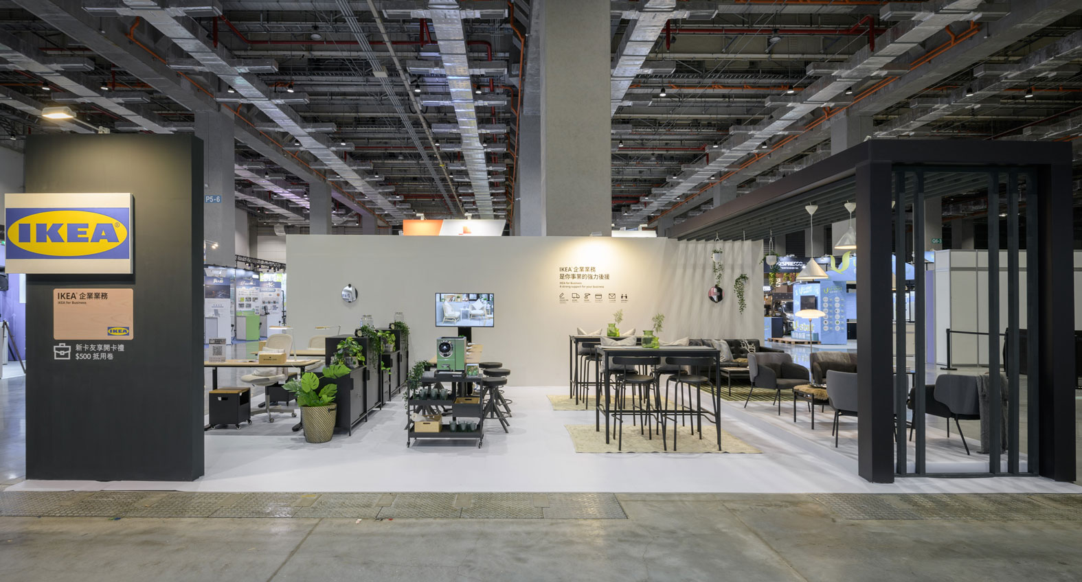以IKEA for Business 品牌精神發想,以簡單俐落的黑、白色當作基底,襯托出IKEA 高單價商用產品的質地。整體空間區域分為辦公區、會議討論區以及VIP休憩區,與現場其他單位的高彩度佈置形成反差,選擇極簡的呈現手法,讓整體展區更加突出吸睛。