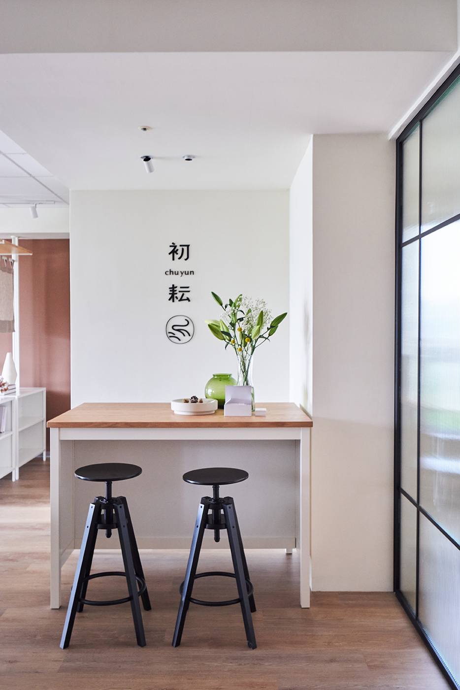初耘為因應食品品牌的成立,加上作為品牌第一個據點,辦公室設計上以大量的公共空間為主軸(如會議室、吧台區),並利用簡約的木質家具以配合白色系為主的空間,同時以局部跳色讓空間有青年活潑感,充分展現品牌精神。