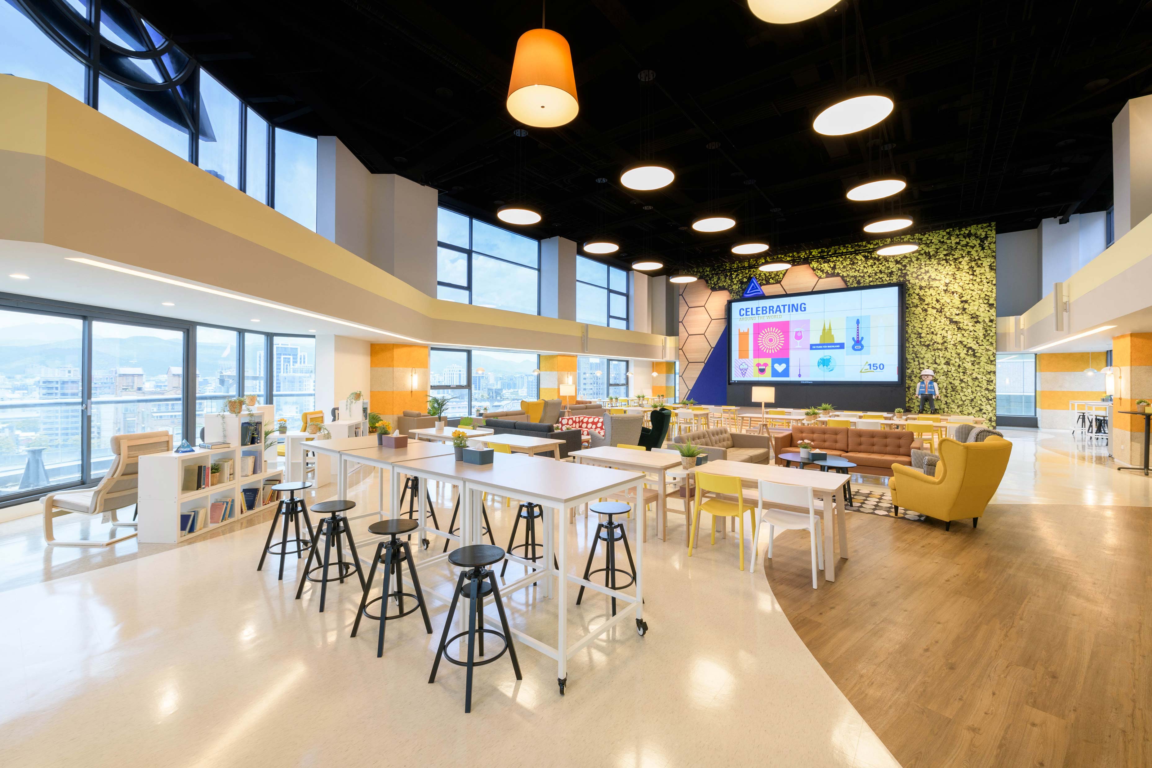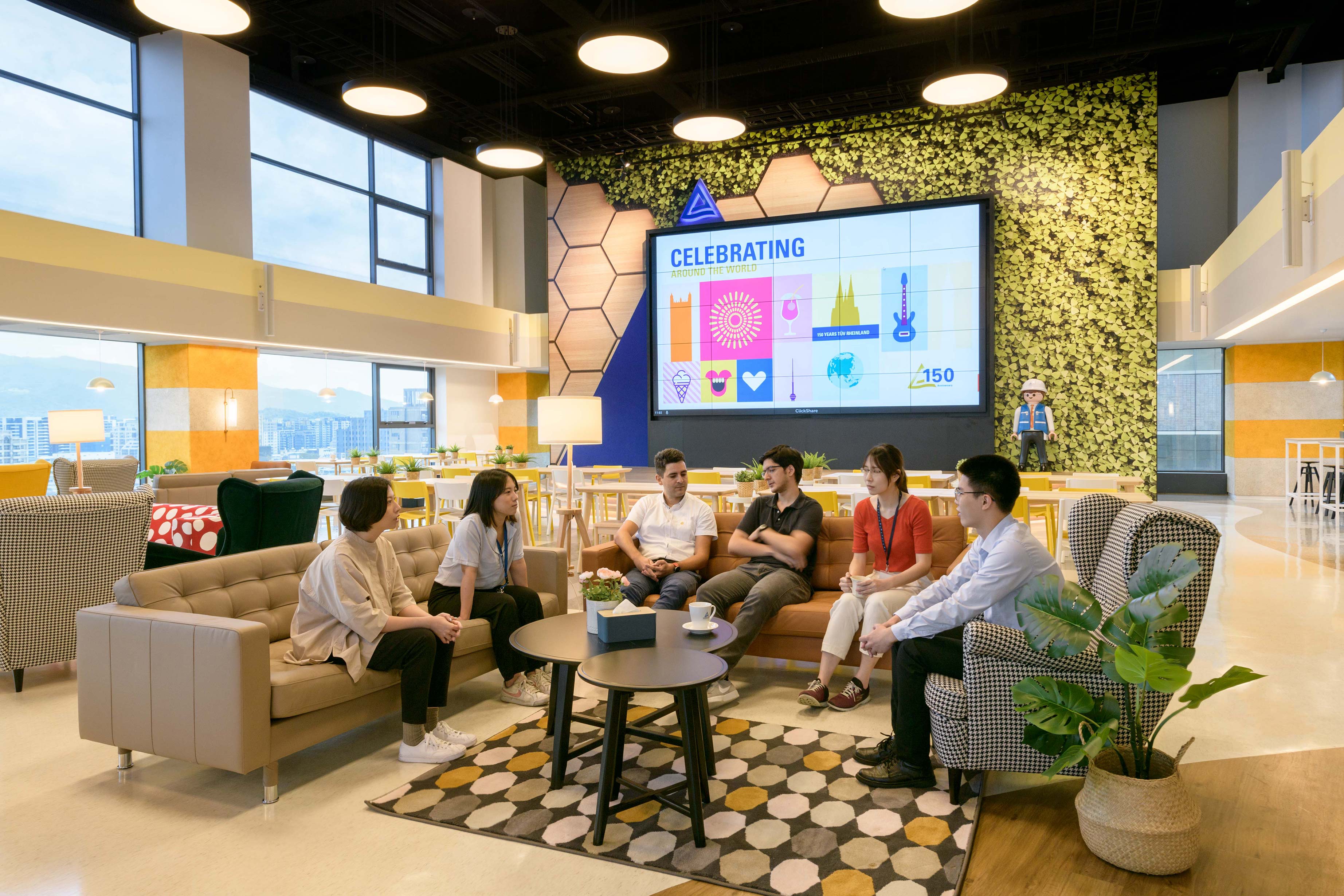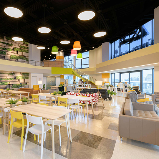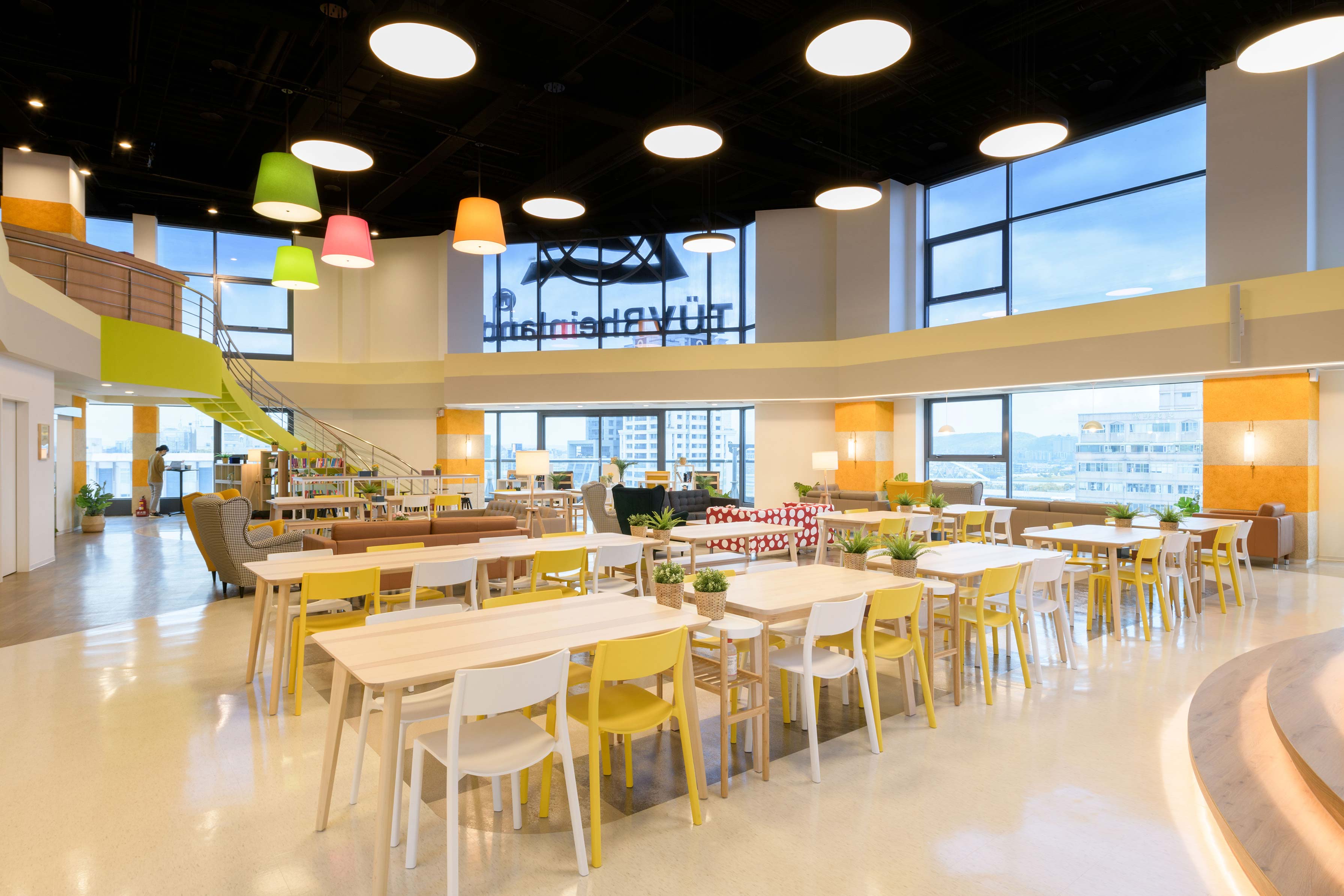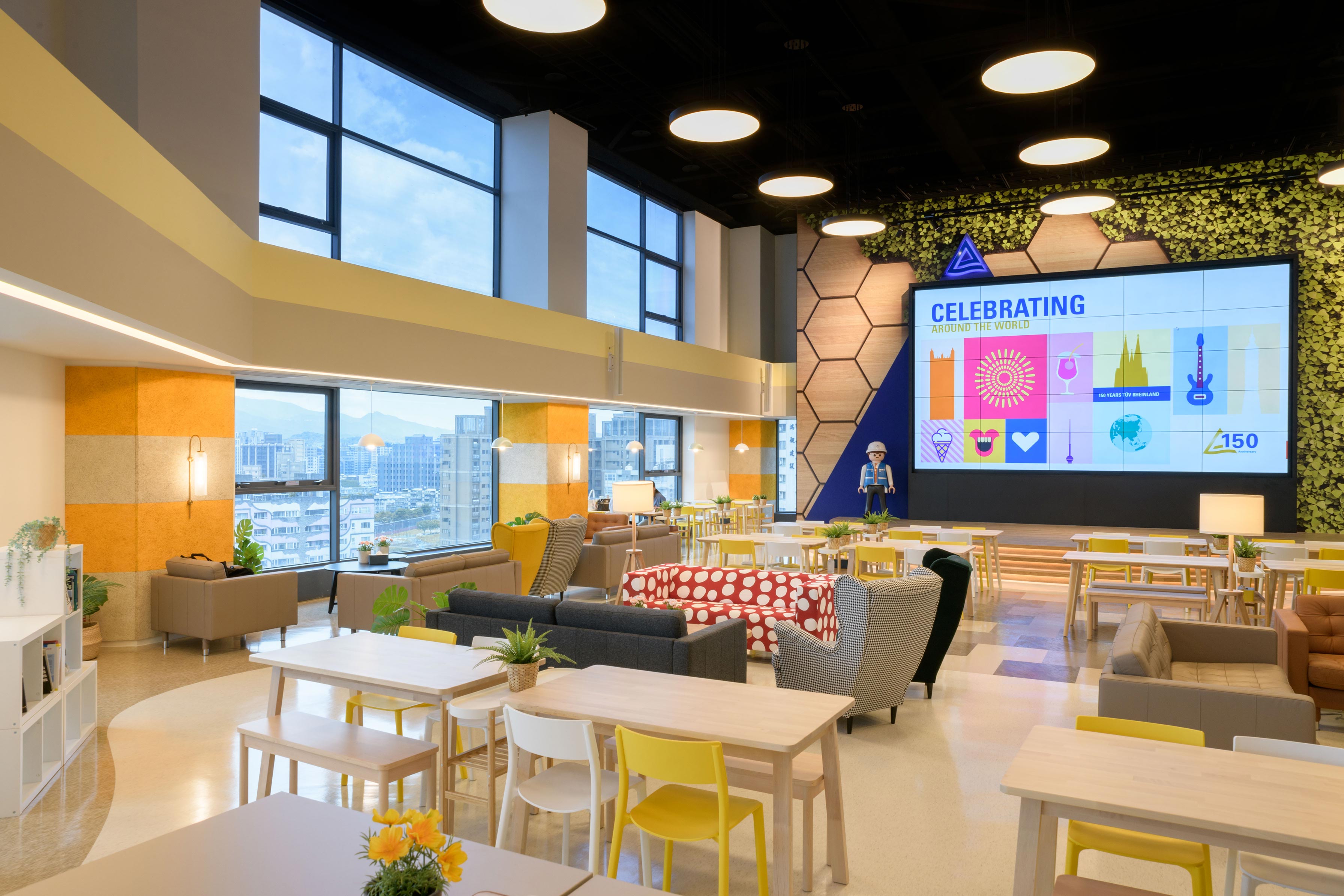 國際知名的第三方驗證機構 - 德國萊因TÜV,想改變大家對德國企業嚴肅的刻板印象,因此委託IKEA企業業務團隊改造員工休憩區域。設計的主軸是以柔和的暖色系為基調呈現放鬆的氛圍,透過不同款式、材質的家具布置展現企業活力及多元包容的特色,並利用挑高的空間優勢營造出開闊自在的環境,打造出像家一樣放鬆的休憩空間,完整演繹「Work and life balance」的企業文化。