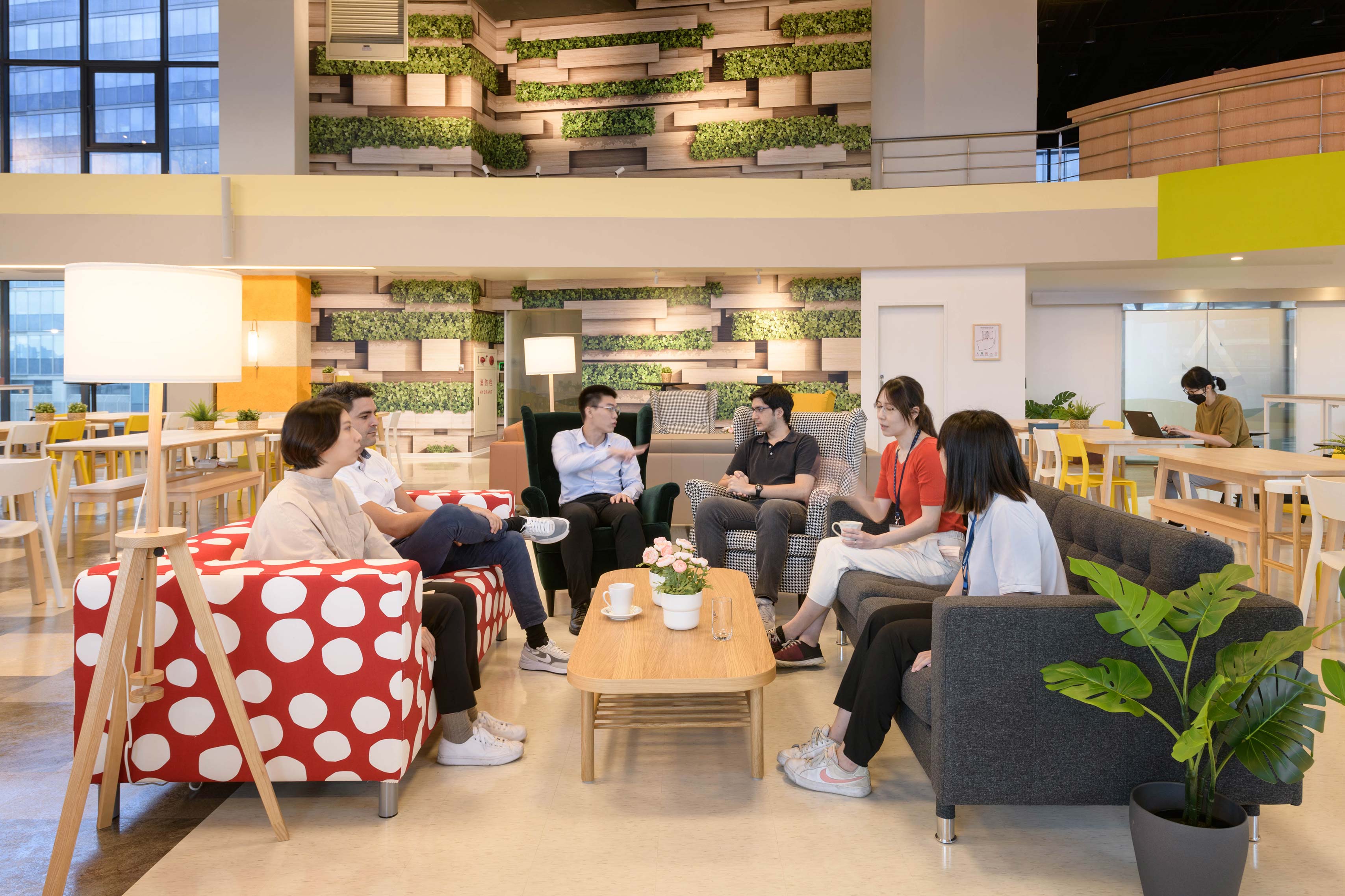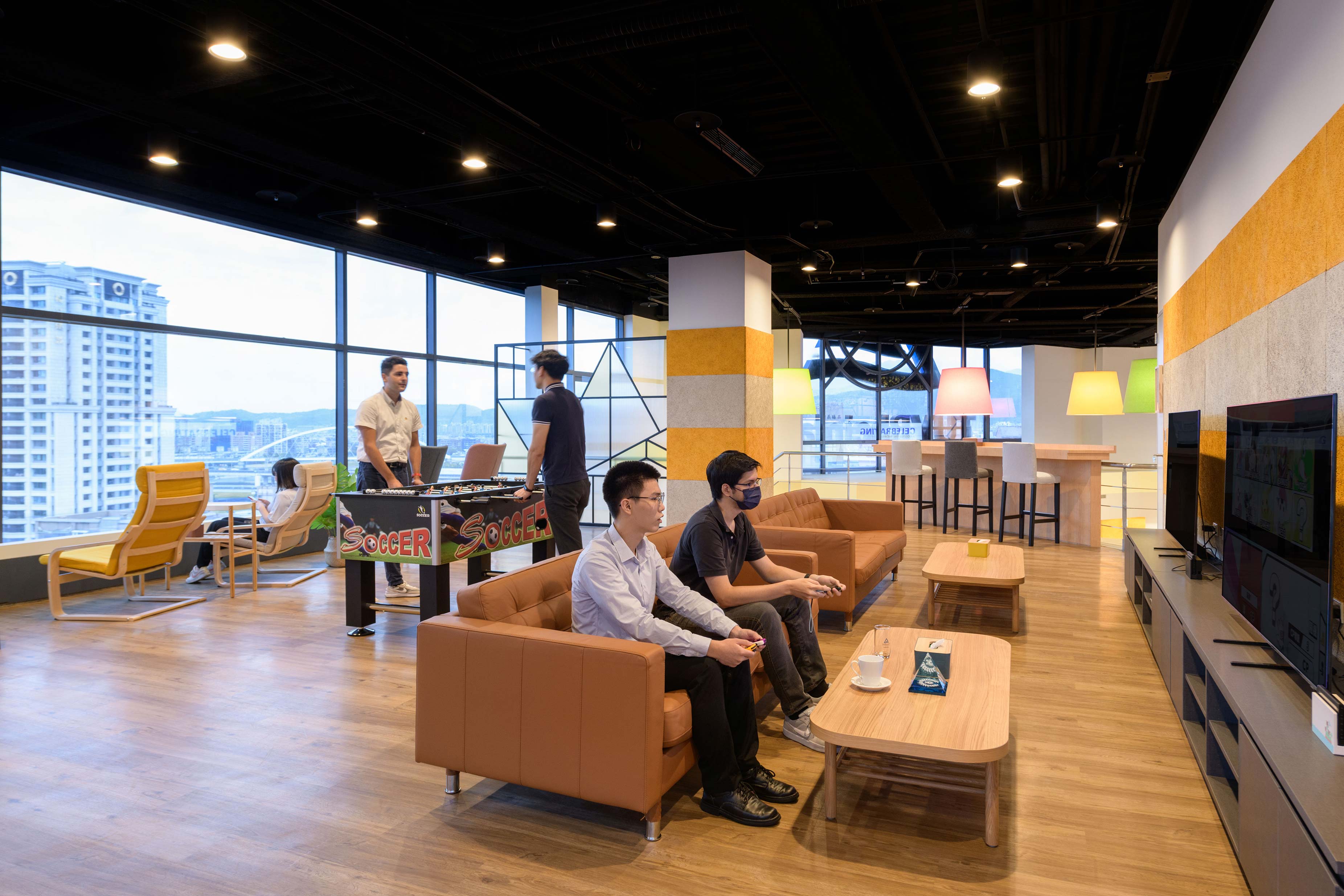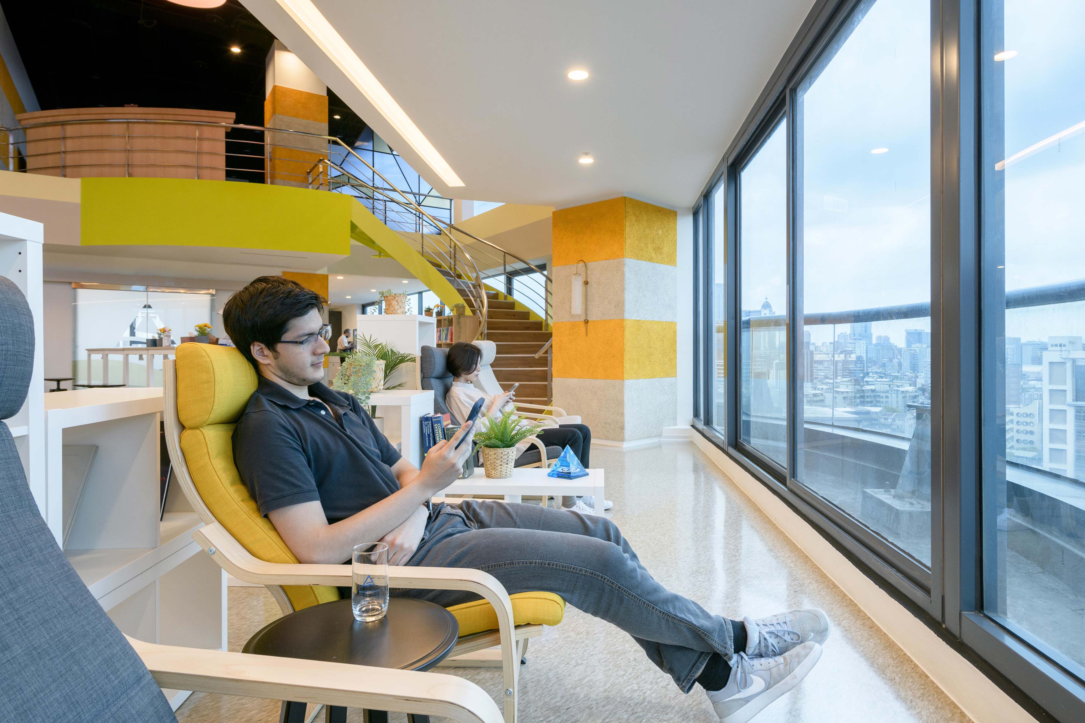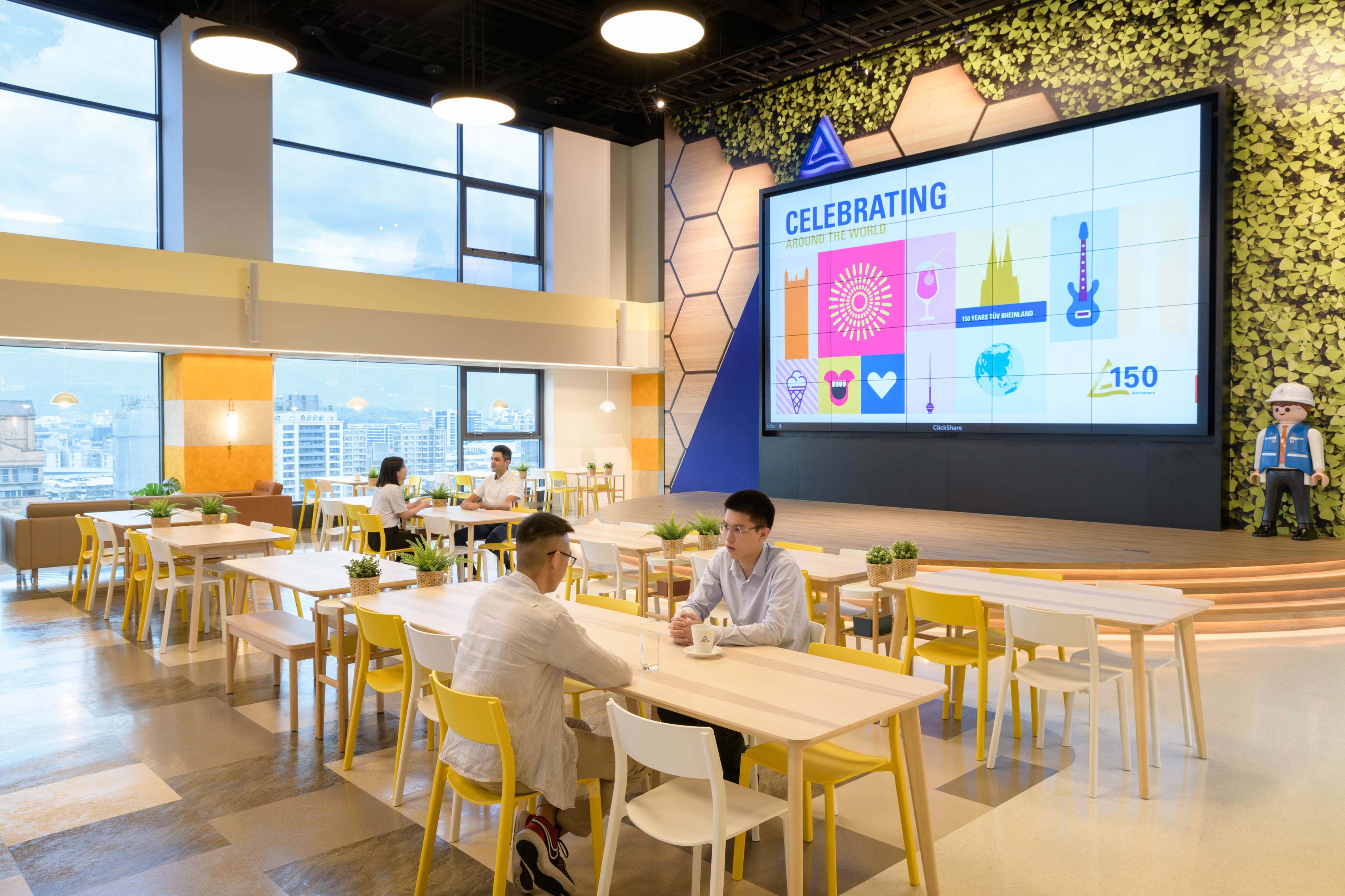 國際知名的第三方驗證機構 - 德國萊因TÜV,想改變大家對德國企業嚴肅的刻板印象,因此委託IKEA企業業務團隊改造員工休憩區域。設計的主軸是以柔和的暖色系為基調呈現放鬆的氛圍,透過不同款式、材質的家具布置展現企業活力及多元包容的特色,並利用挑高的空間優勢營造出開闊自在的環境,打造出像家一樣放鬆的休憩空間,完整演繹「Work and life balance」的企業文化。