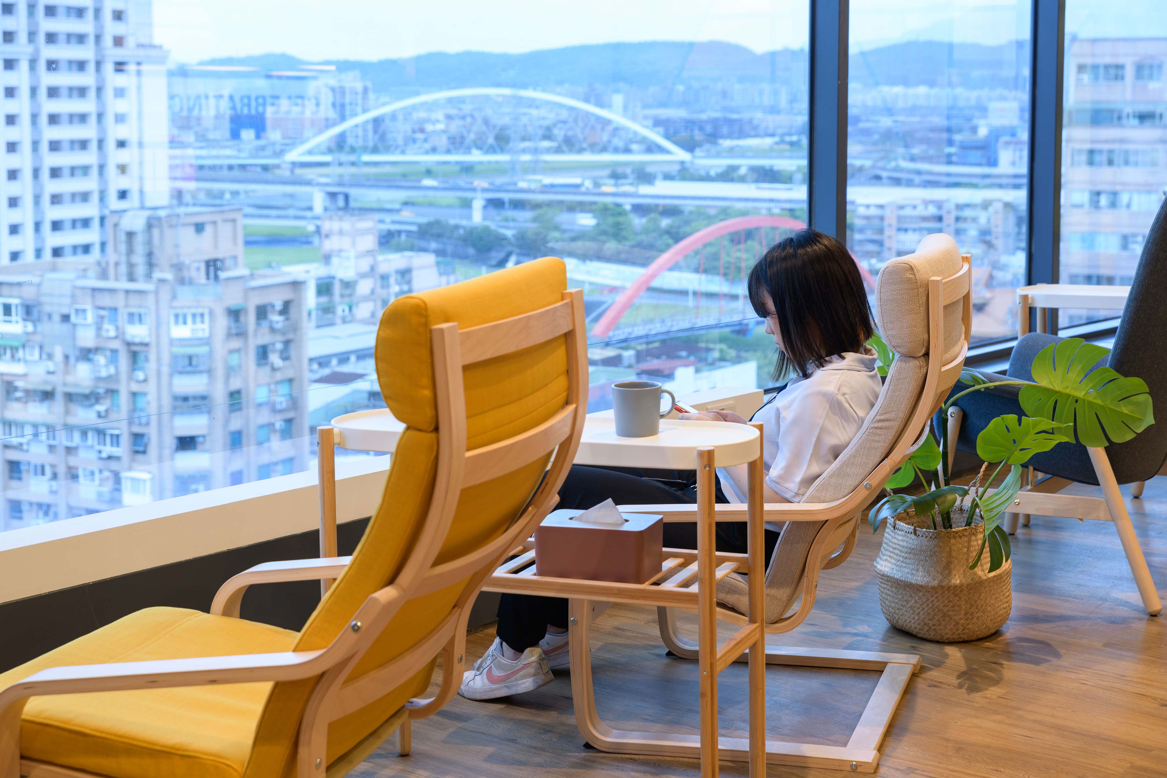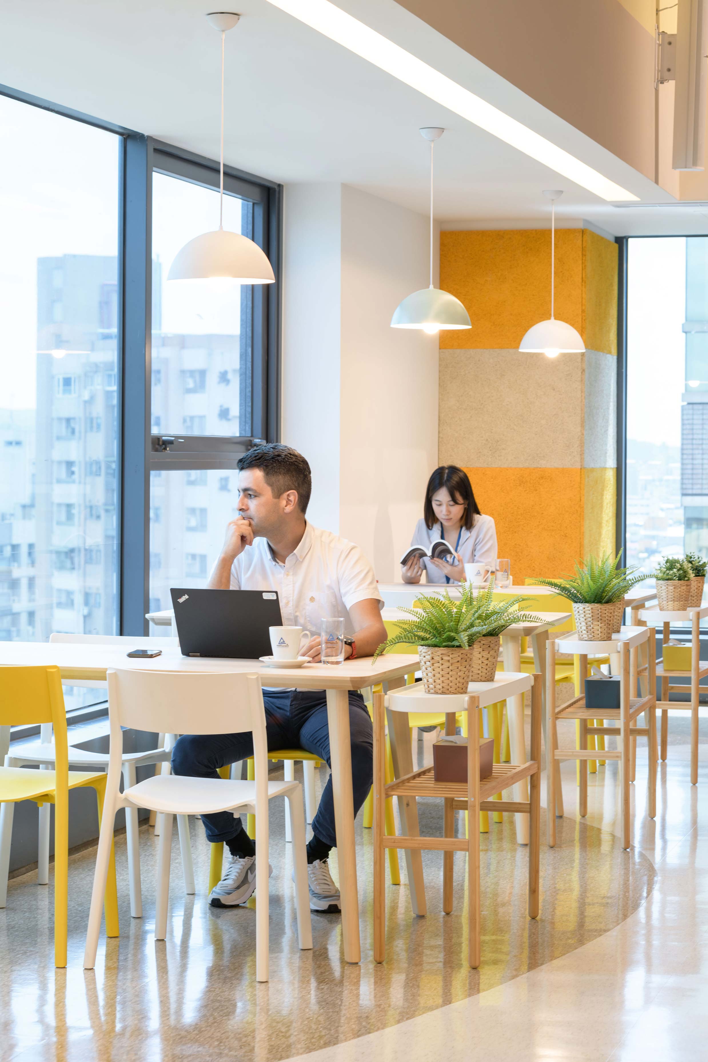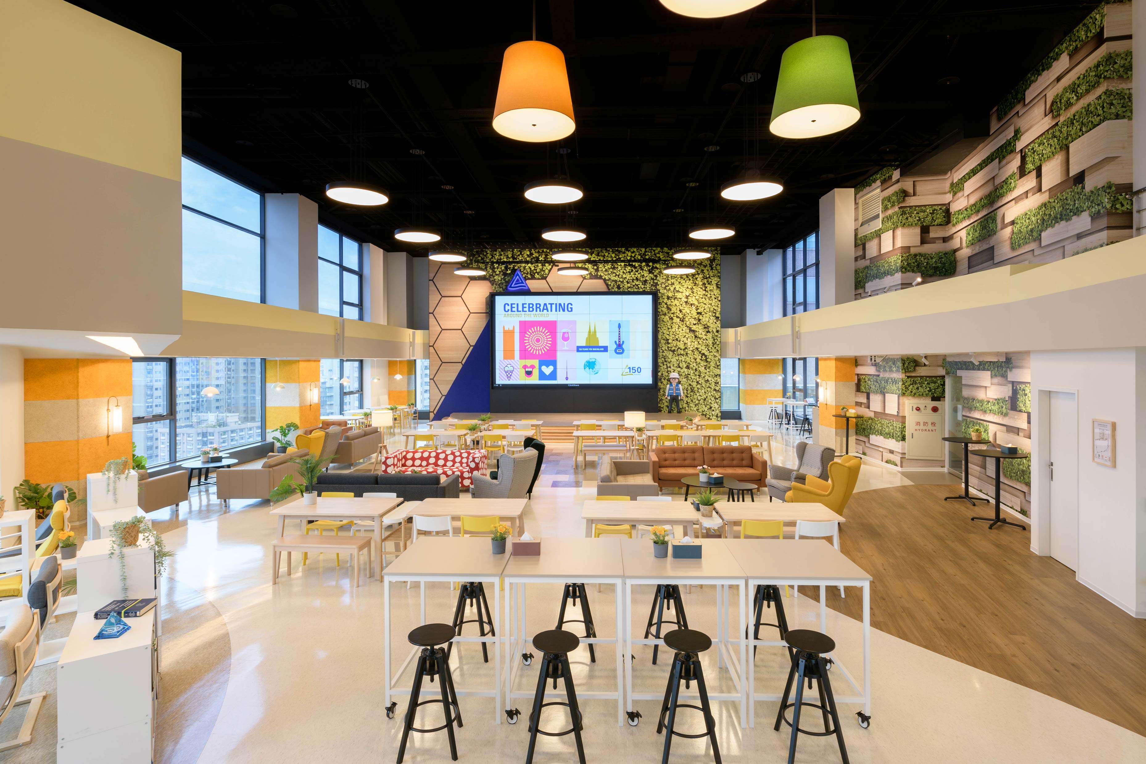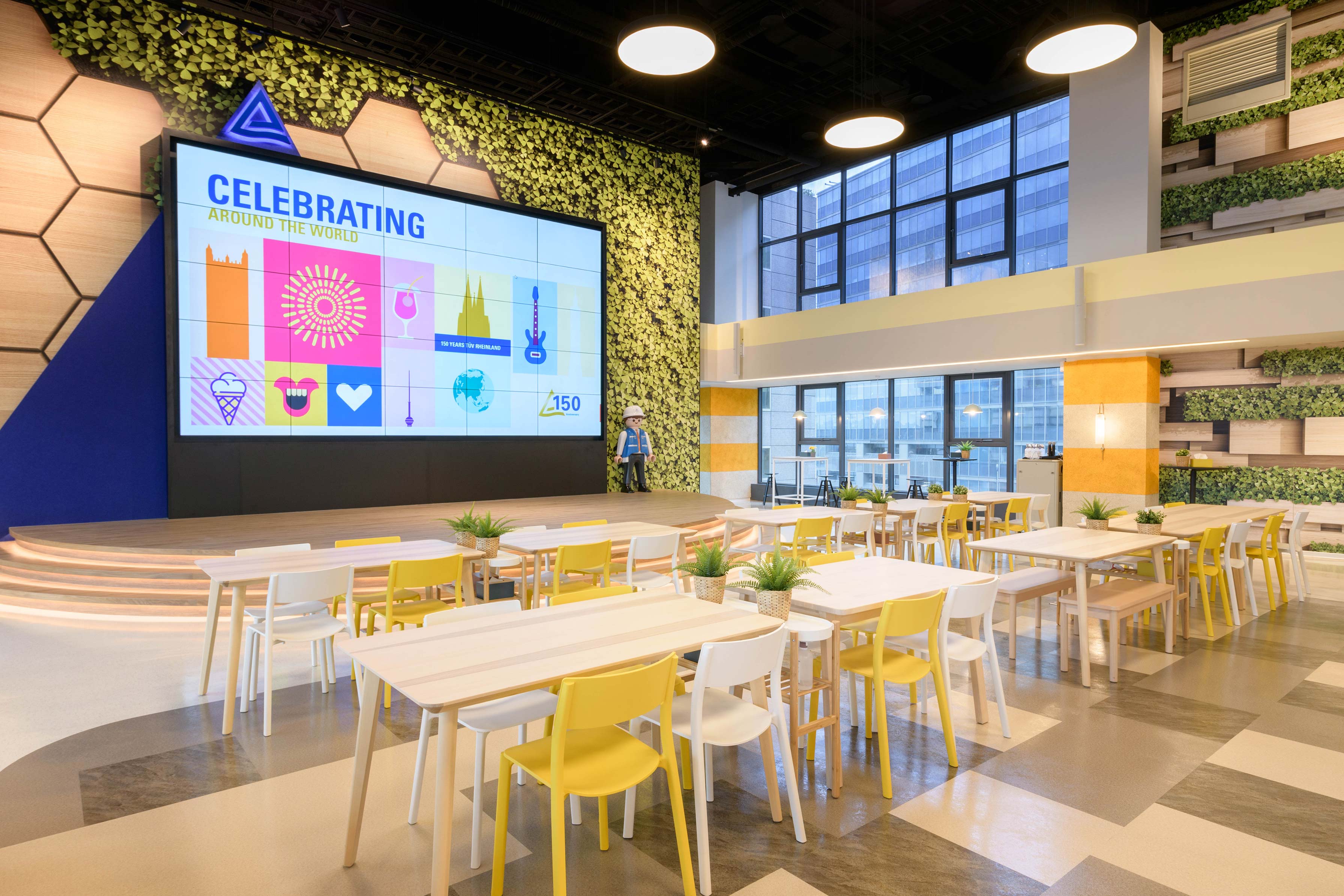 國際知名的第三方驗證機構 - 德國萊因TÜV,想改變大家對德國企業嚴肅的刻板印象,因此委託IKEA企業業務團隊改造員工休憩區域。設計的主軸是以柔和的暖色系為基調呈現放鬆的氛圍,透過不同款式、材質的家具布置展現企業活力及多元包容的特色,並利用挑高的空間優勢營造出開闊自在的環境,打造出像家一樣放鬆的休憩空間,完整演繹「Work and life balance」的企業文化。