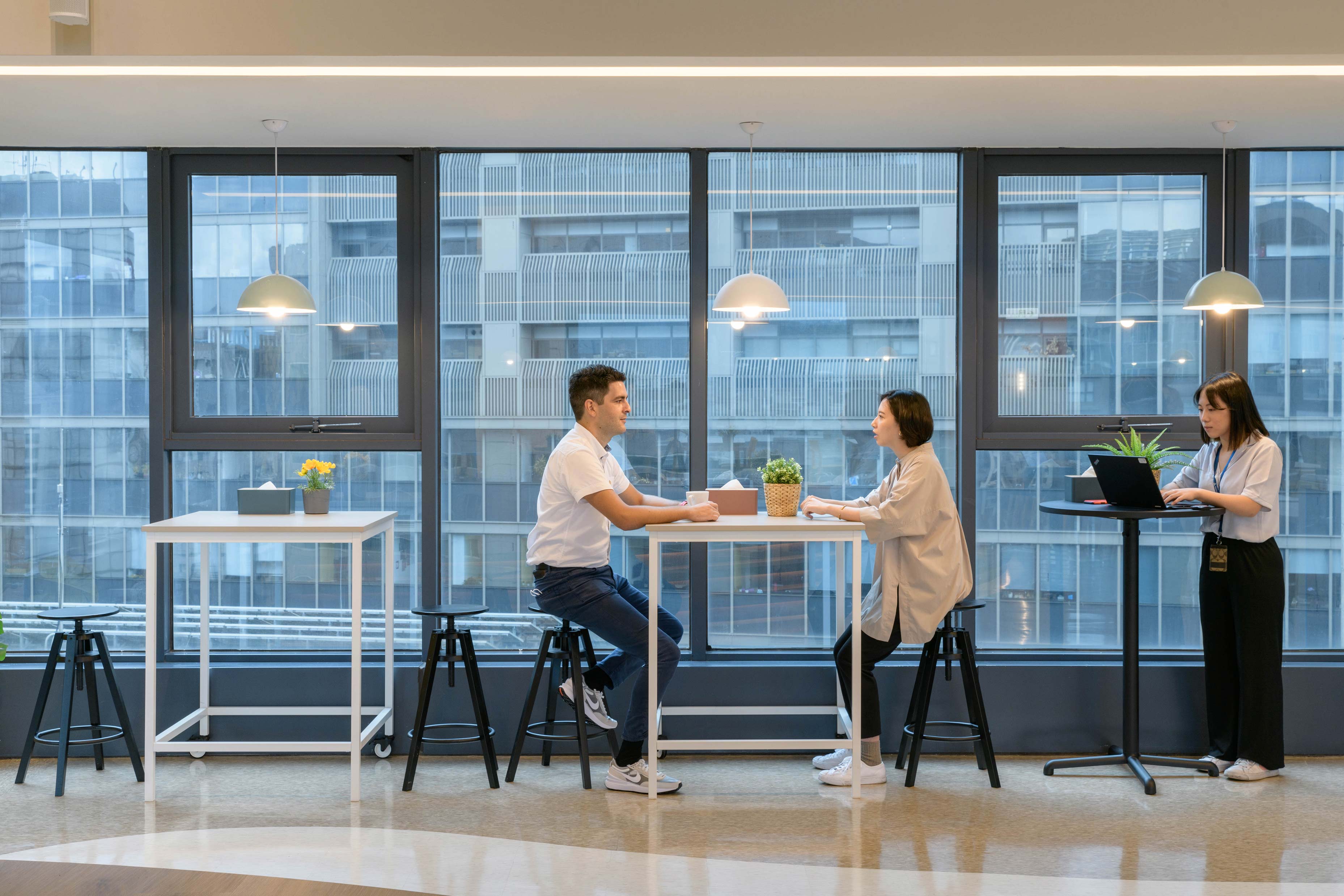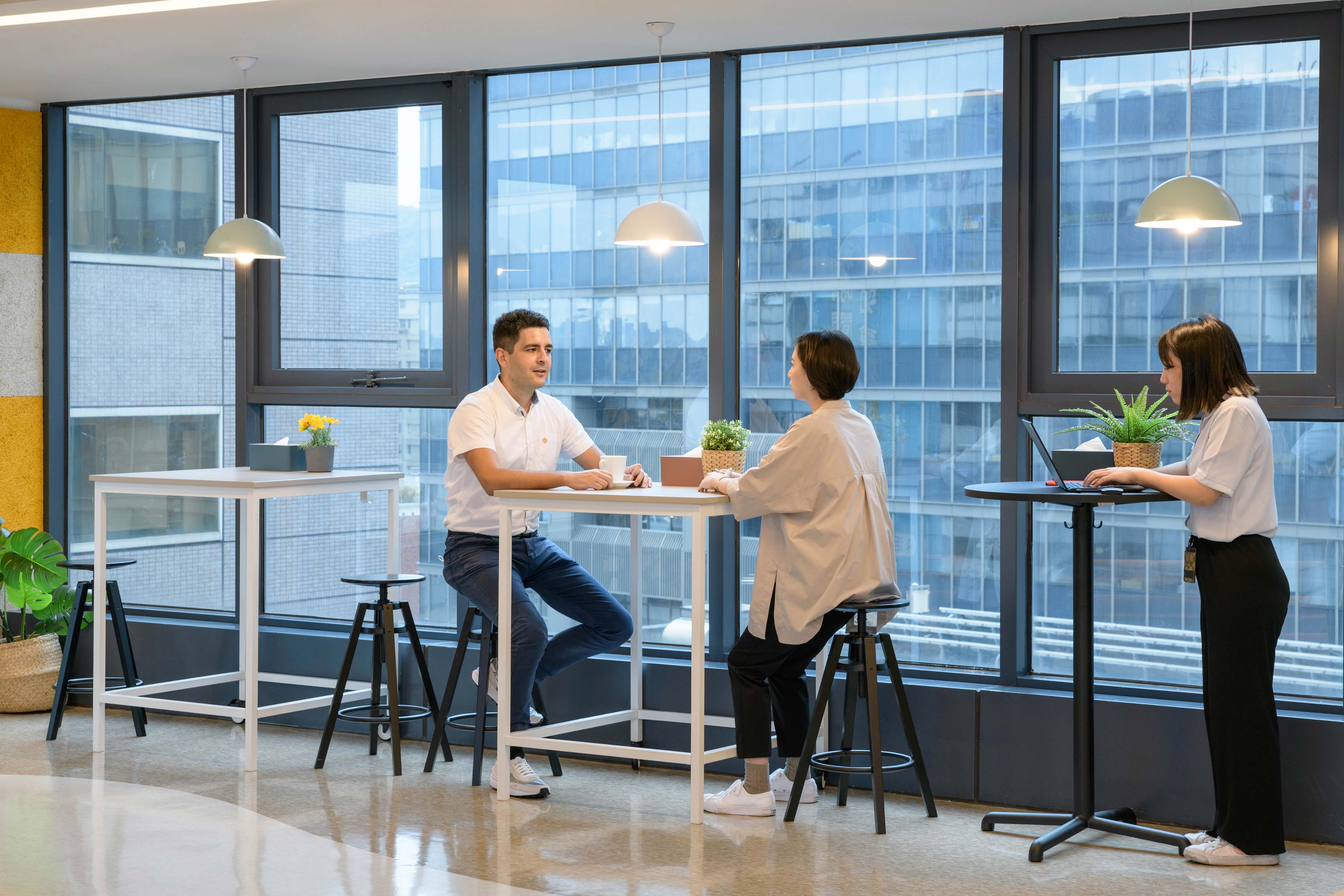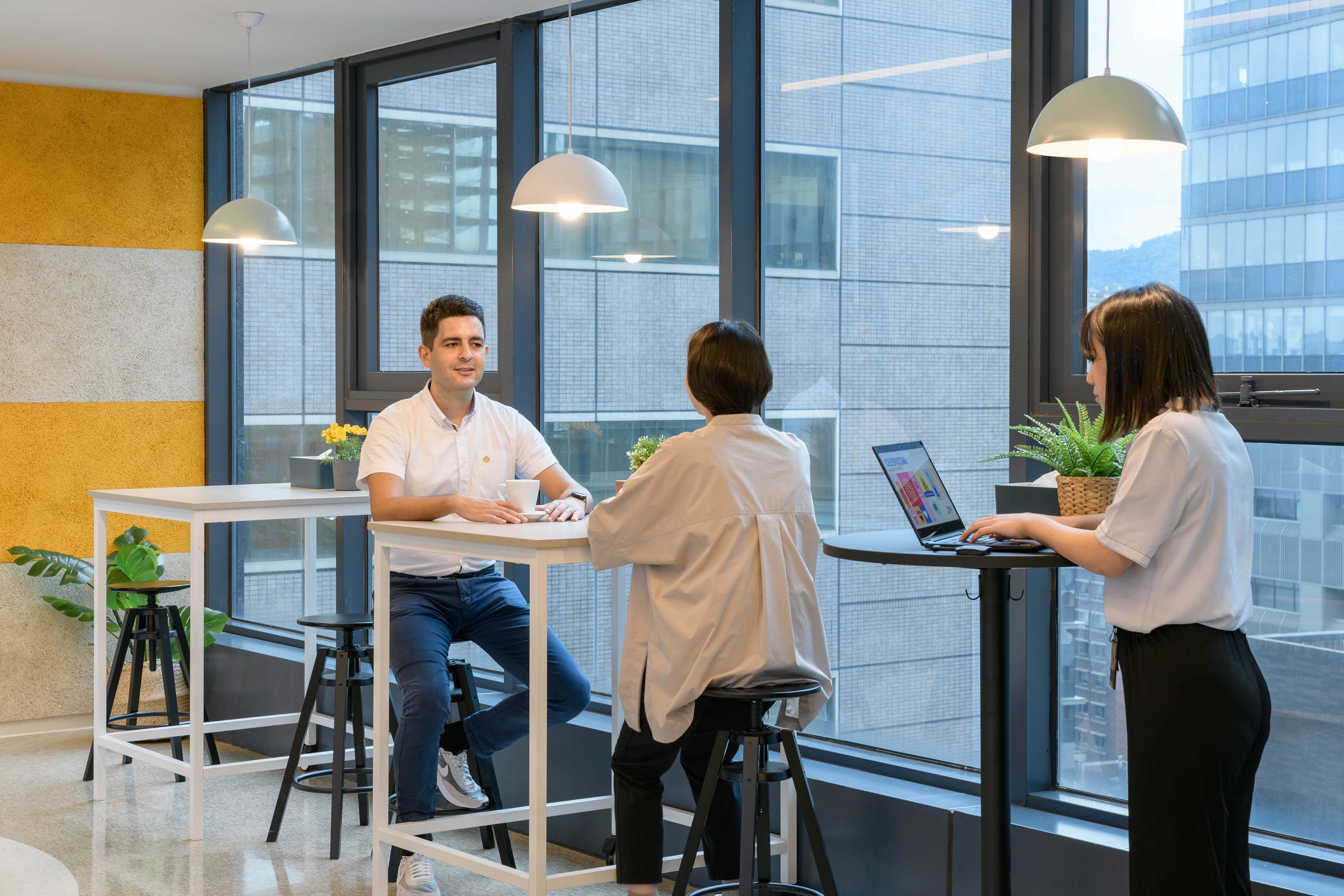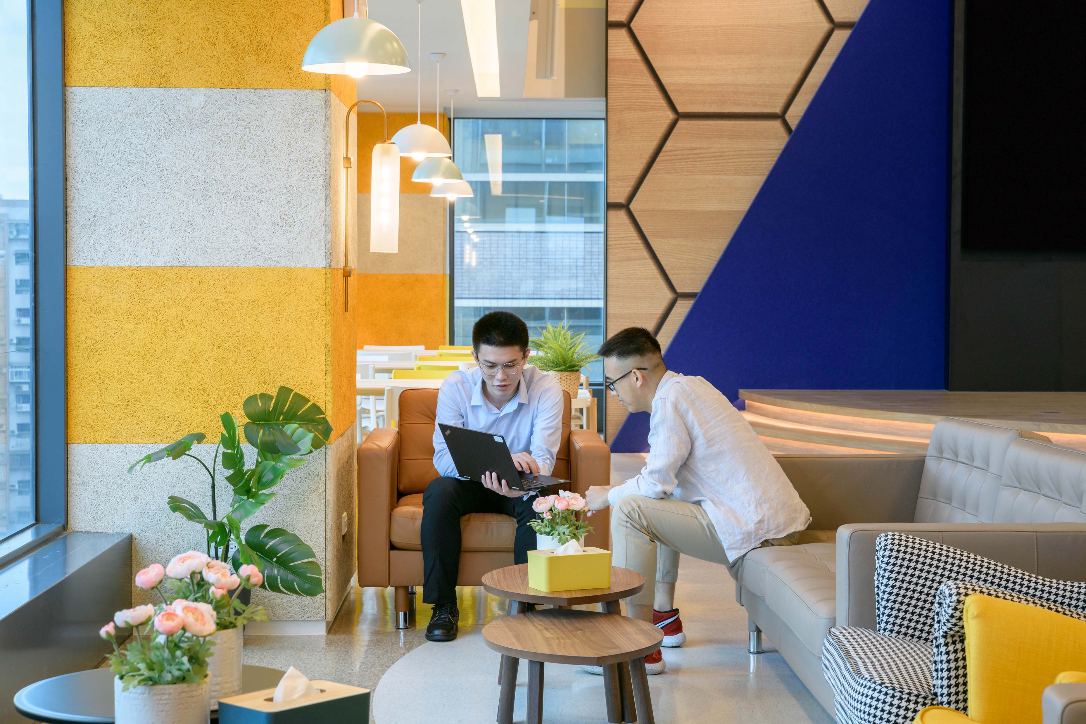 國際知名的第三方驗證機構 - 德國萊因TÜV,想改變大家對德國企業嚴肅的刻板印象,因此委託IKEA企業業務團隊改造員工休憩區域。設計的主軸是以柔和的暖色系為基調呈現放鬆的氛圍,透過不同款式、材質的家具布置展現企業活力及多元包容的特色,並利用挑高的空間優勢營造出開闊自在的環境,打造出像家一樣放鬆的休憩空間,完整演繹「Work and life balance」的企業文化。
