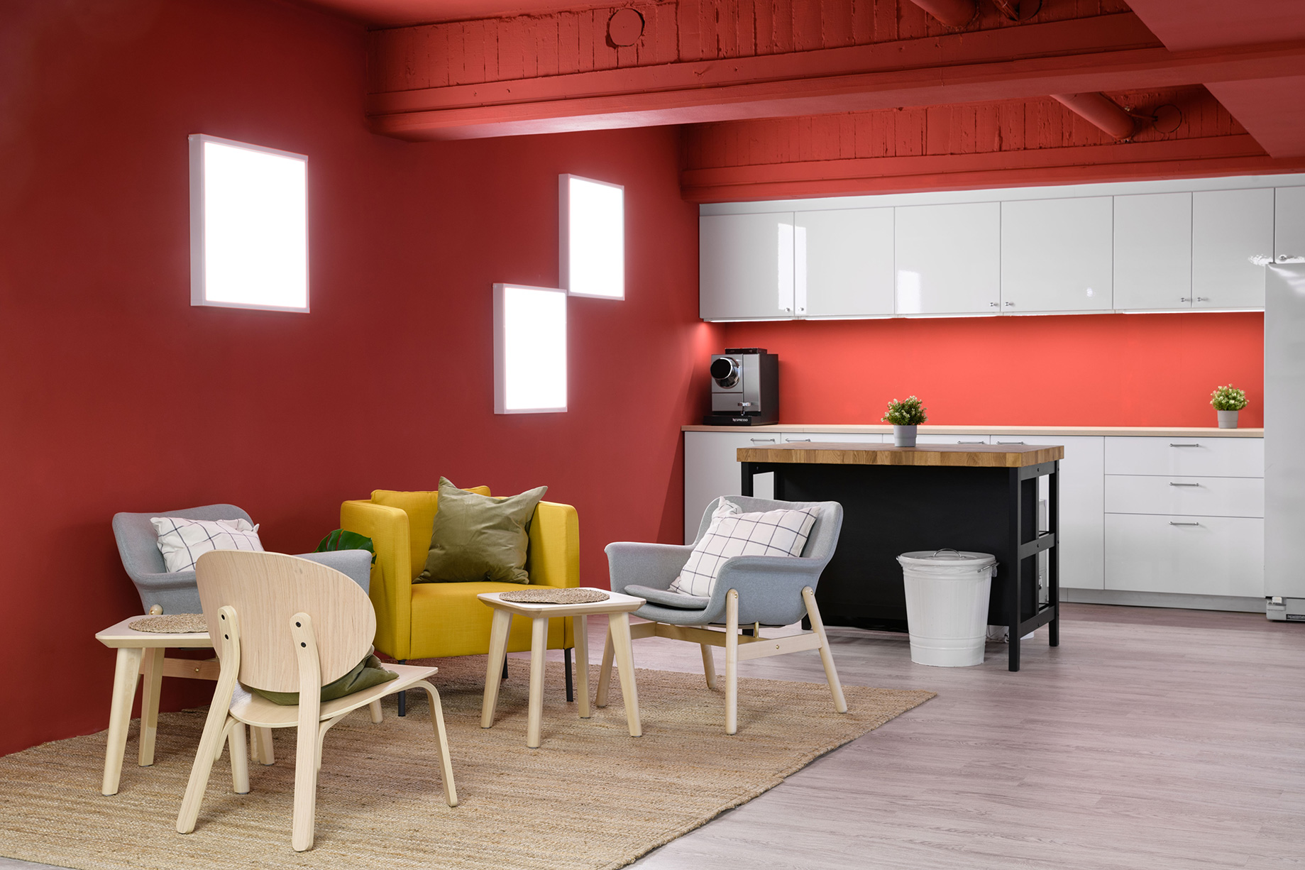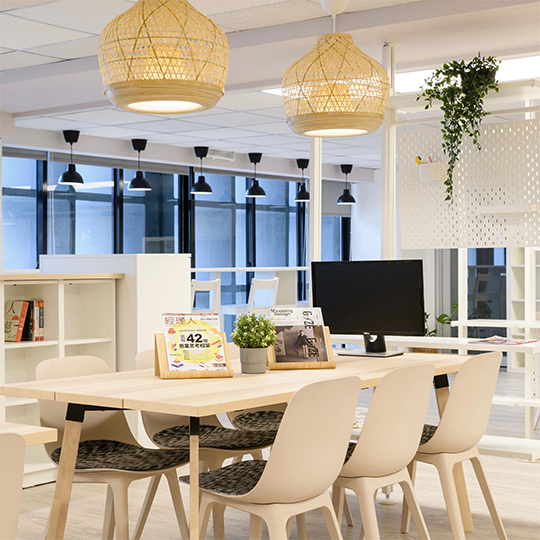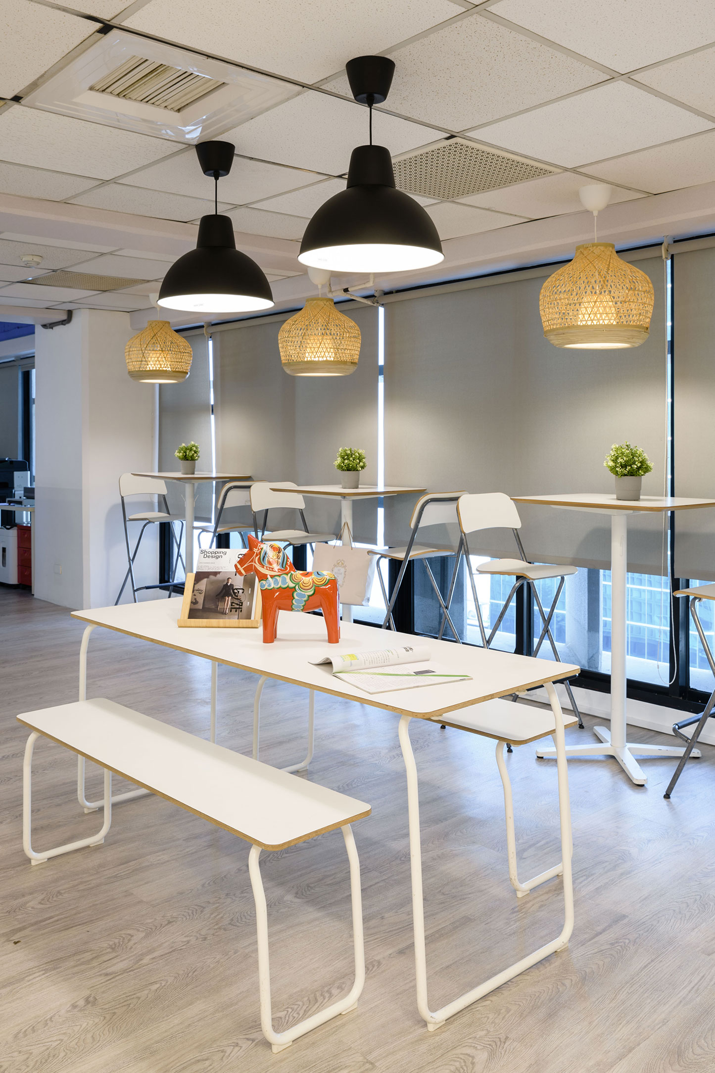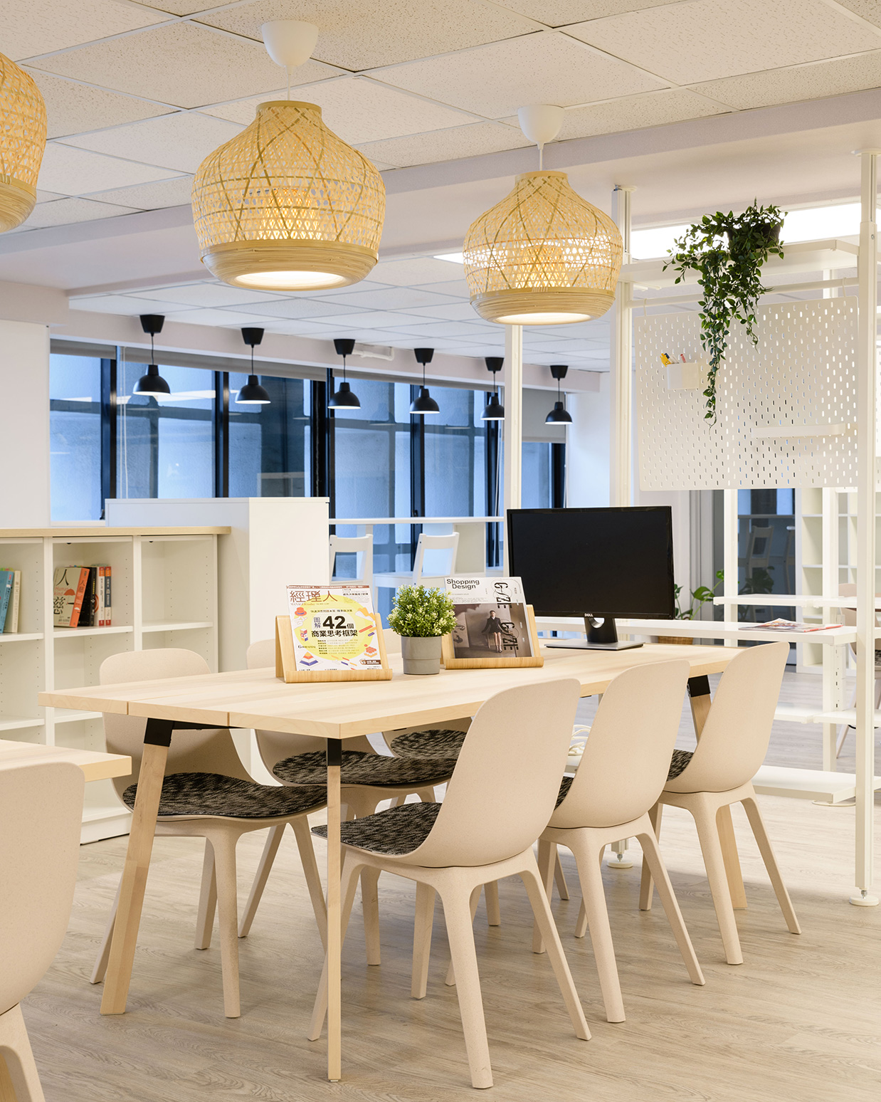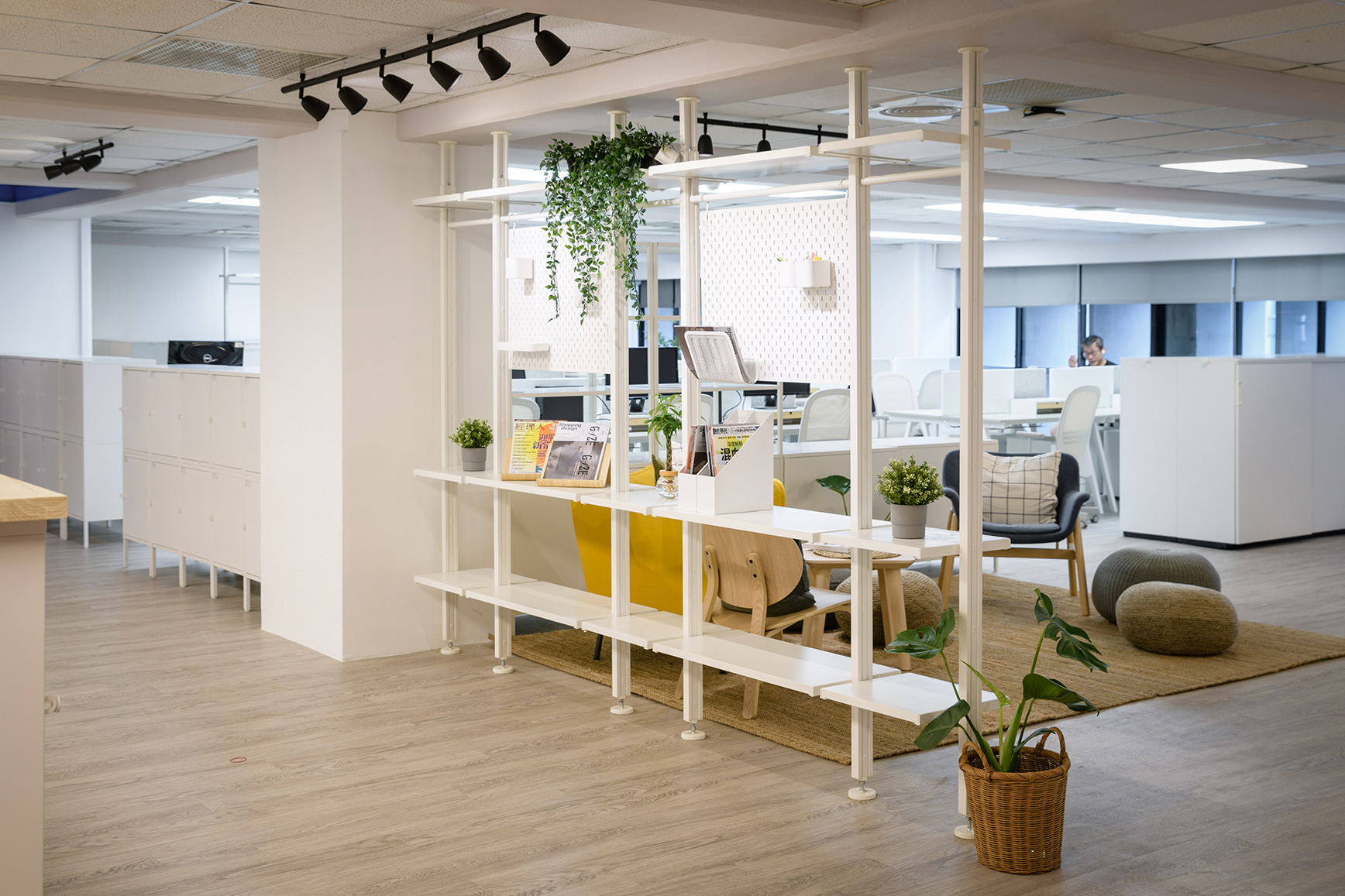 空間採用以人為本的設計,透過蒐集員工對辦公室期待,並採用北歐流行風建立簡約清爽的整體視覺。另針對疫後的辦公型態需求,擴增協作與會議空間以提昇工作效率;窗邊座位區可不受干擾獨自辦公,並能飽覽都市景觀;頂天立地層櫃不僅可收納、展示、區隔空間,也能有效整線,是讓空間清爽整潔的絕佳選擇;跳色的單椅、廚房,不僅為公共區域添增趣味風采,也是同仁日常交流、享受咖啡的好地方