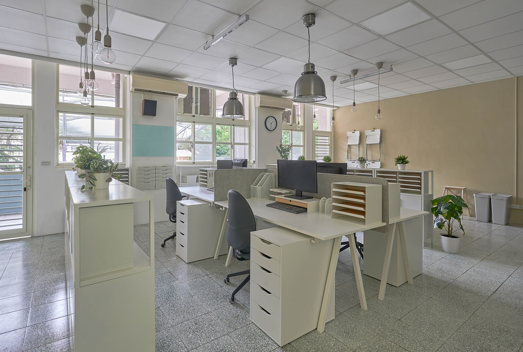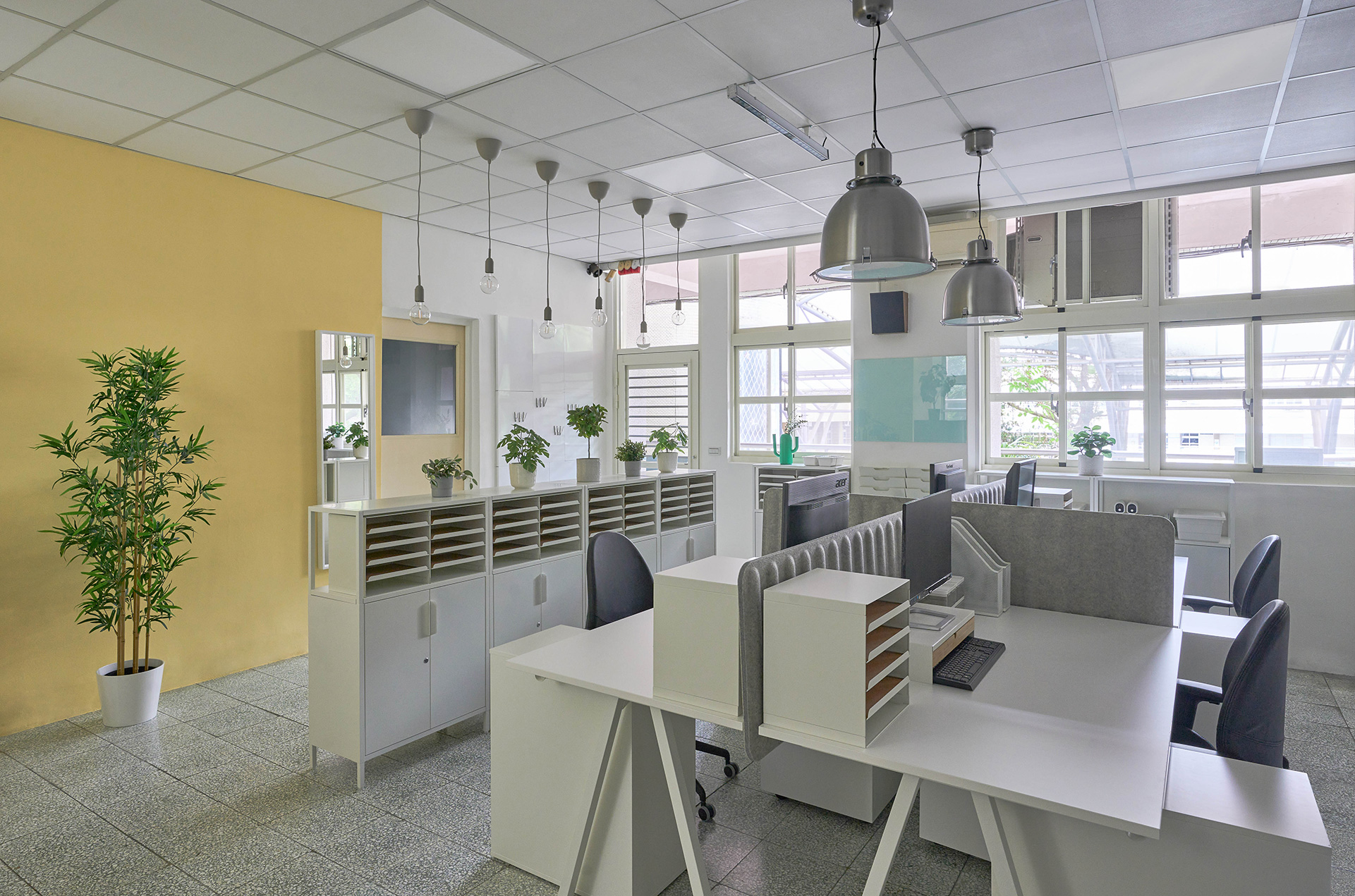 身為百年校園的新店安坑國小,辦公室有很多需要解決的問題,透過校長老師與IKEA企業業務諮詢中蒐集的問題與需求,量身打造具系統化的收納與舒適的工作空間。 以收納櫃作為區域分隔,不但能增加收納空間,解決大量的文件雜物堆放,同時還能劃分區域,讓專注與合作不同的需求都能兼顧,加上具有吸音功能的隔屏,減少彼此干擾;善用收納家飾,讓高頻率拿取也能簡單直覺的歸位;符合人體工學的桌椅,與轉角空間安置的吧台桌椅,讓辦公空間也能舒服愜意。 學校的使用與狀況比較難控制,因此特別挑選耐用、耐潮濕、容易清潔與承重量高的家具,更能長久保持家具的良好狀態。