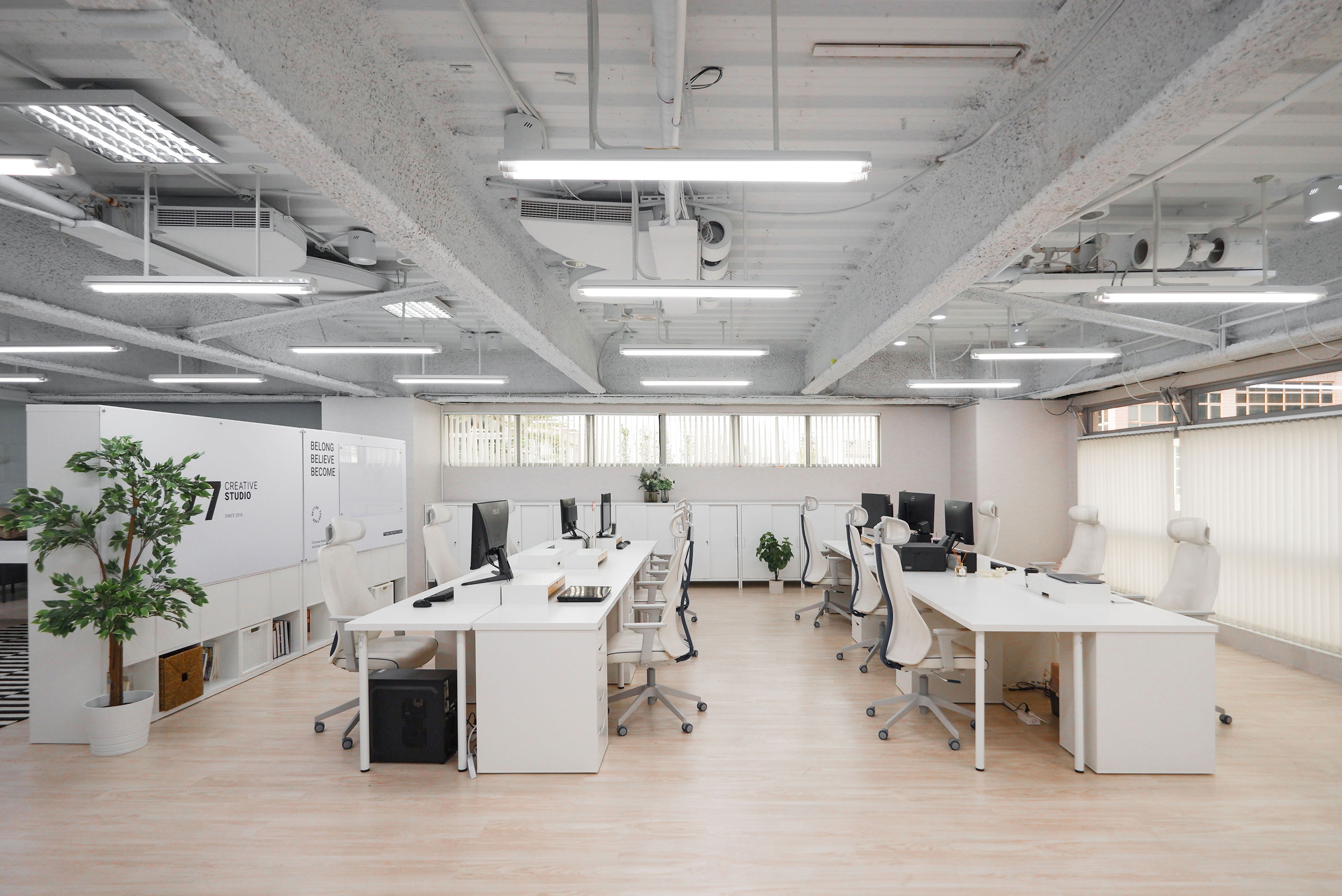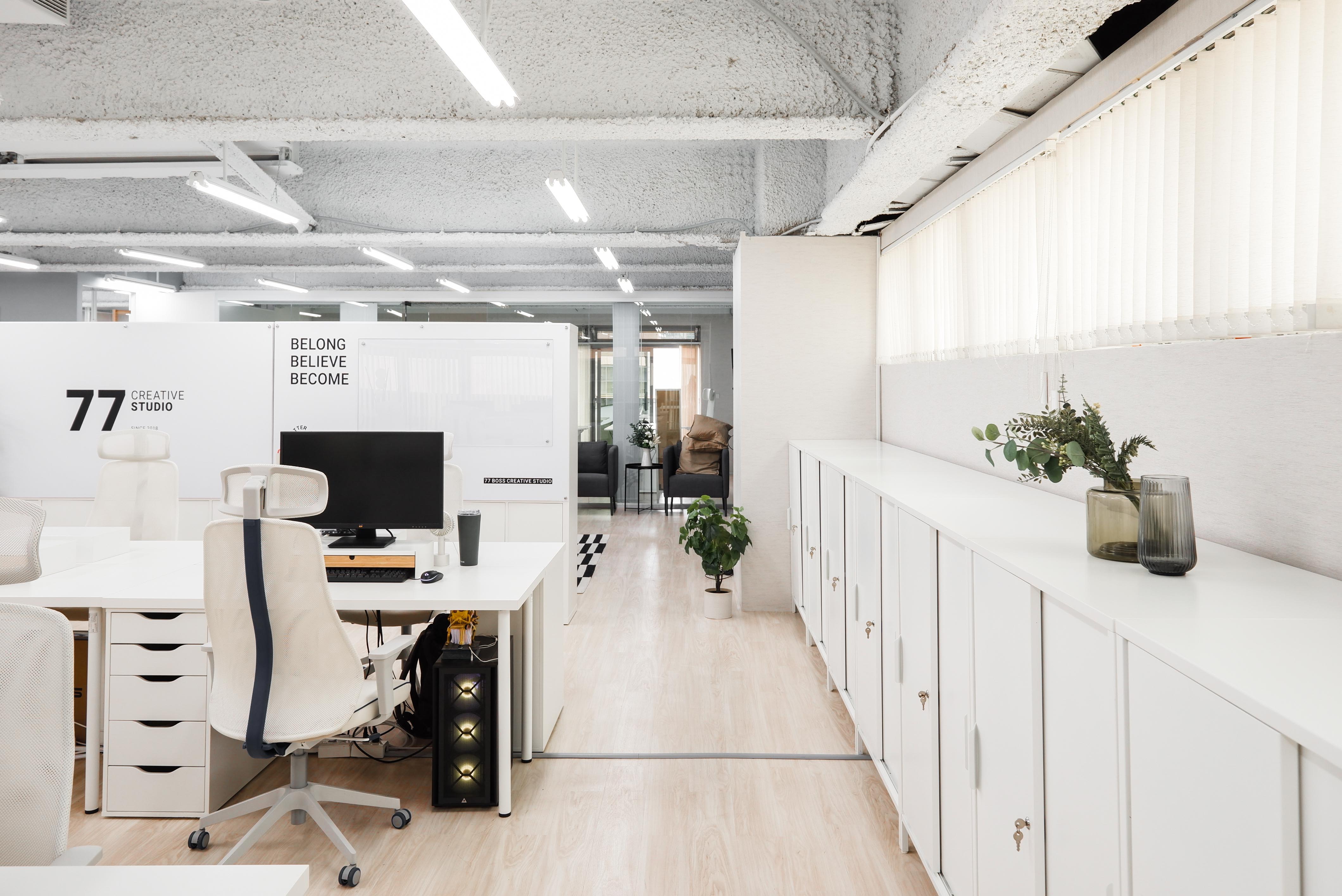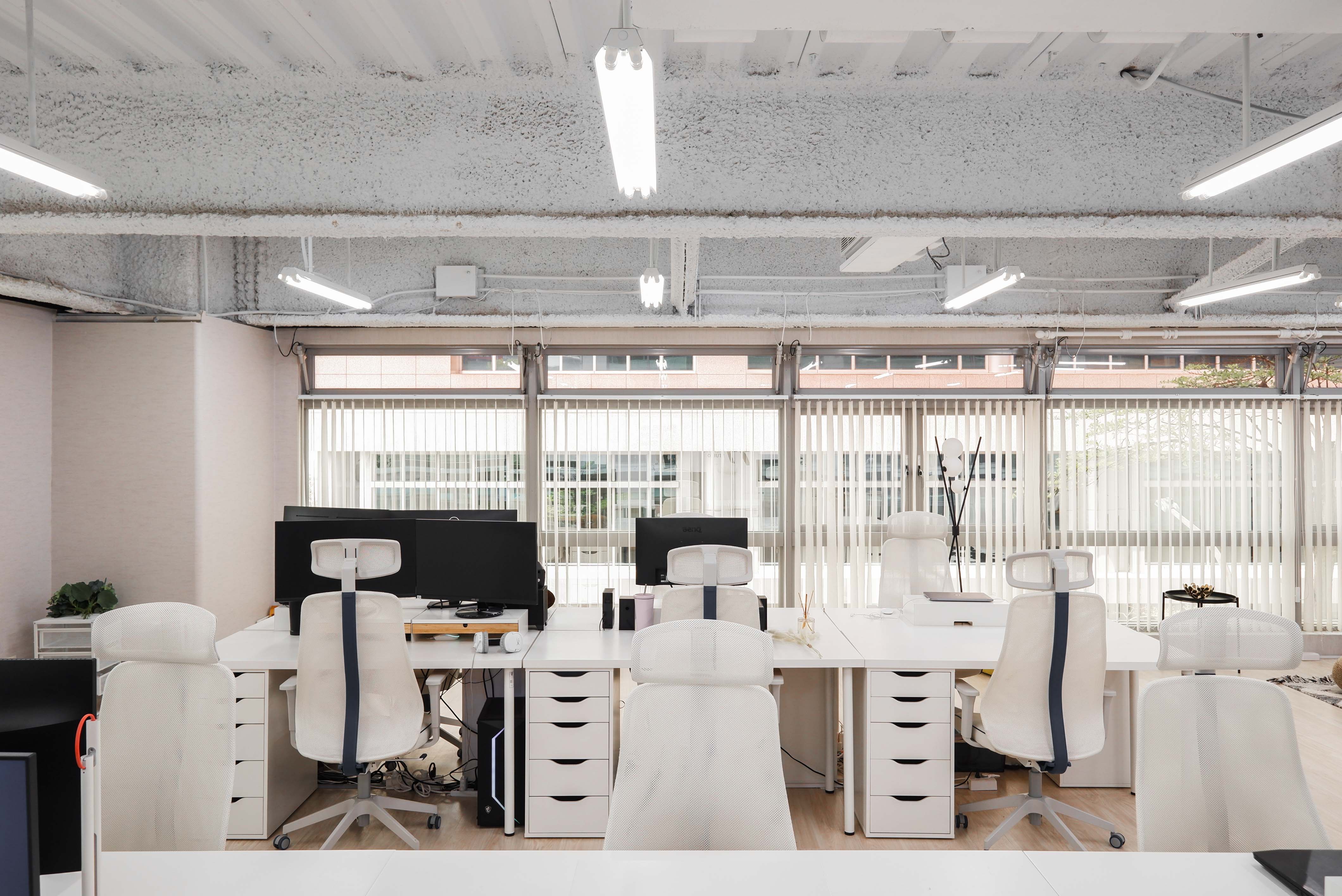 員工辦公區則因應未來擴張需求,設置多張桌子打造共同協作空間,便於獨立作業和團隊討論。同時選用人體工學的辦公椅,提升員工舒適度和生產力。休閒空間包含慵懶沙發區和開放式吧台,提供靈感來源和放鬆場所;更衣室搭配可自行設計的層架組進行收納。