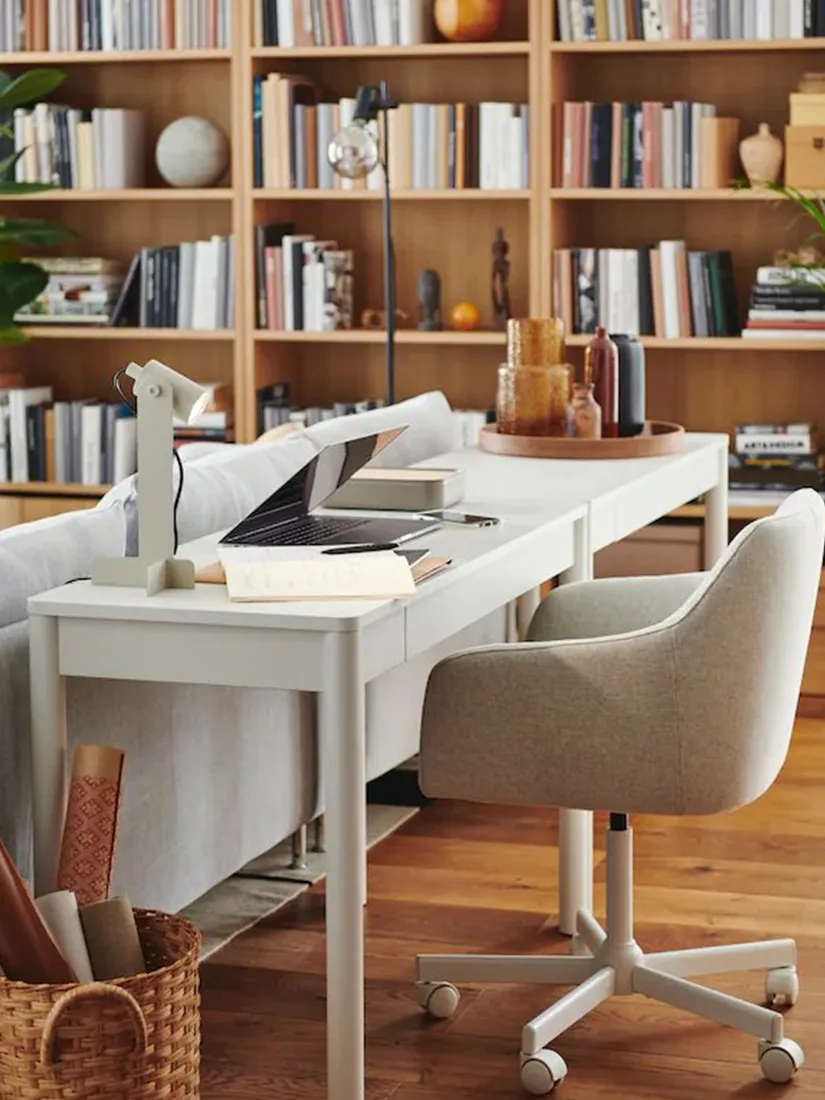 改變書桌的擺放方式,就能釋放視線與工作空間。如果房間太小,可以將桌子橫放,再把書本和文件收進書架或層架。簡單小改變讓空間更通透,也能活絡思緒。