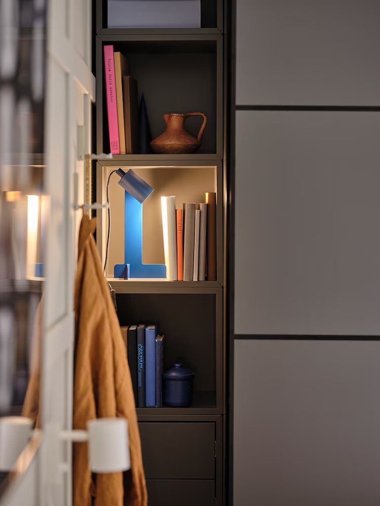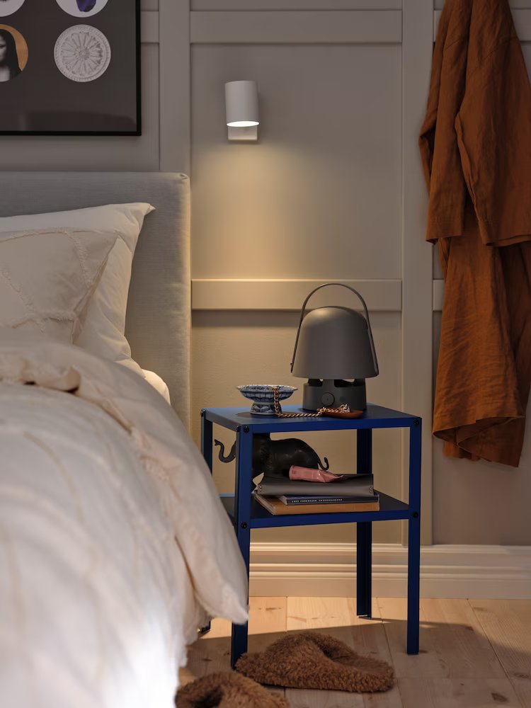 在灰色色調疊層的臥室裡,藍色的桌子和檯燈能為房間注入活力,搭配小配件與書本,更是大大提升現代感。輕巧靈活的床邊桌如同生活的小助手,無論到房間哪個角落都能隨時待命。