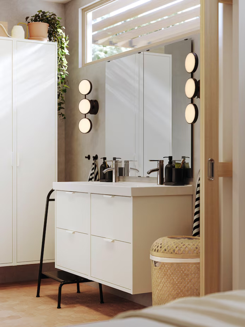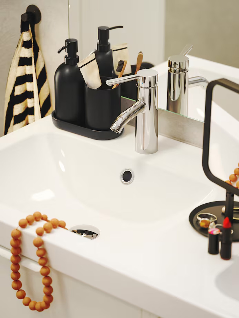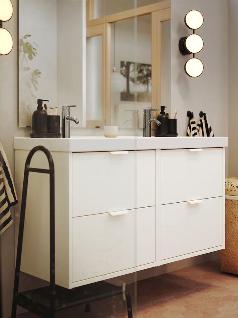 兩個各具寬敞抽屜的洗臉盆櫃,加上堅固耐用的 ORRSJÖN雙人洗臉盆(享有 10 年品質保證),非常適合家中最繁忙的空間。白色浴室家具和深色系的配件形成鮮明對比,為北歐極簡風增添現代感。
