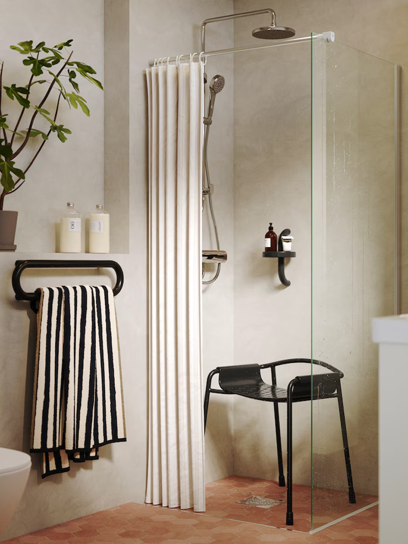 隨手可及的貼心幫手:簡約優雅又堅固耐用的 BÄSINGEN 浴室配件,適時給予需要的協助;包含兩種墊腳凳、淋浴椅、淋浴收納架、毛巾桿與衛生紙架,典雅碳灰色打造現代北歐風浴室。