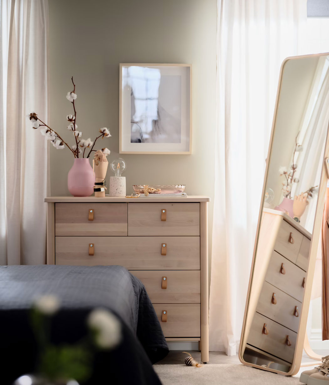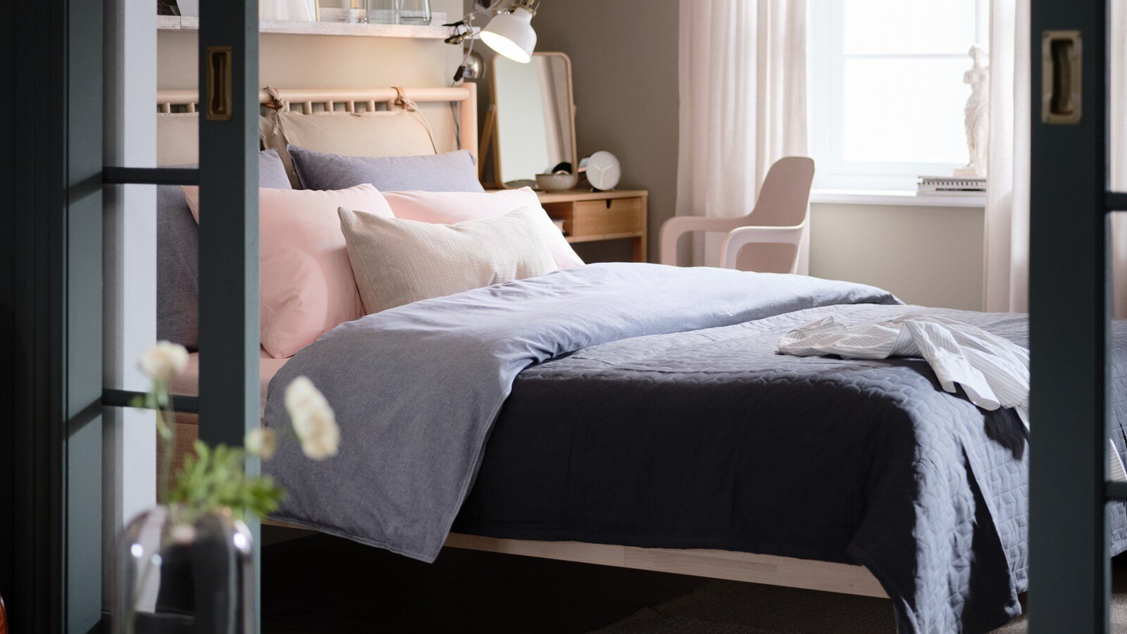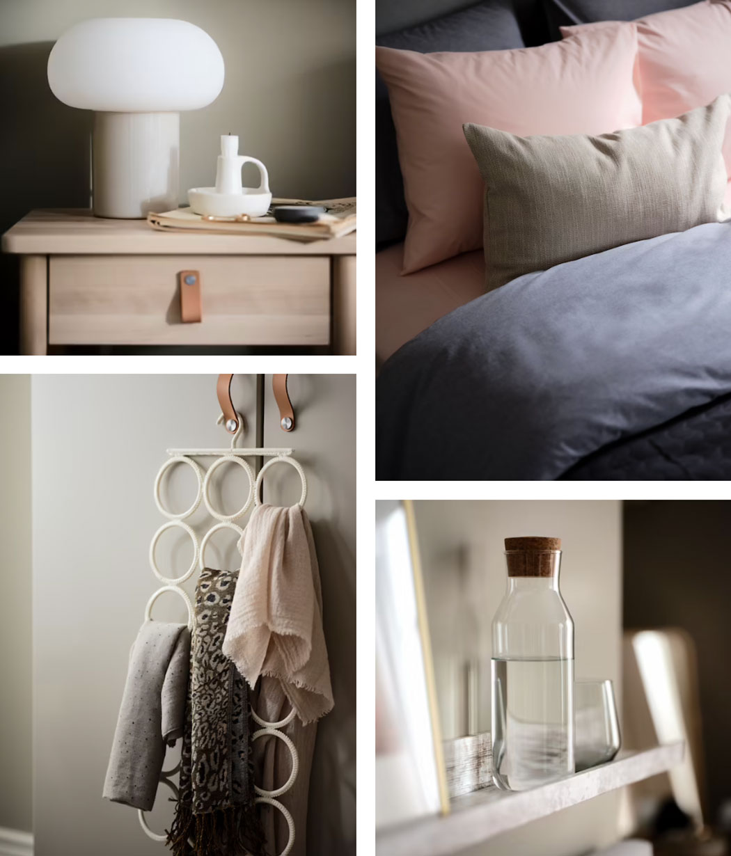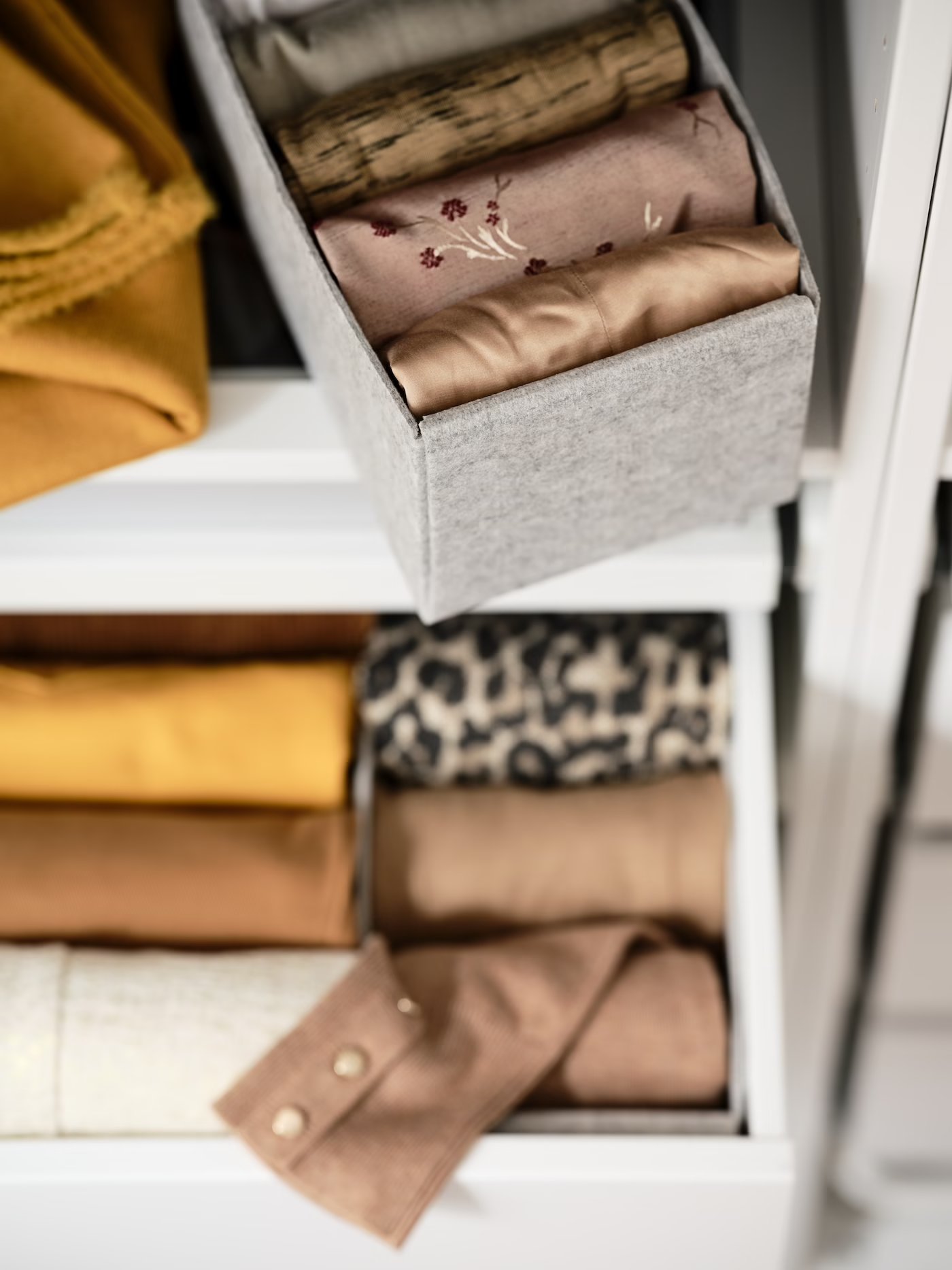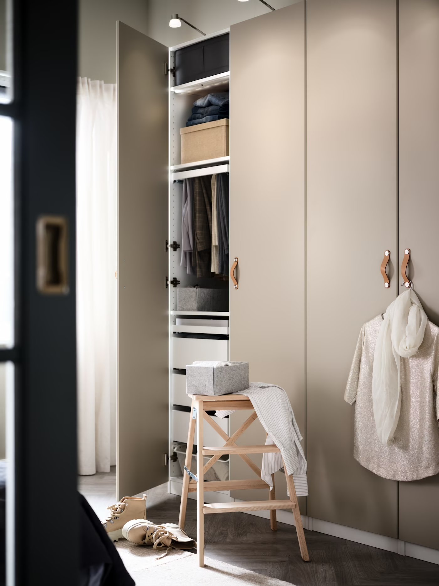 想在小空間擺放大型家具?當然沒問題~選擇和牆壁顏色相配的PAX系統衣櫃,和整體房間佈置巧妙融為一體。衣櫃裡的抽屜、掛衣桿,搭配KOMPLEMENT儲物盒和衣架,能完美收納所有衣物,是時尚愛好者必備的夢幻衣櫃。