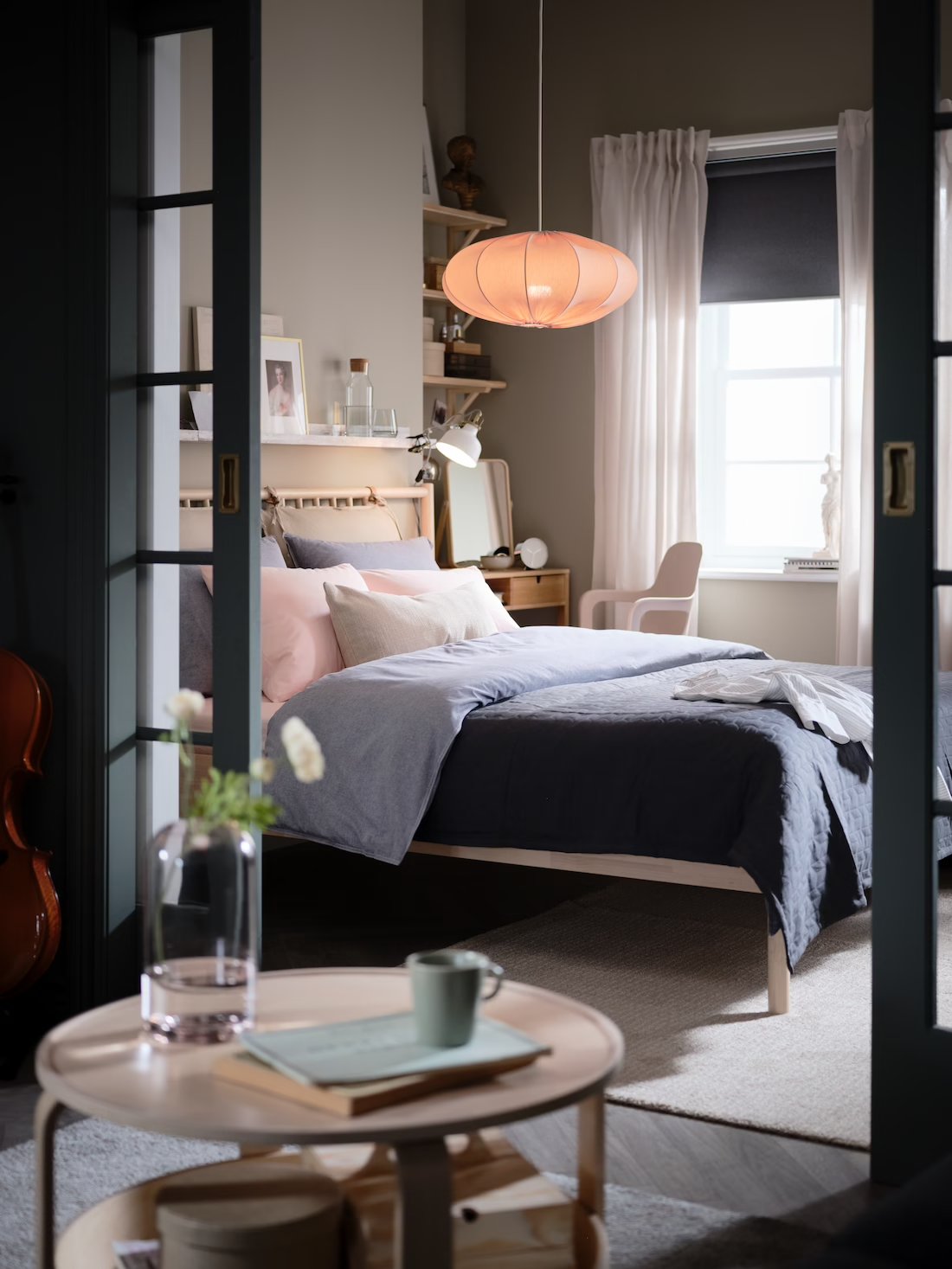 住在小公寓或開放式空間時,試試用顏色來區隔臥室與其他區域創造生活感。混搭柔和的粉色、清爽的藍色和淡色木質家具,為臥室帶來平靜舒適的感受;在視覺上,也能和玻璃門另一面的起居間創造明顯區隔。