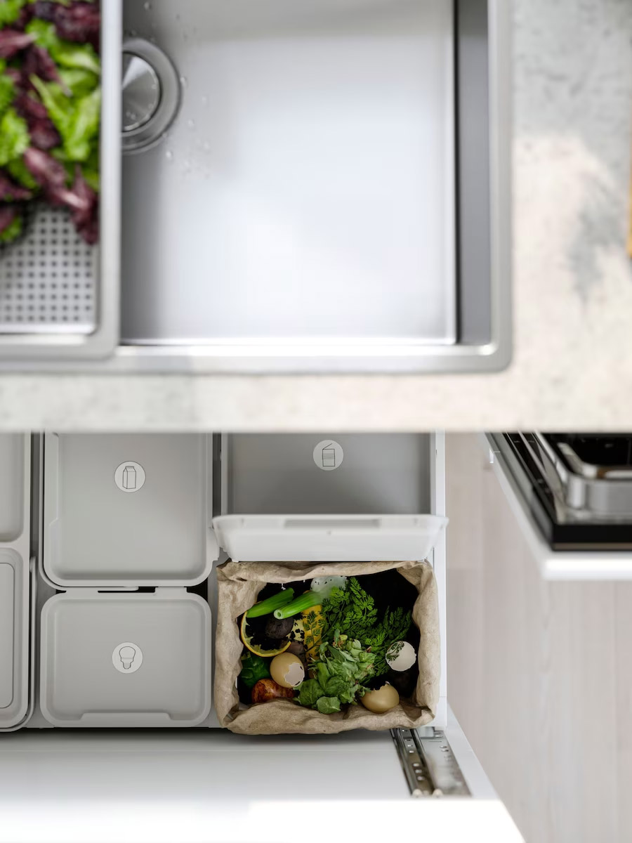 拉開光澤感櫃門,開啟巧妙的收納空間。開門時內部的收納籃會自動拉出,輕鬆瀏覽儲備食材,立刻找到需要的物品。在水槽下方放置垃圾箱,往下看一眼就能檢查,回收變得毫不費力。