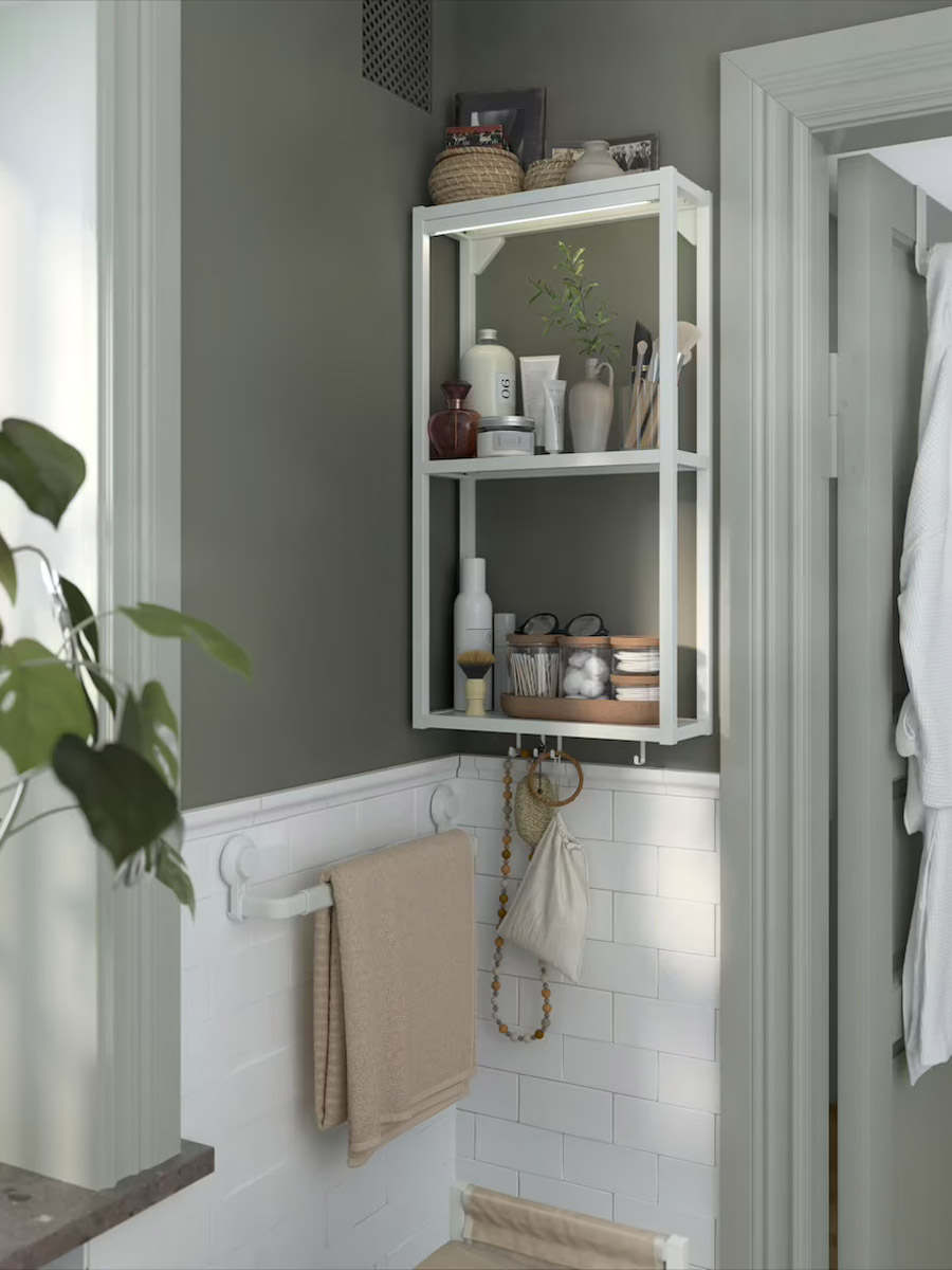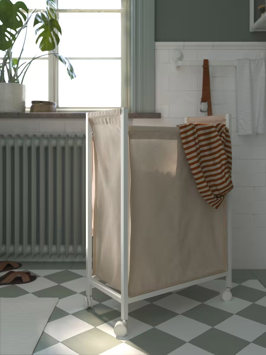 這些節省空間的上牆層架和毛巾架,加上設有活輪的洗衣袋,能令浴室同時擁有固定和靈活彈性的儲物組合。既有固定的地方存放梳洗用品,方便移動的洗衣袋也能收集用過的毛巾。