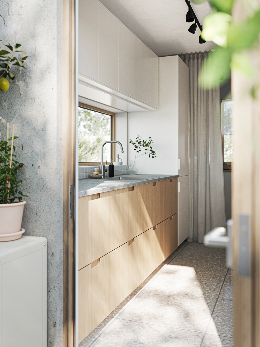 這個通風明亮的廚房功能齊全,而且將空間發揮到極致,絕對是簡約風愛好者的理想之家。恬靜色調與自然材料的組合打造出溫暖乾淨的廚房,完美體現純正的北歐設計美感。