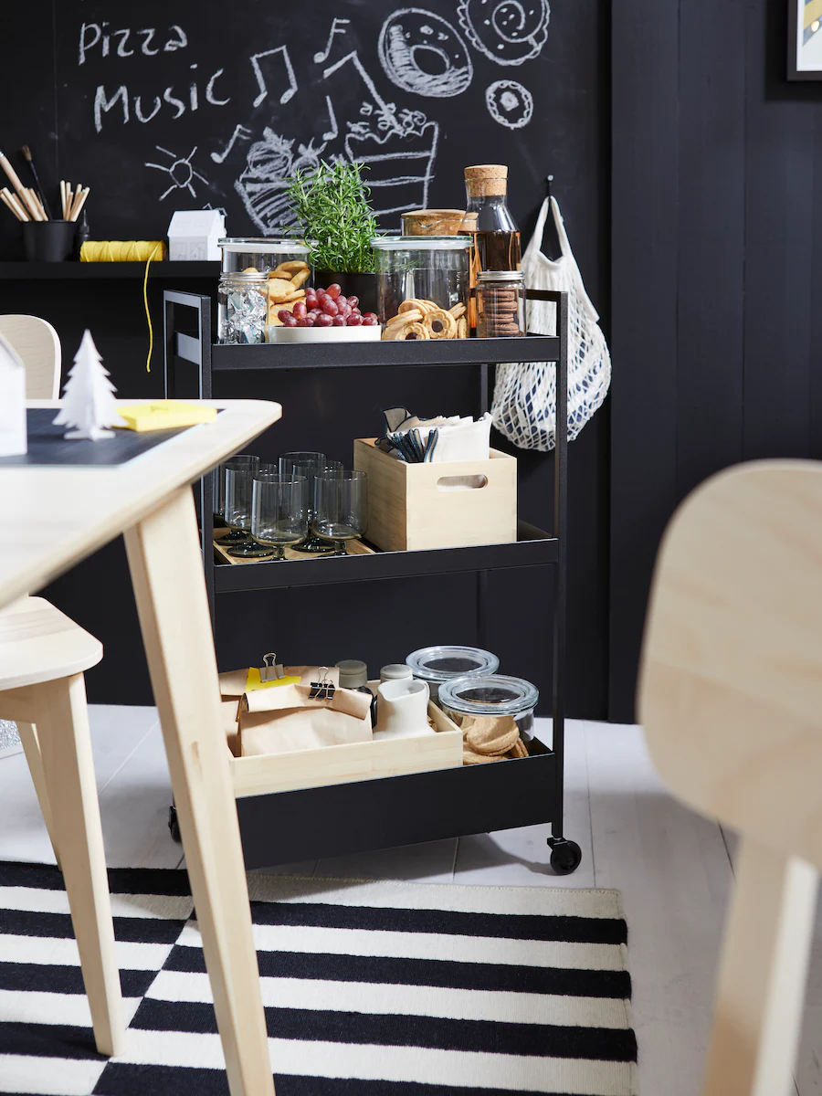 結合黑白色調與溫暖的木質家具,帶來簡約舒適的北歐氛圍。在空間中擺放兩張桌子,呈現咖啡館般的空間配置;搭配淡色木質桌椅和時尚的黑色推車,用來放置餐具和零食。
