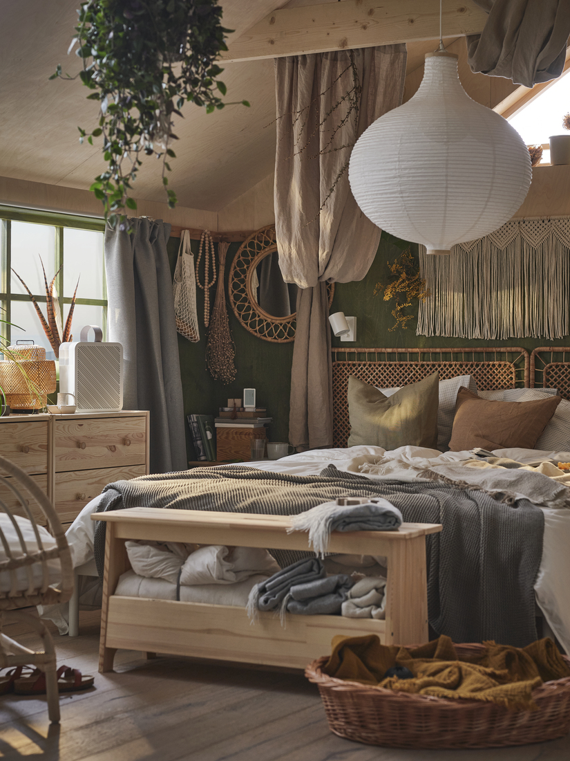 藤製床頭板散發暖意和細緻質感,配上各種柔和色調、深棕色、綠色和藍色的織品,與洋溢田園氣息的綠色牆壁互相映襯。組合配以特大紙質燈罩的吊燈等不同款式的燈具,便能營造平靜寫意的波西米亞風格。