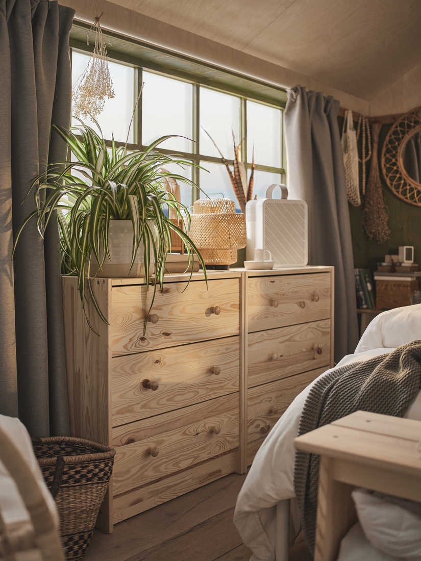 這間小臥室是遠離煩囂的舒適國度,大量植物和自然色調為共用的空間增添寧靜感覺。各式各樣的織品,加上木材和藤等天然材質,不論日夜也讓人感到平靜愜意。