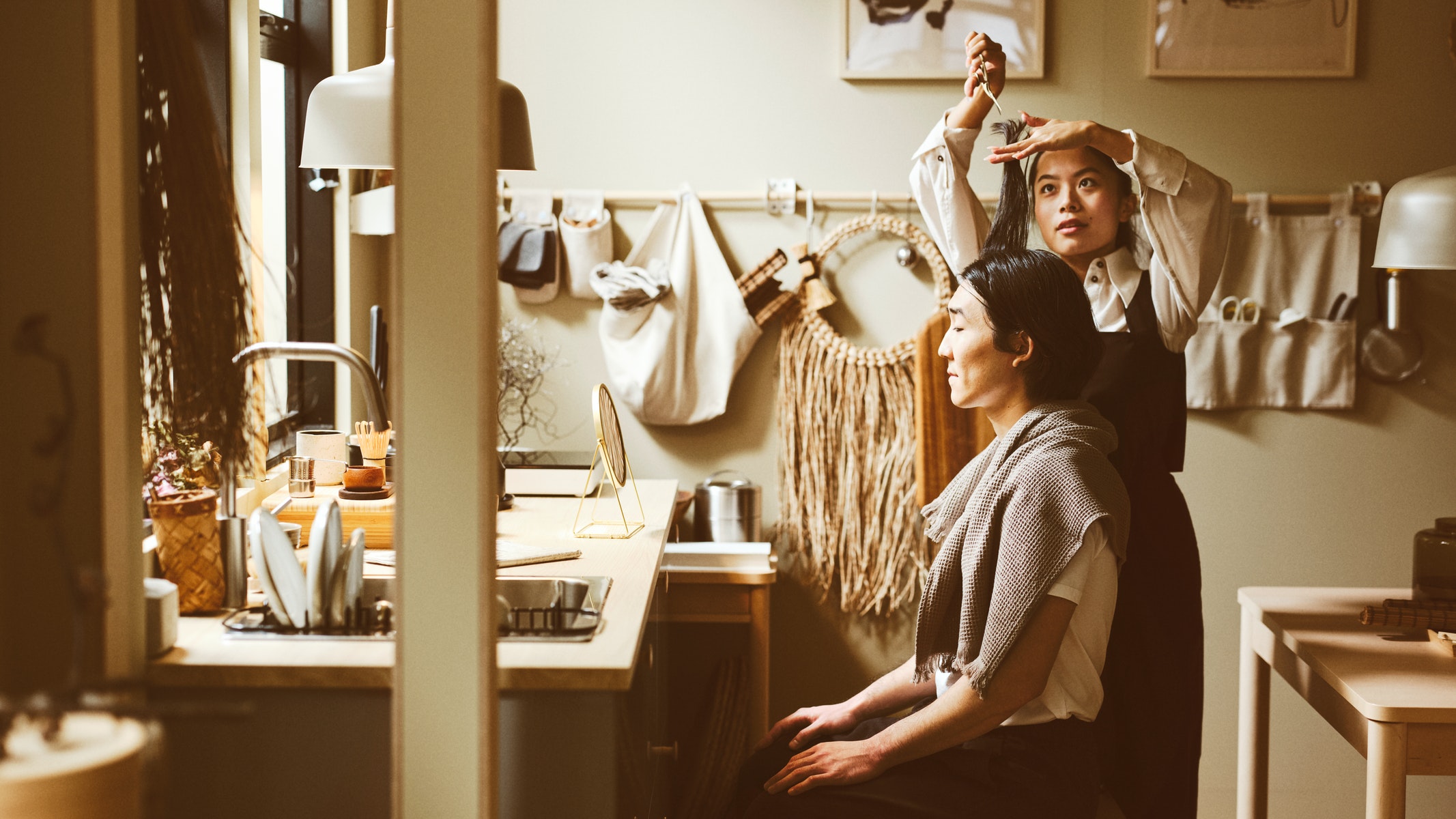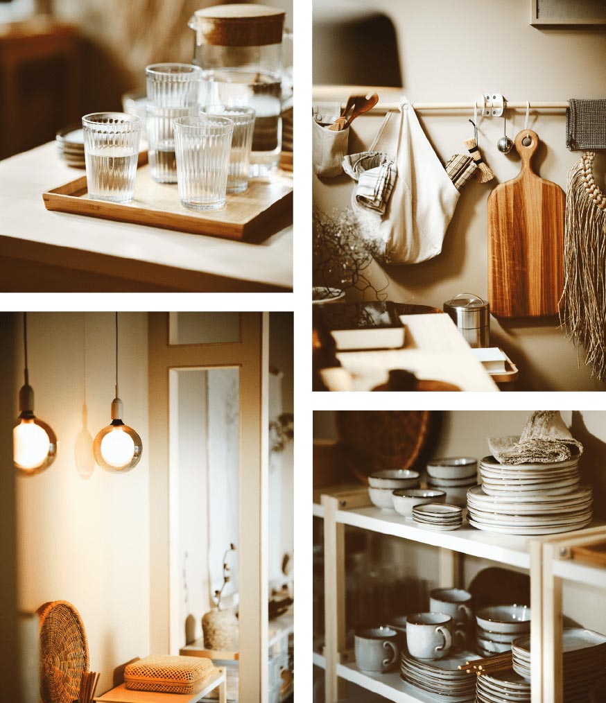 廚房設計非常簡約低調,但牆上的畫作和自然色調卻營造出和諧一致的感覺。這個廚房不但美觀,也十分實用,開放式和封閉式儲物將一切收納妥當。