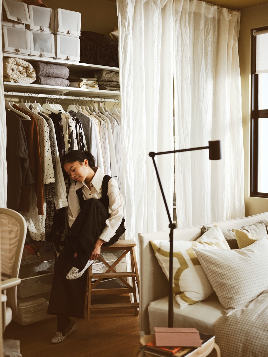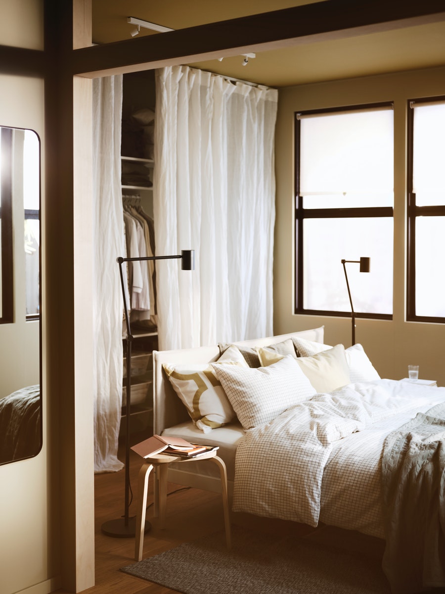 一踏進他們的臥室,一張簡約的床立即映入眼簾。臥室只有三面牆,騰出空間擺放其他物品,而床後還有一條通道,只要拉開布簾,便是井井有條的衣帽間。