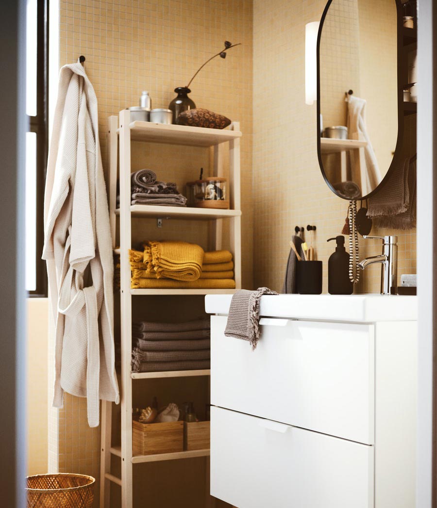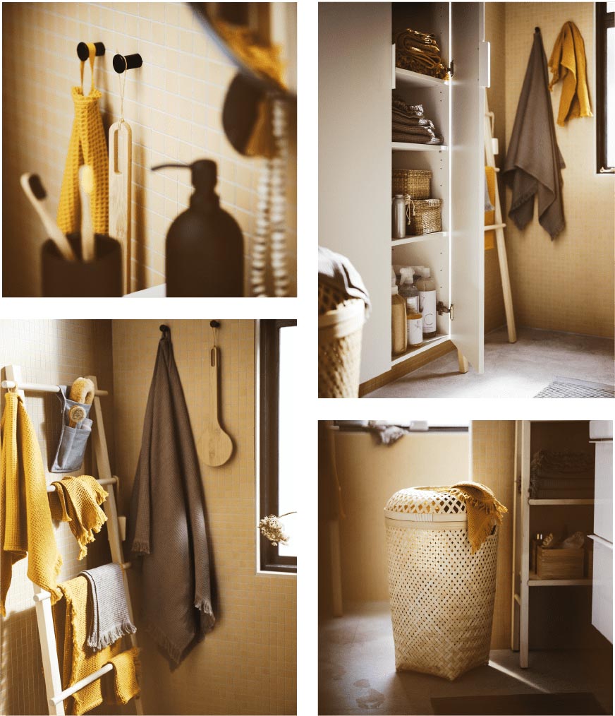 與屋內其他空間一樣,浴室佈置同樣美觀實用。木層架、儲物籃和凹凸格紋毛巾感覺溫馨,而簡潔的白色儲物櫃則將浴室用品、家居清潔用品和備用毛巾收納妥當。
