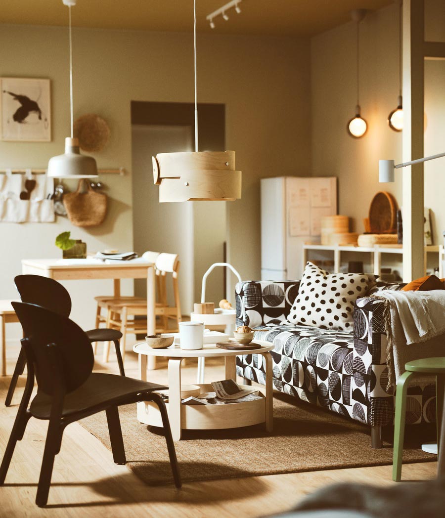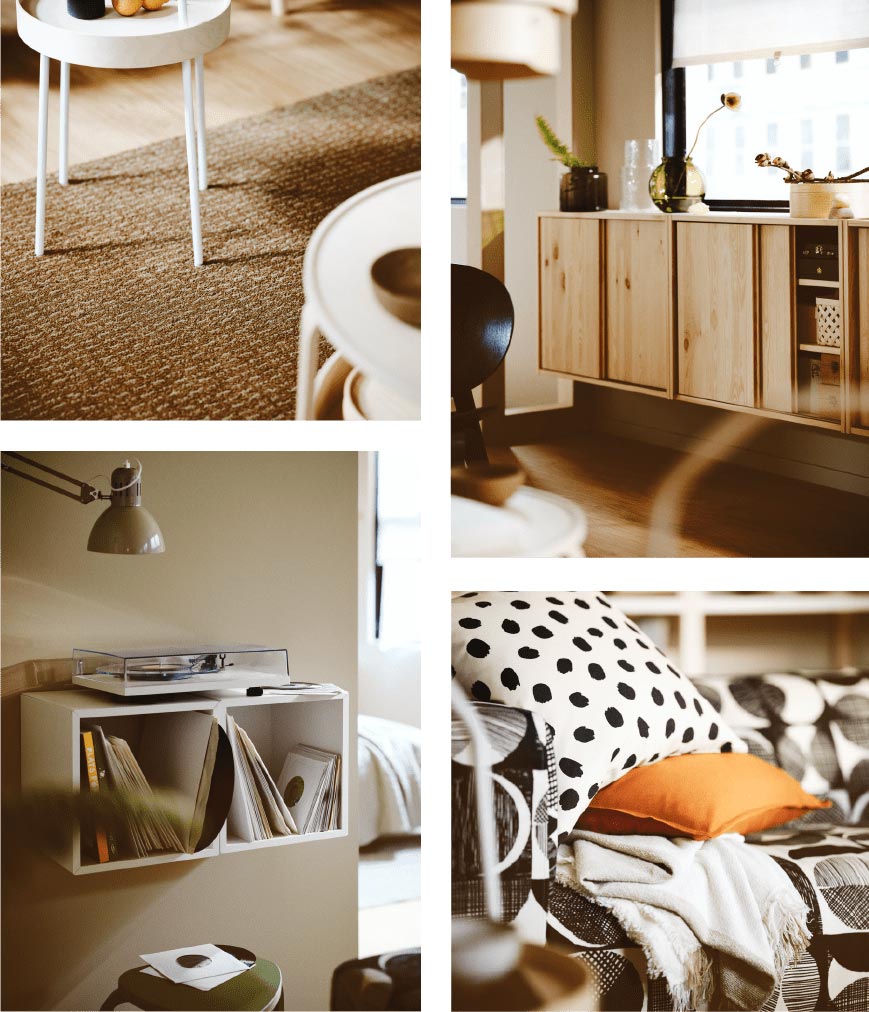圖案奪目的沙發不但是焦點所在,也是與朋友歡度時間的舒適角落。無論是唱片,還是茶几上的美味小食,所需物品伸手可及,難怪下午茶往往變成宵夜。