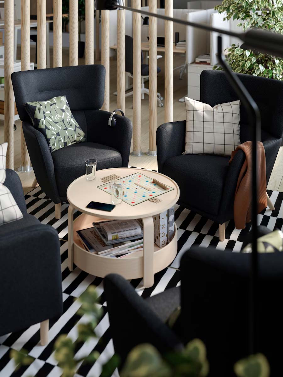 這個舒適空間的配色與辦公室的其他部分相反。主色調是深灰色,搭配靠墊的色彩以及咖啡桌的淺色木質外觀進行點綴。樺木製成的柱子也能強化淺色木材的溫暖質感,這些柱子既能創造隱密感,又不會讓人感到孤立。