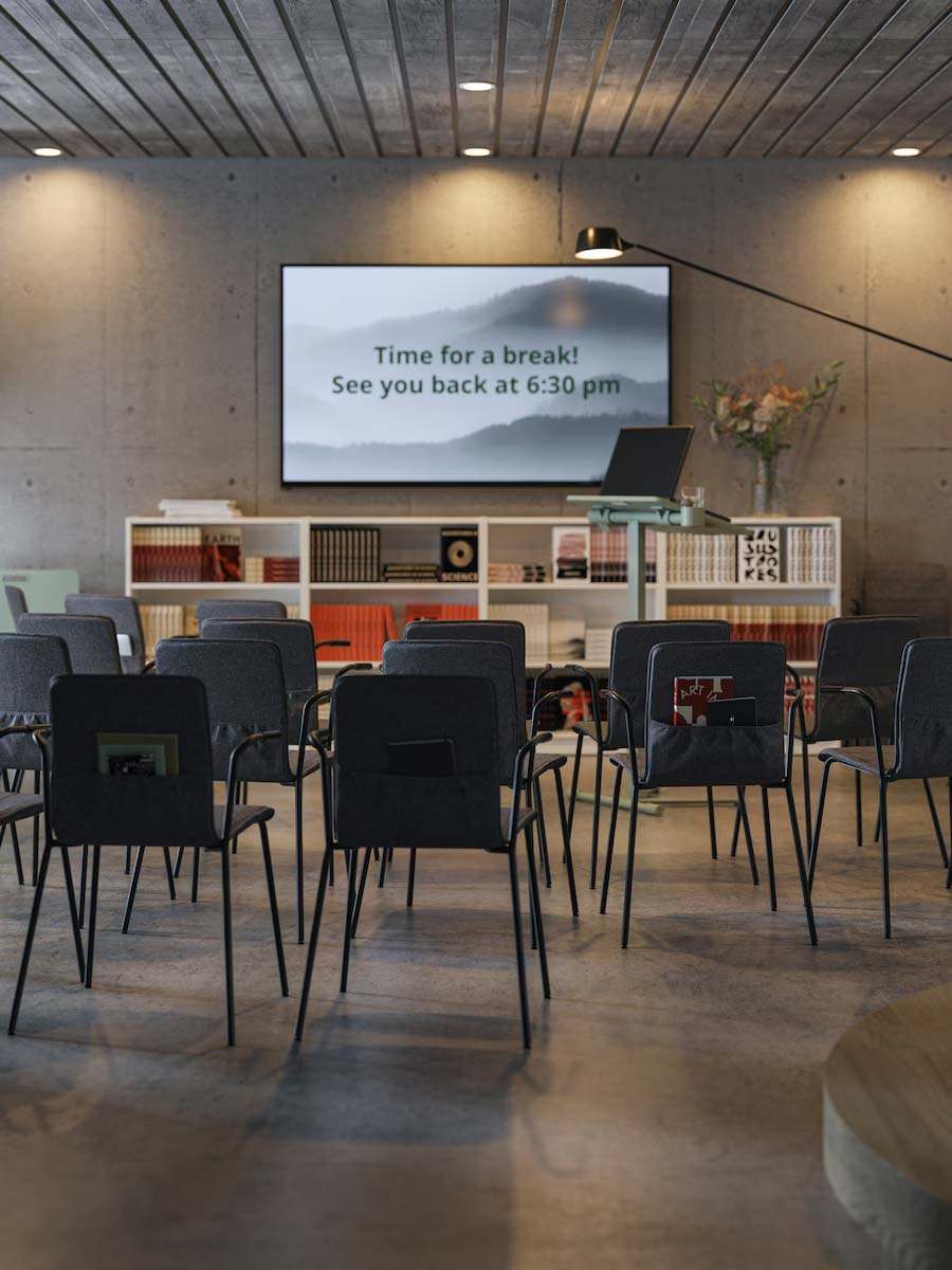 想像一下,有個空間能輕鬆地從一個充滿活力的工作坊轉變為一個吸引人的講堂。在這裡,可堆疊的椅子和移動式支架讓重新改變室內配置變得輕而易舉。這裡空間寬敞的同時又不失親近感,能刺激人們的合作和創意。這是個結合風格與功能性,使每場活動都讓人感到賓至如歸的舞臺。
