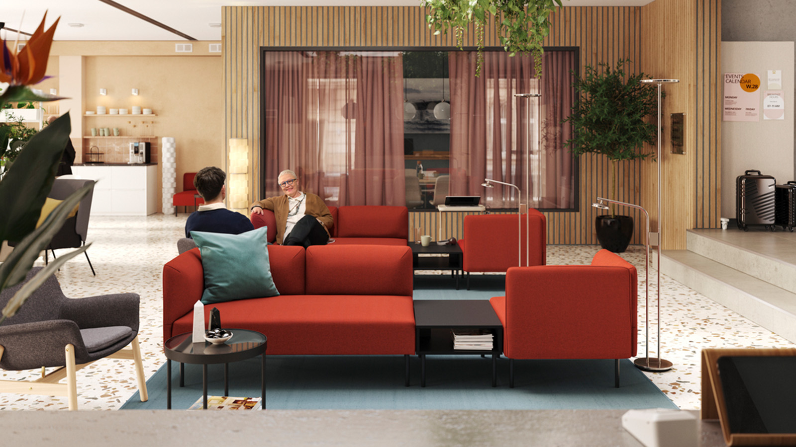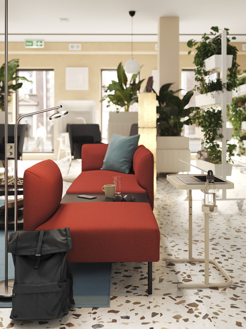 在交錯擺放的 LILLEHEM 沙發區,客人可根據當下需求進行交流,也或者處理自己的手邊工作。調整椅背面向來創造空間多樣性,用邊桌來連接或分隔兩組沙發。