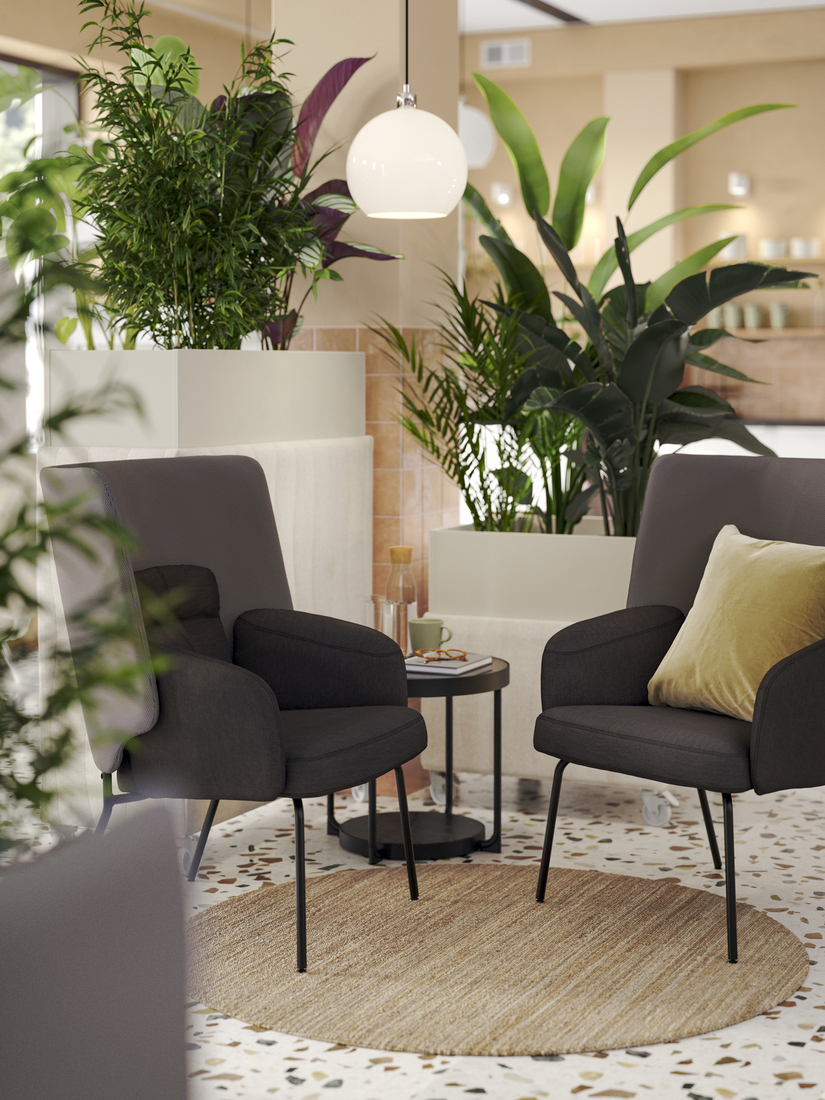 擺放兩張舒適又讓人喜愛的 BINGSTA 高背扶手椅,可以隨時重新更換位置來創造想要的隱私感。在椅子周圍增添一些較高的裝飾元素,營造房中房的感受。大型植物是很好的選擇,在塵囂中創造一片平靜小綠洲。