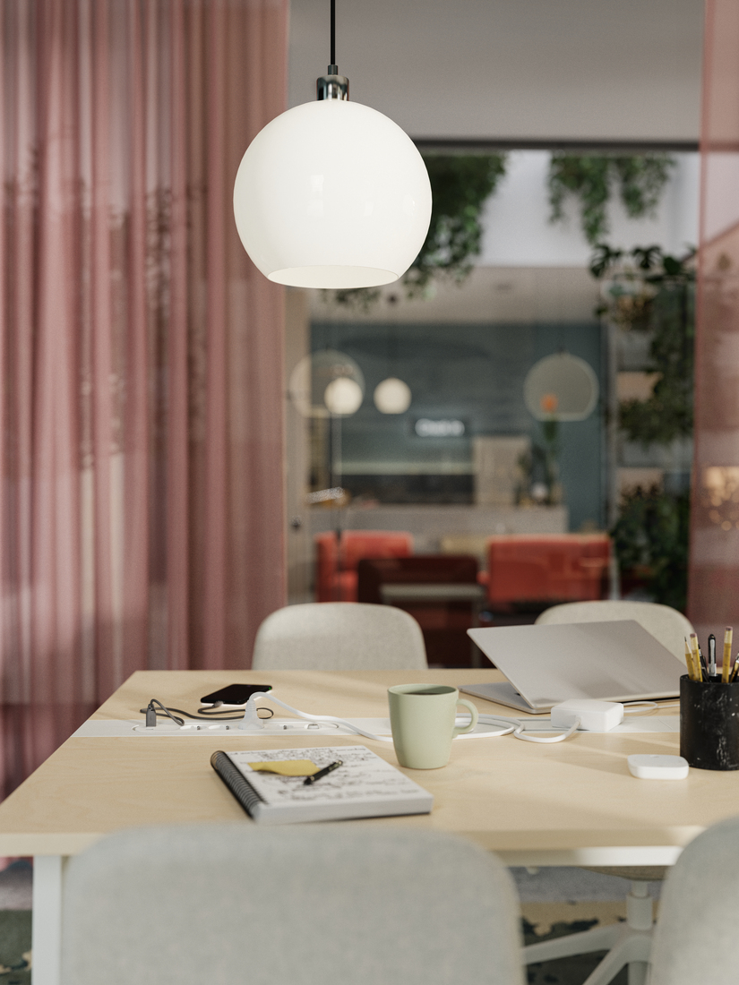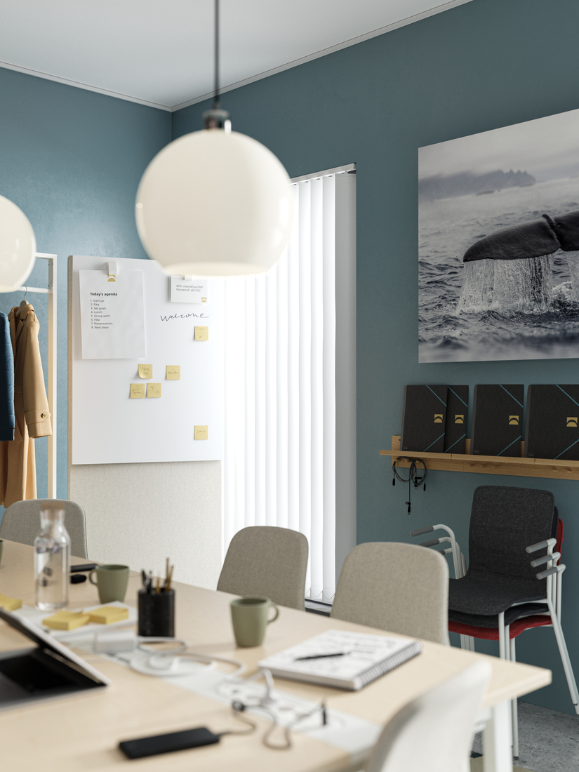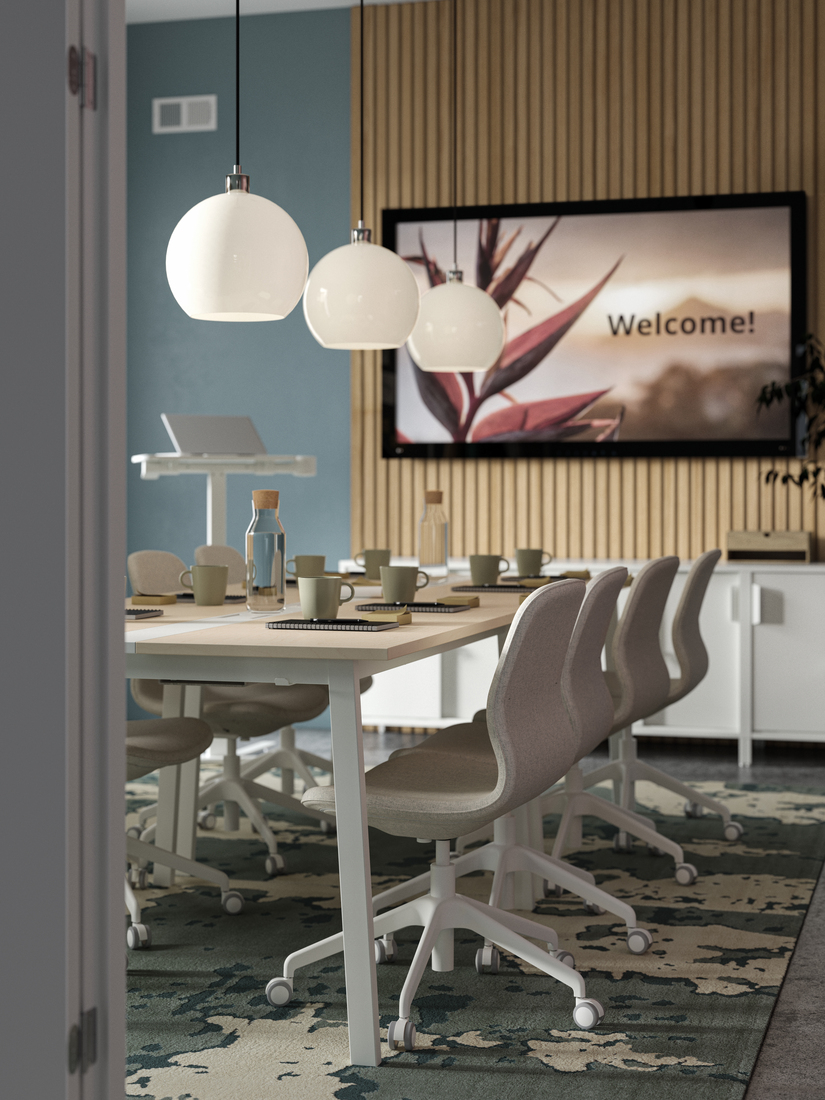 一扇大窗連結各個空間,會議室就不會顯得孤立。用布幕增強隱私,協助工作聚焦。在這兩個區域使用風格和顏色相搭配或相同的家具,例如 JÄRPLIDEN 吊燈和 MITTZON 家具。