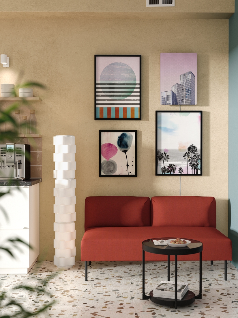 使用酒吧常見的 STENSELE 吧台桌和 JANINGE 椅,創造充足坐站空間,牆面藝術作品和音樂增添活潑氣氛,吸引人交流小聊。無論客人是在工作之餘放鬆、或者開始享受長假,都能在這盡情享受咖啡和美味小食。