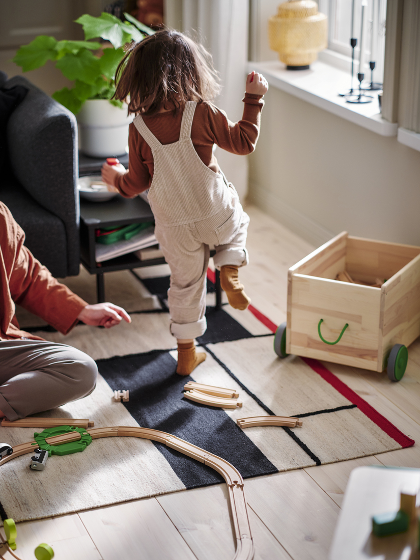 即使是小空間,一樣能全身動起來,一起玩得開心。擺放織品,例如柔軟的靠枕(試試可愛俏皮的 ODDNY 靠枕套)和 VALLKRASSING 萬用毯,增添舒適感。手工編織的 RASTPLATS 羊毛地毯,把地板變得柔軟,和孩子一起坐在地毯上,開心等待火車進站!