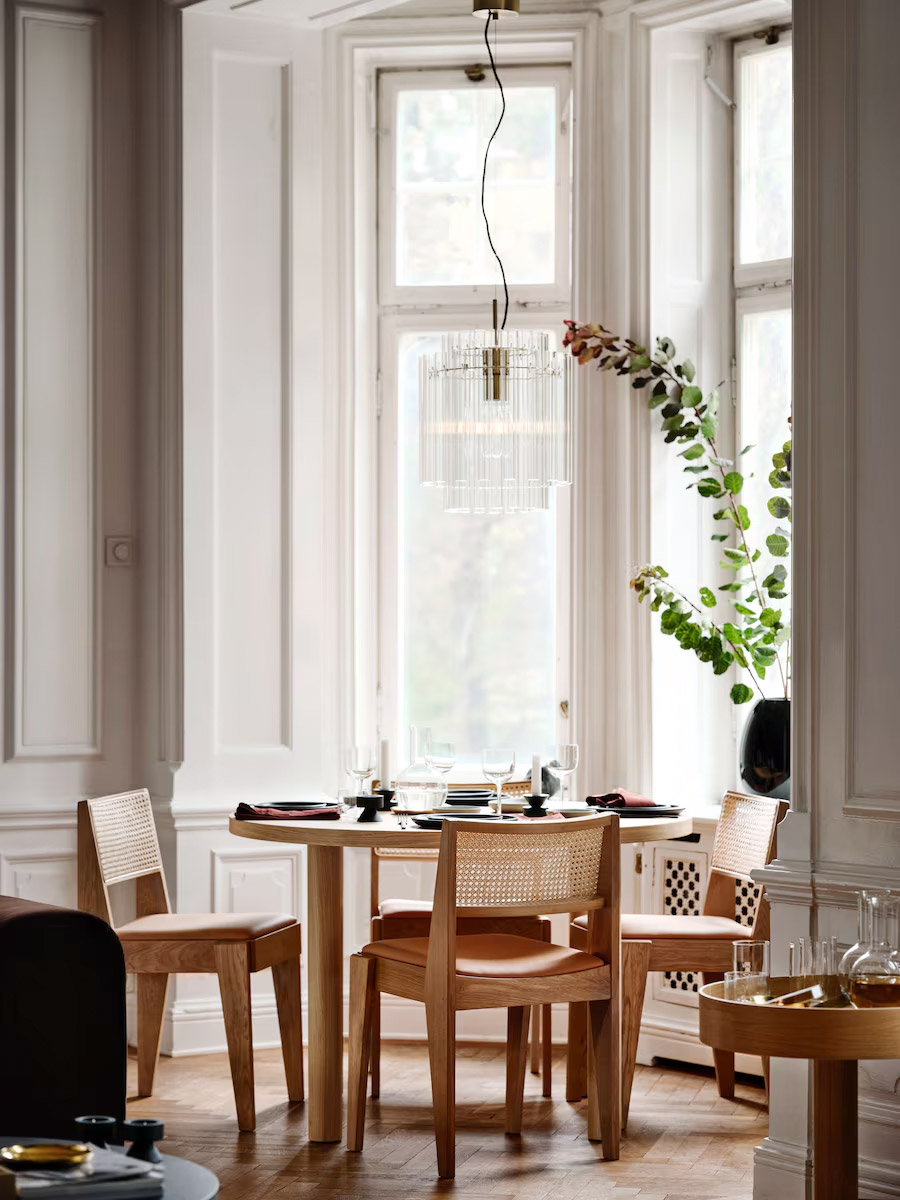 實心橡木外框、天然藤織椅背、全染牛皮座椅,構成美妙三維度,面面俱到的工藝裡,確保了獨步當代的品質和耐用度。穩健色調為地,瑩亮的玻璃吊燈為頂,打造出天地有序的全景佈局。