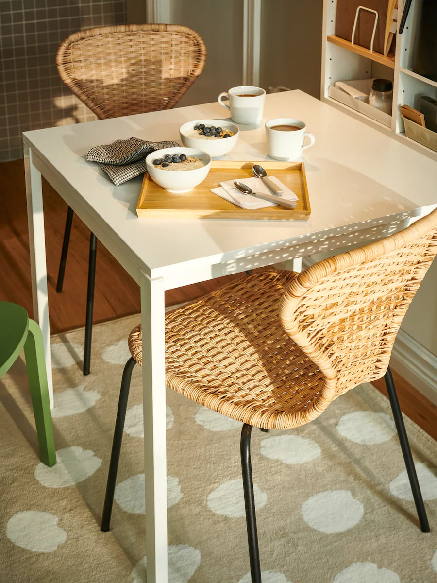 即使空間有限,只要使用細腿家具,就能為早餐區營造開揚感覺。藤椅搭配其他天然材質,加上四周的淺色和白色家具,形成和諧悅目的對比。
