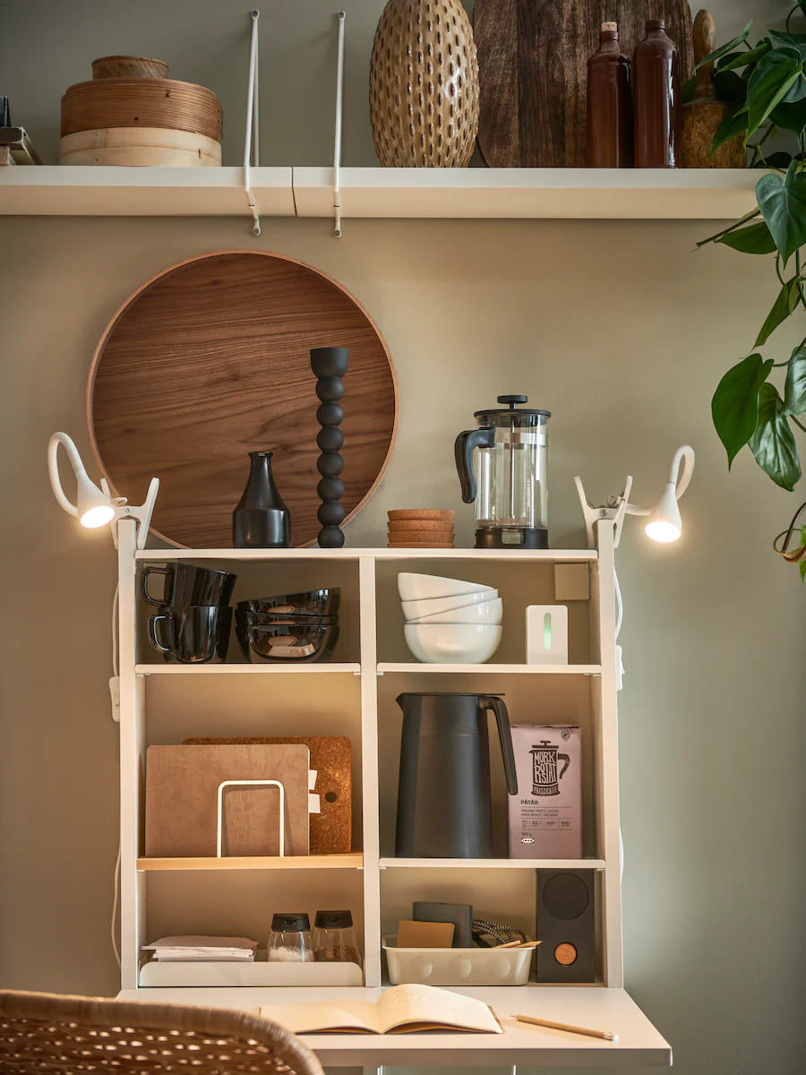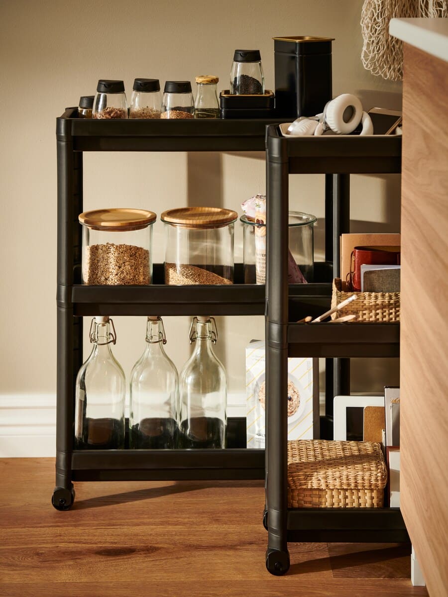 除了與廚房的淺色木材和表面形成美妙對比,推車也是收納或擺放餐具的好幫手。再多加一輛推車,便擁有可移動的居家工作用品收納站。