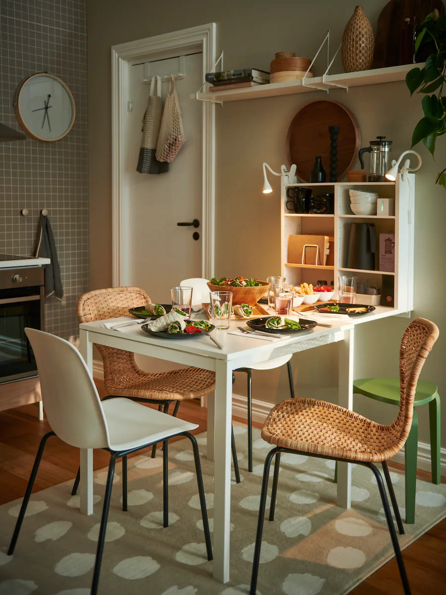 上牆式折疊桌加上黑色、白色和自然色調的配件,交織出一致的奪目風格,而且附有封密式收納空間,方便擺放餐具。